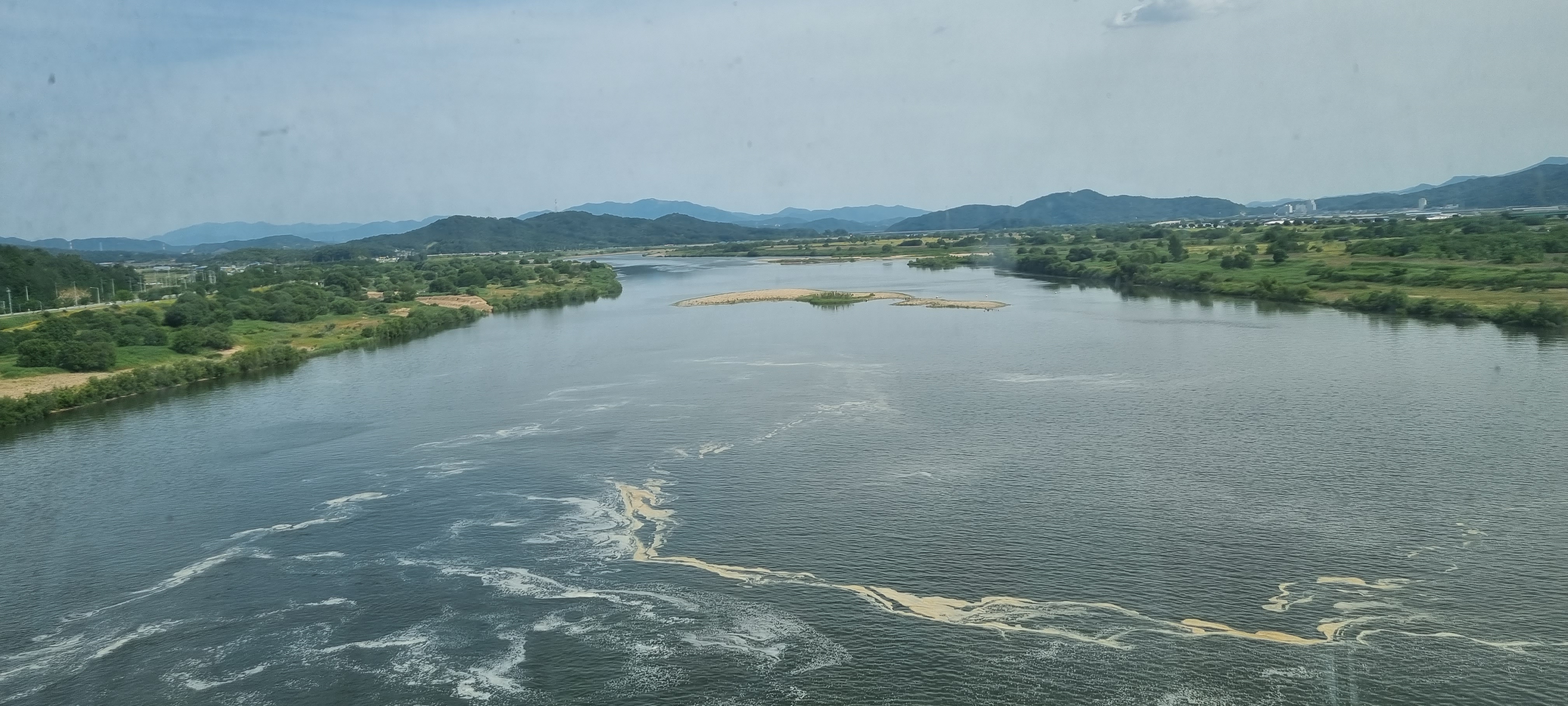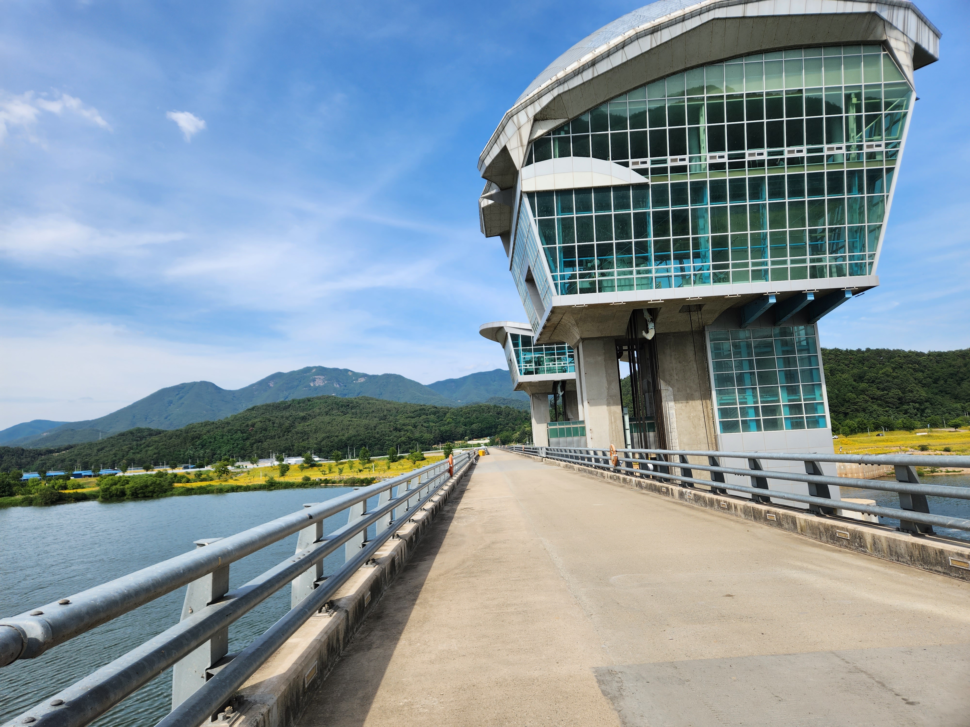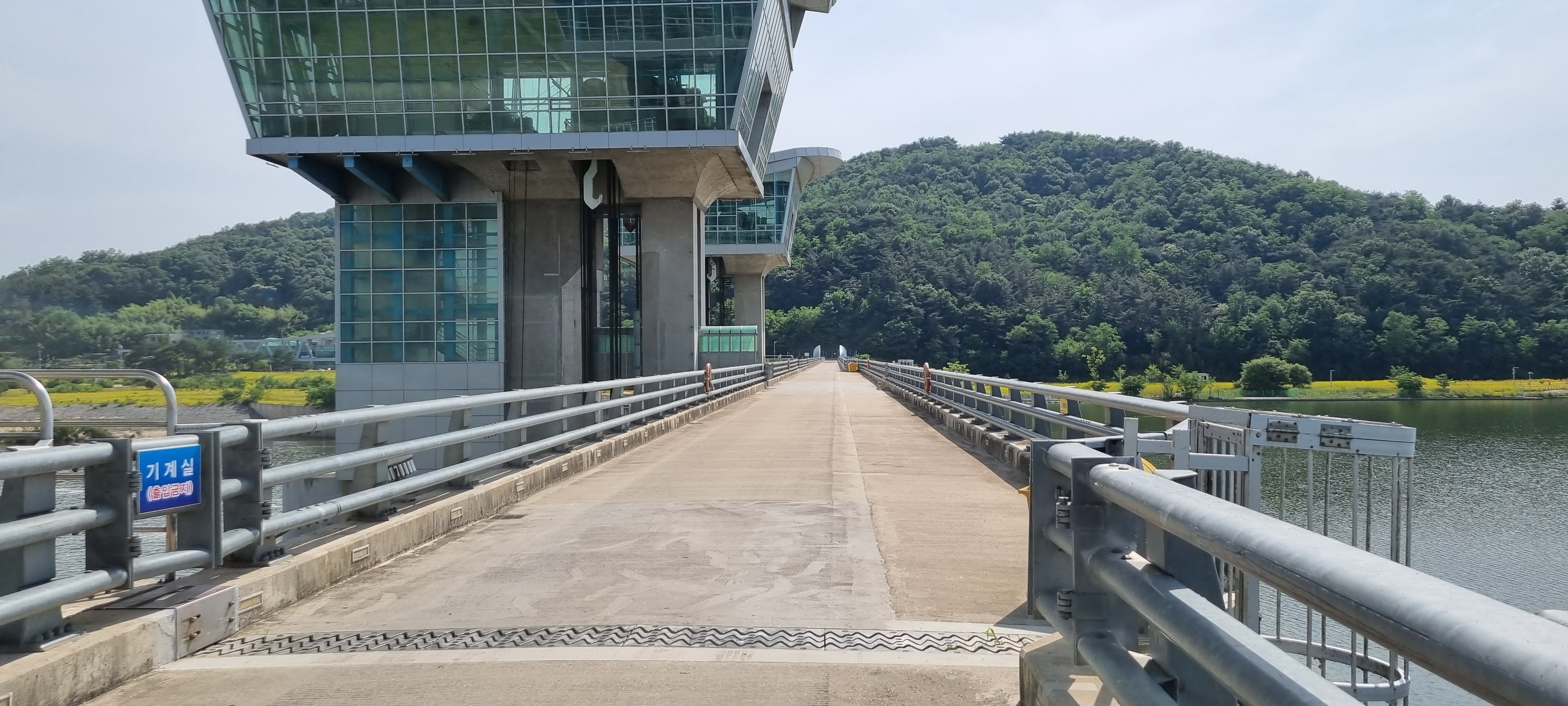 15시29분 구미보에 이르렀습니다. 일선교를 지나자 강 건너 오른쪽 먼발치로 그동안 몇 번 오른 해발 976m의 늠름한 금오산이 보여 반가웠습니다. 구미의 금오산은 야은 길재선생이 머물던 명산으로, 『금오신화』의 저자인 매월당 김시습 선생이 머물던 경주의 금오산과는 다른 산입니다. 일선교를 지나 신림제로 올라서자 쭉 뻗어 나가는 제방이 꽤 길게 보였습니다. 한 낮의 기온이 섭씨 29도로 치솟아 그늘이 거의 없는 제방길을 장시간 계속해서 걷고 나자 시원한 곳에서 쉬어가고 싶은 마음이 절로 일었습니다. 대다수의 가로수들이 아직은 다 자란 것이 아니어서 제대로 그늘을 만들지 못해 더욱 그러했습니다. 해평파크골프장을 지나 구미보를 건너면서 낙동강 강바람을 맞았습니다.