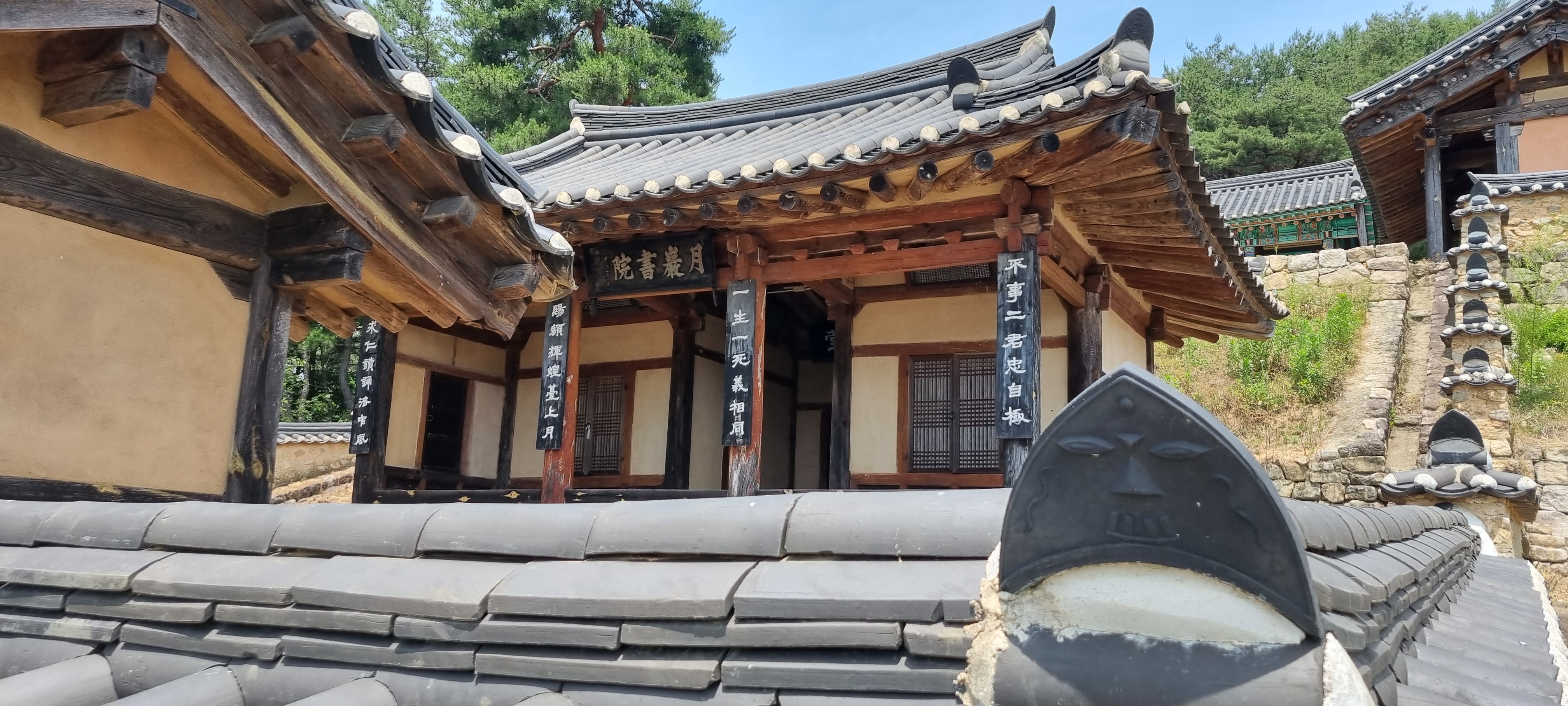 조선조 인조 8년인 1630년에 지방 유림의 공의로 창건된 월암서원은 구미시 도개면 월암리에 자리하고 있습니다. 선산이 배출한 농암(籠巖) 김주(金澍) , 단계(丹溪) 하위지(河緯地) , 경은(耕隱) 이맹전(李孟專) 의 학문과 덕행을 추모하기 위하여 창건된 이 건물이 서원으로 승격된 것은 숙종 20년인 1694년의 일입니다. 1868년 대원군의 서원철폐로 훼철된 서원 터에 1960년 정자를 세웠고 2001년에 복원해 고유제를 올렸다고 ‘월암서원’ 비문은 전하고 있습니다. 이 서원을 대표하는 강당인 구인당(求仁堂)은 가운데 마루와 양쪽에 공부방이 배치되어 있는데 규모가 작아 학생들이 많지 않았을 것 같습니다. 뒤쪽 축대 위에 자리한 사당은 문짝이 모두 청색으로 칠해져 있어 눈길을 끌었습니다.