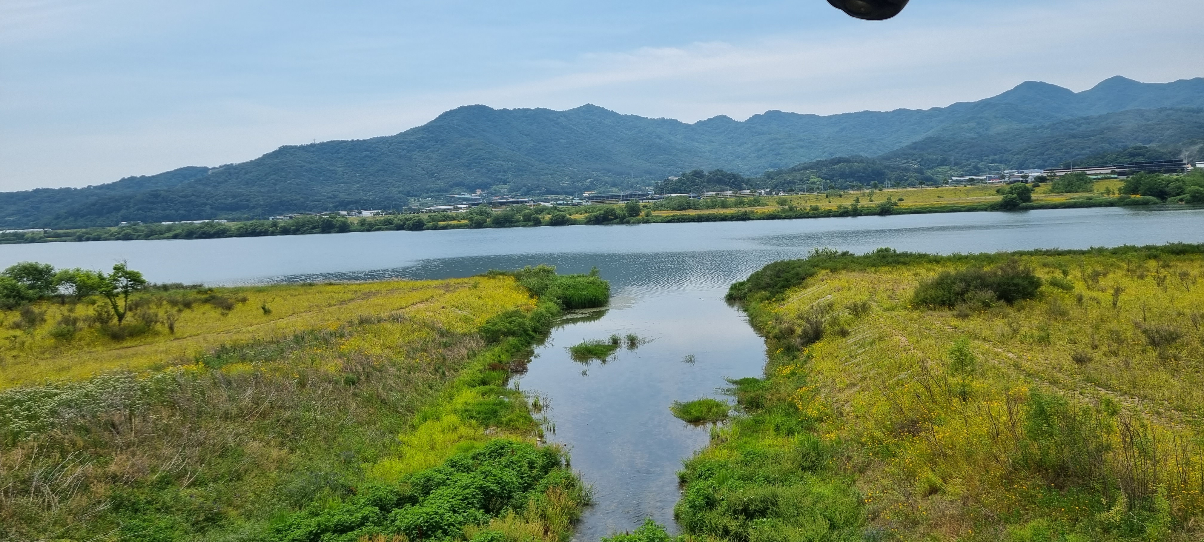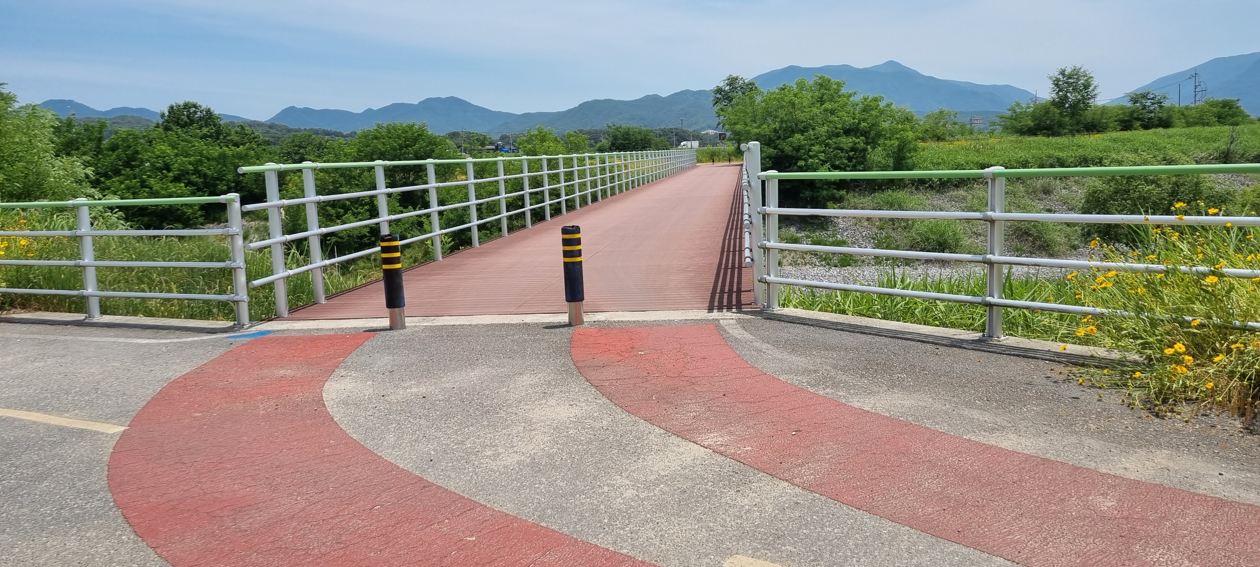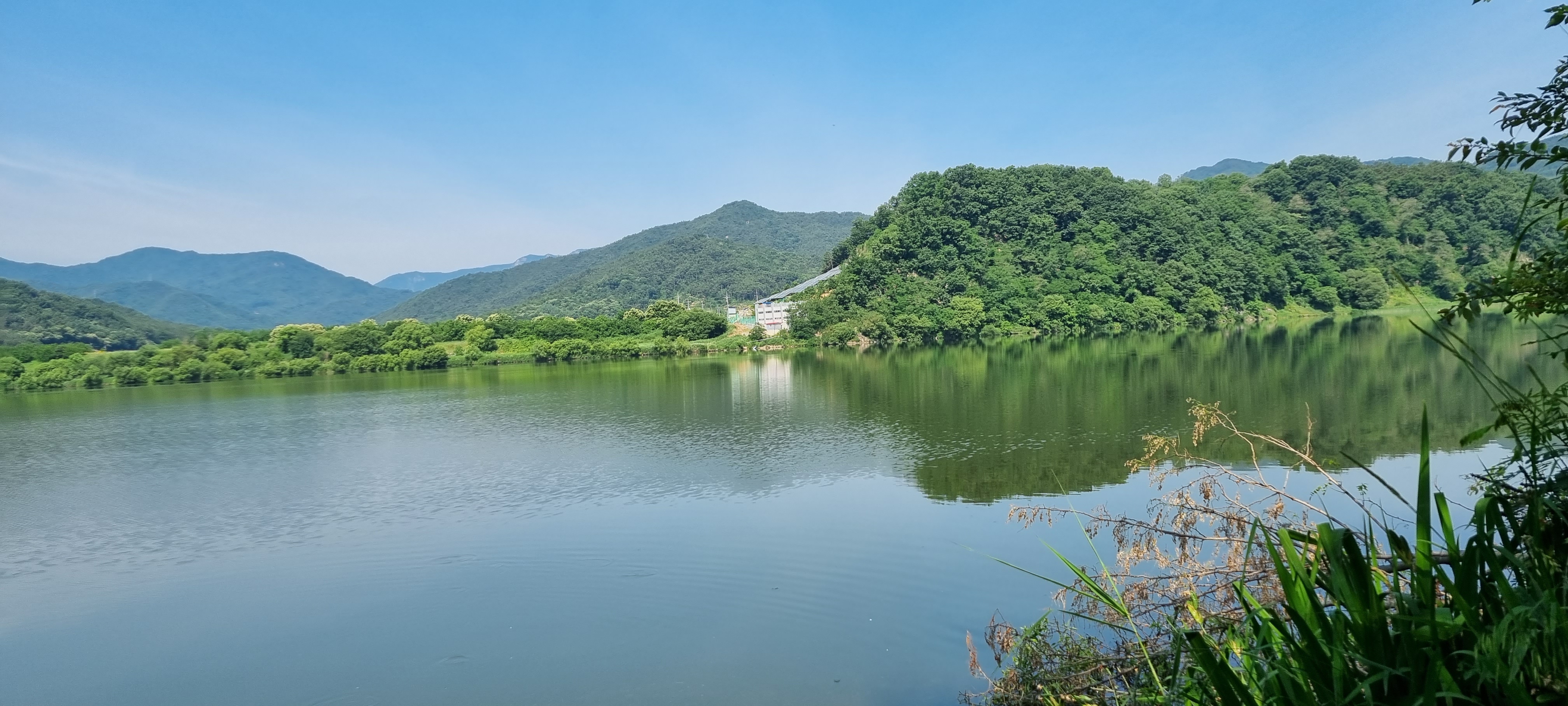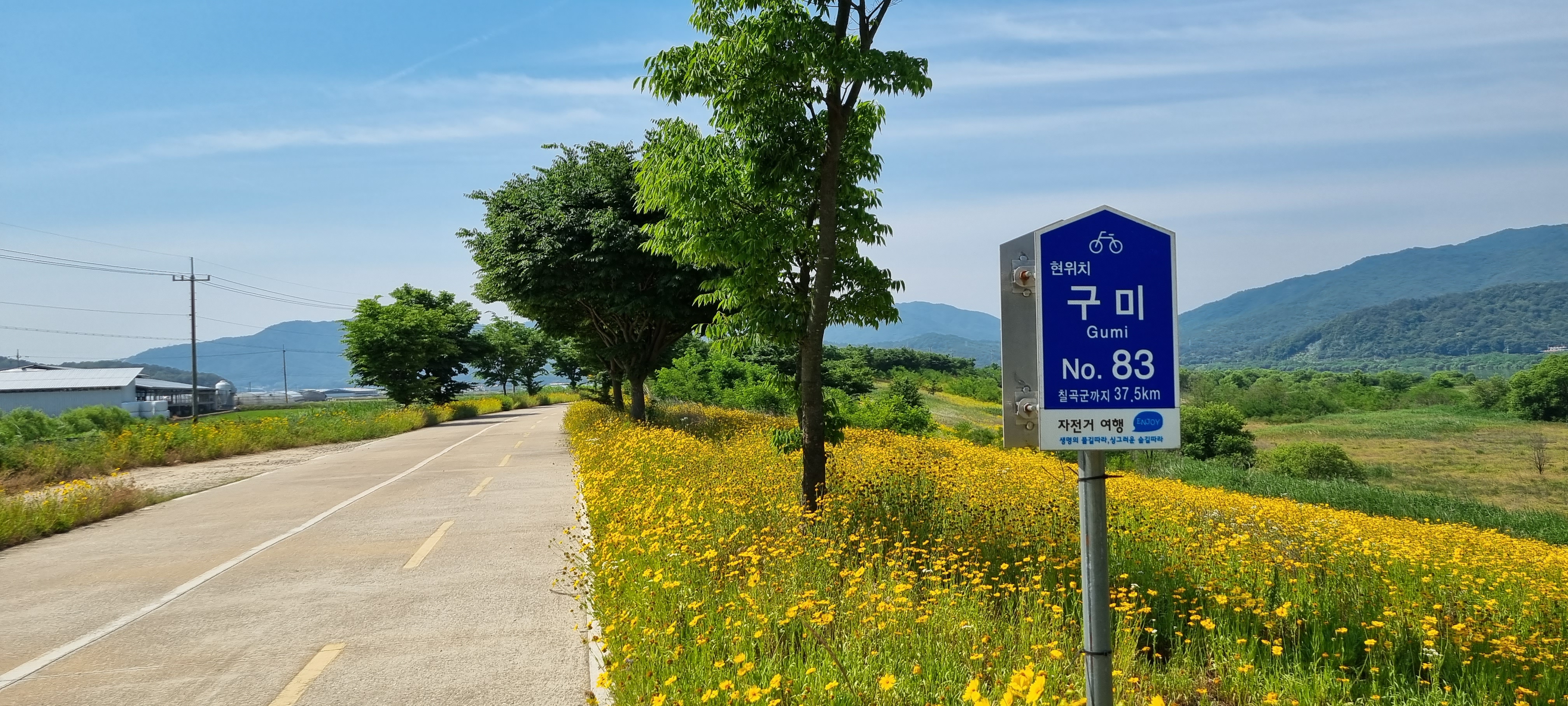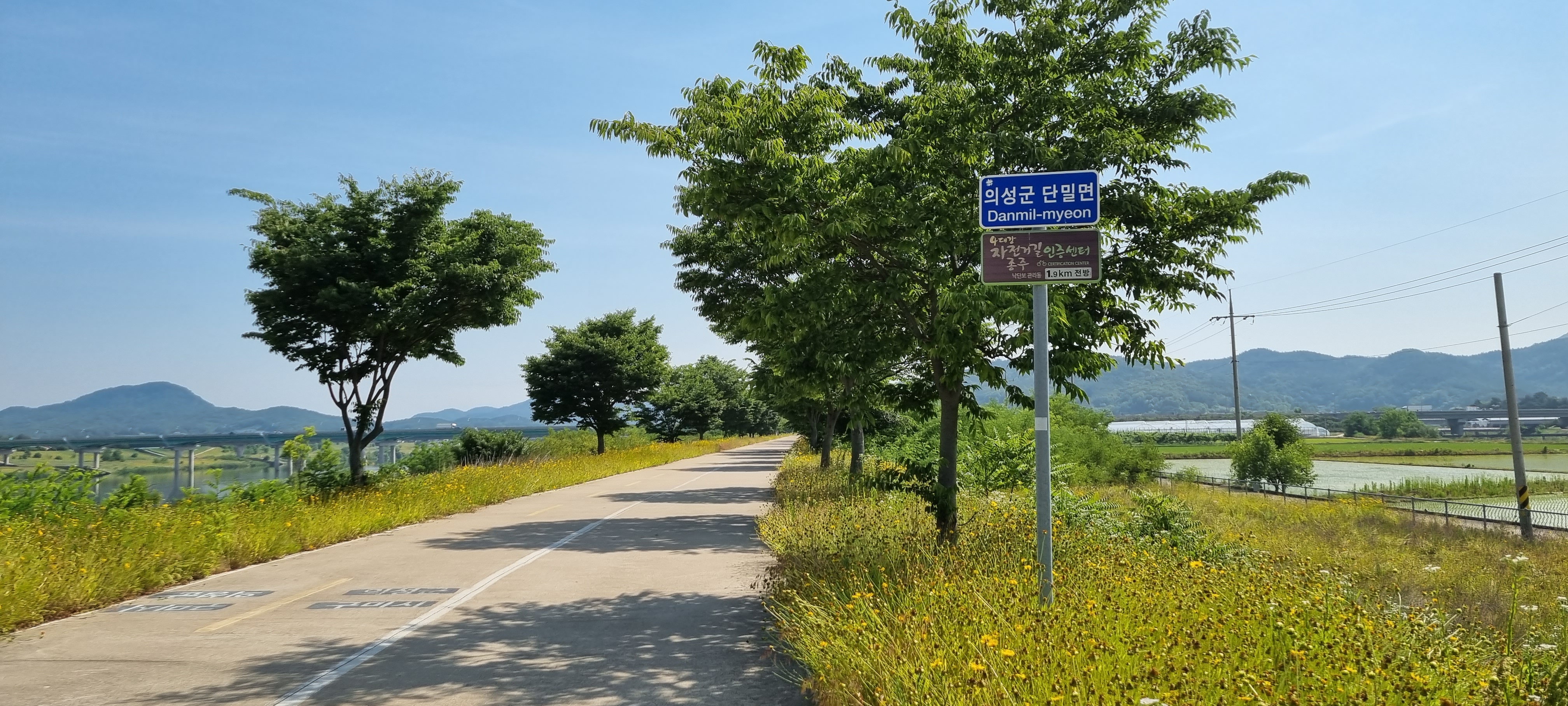 9시16분 낙동강의성휴게소(하행)를 출발했습니다. 이 휴게소 북단의 ‘언약의 장소’ 소공원(?)에서 서쪽으로 나 있는 야산의 호젓한 산길로 들어섰습니다. 경운기가 다닐만한 넓은 산길을 따라 내려가 볏모가 가지런히 이식된 넓은 들판을 지났습니다. 휴게소 출발 20분이 지나 올라선 가산제 둑방 길에서 의성군단밀면과 구미시도개면 경계점을 확인하고 낙동강 좌안의 하천부지로 내려가자 진노랑의 금계국 꽃이 활짝 피어 마치 화원(花原)에 들어선 듯했습니다. 강가로 다가가 잔잔히 흐르는 낙동강의 물흐름을 카메라에 옮겨 담은 후 다시 제방길로 올라서 남진했습니다. 가산리양수장의 철망에 걸려 있는 “개자식아!!! 쳐 먹고 싶냐!”라는 낙서를 보고 증오감에 사로잡힌 정신이상자가 이처럼 평온한 시골에도 있나 싶어 씁쓰레했습니다. 월림제 제방길로 들어선 지 얼마 후 2층 양옥의 단아한 독채 건물을 지나면서 생각한 것은 낙동강의 전망처로 이만한 집이 따로 있겠나 하는 것이었습니다.