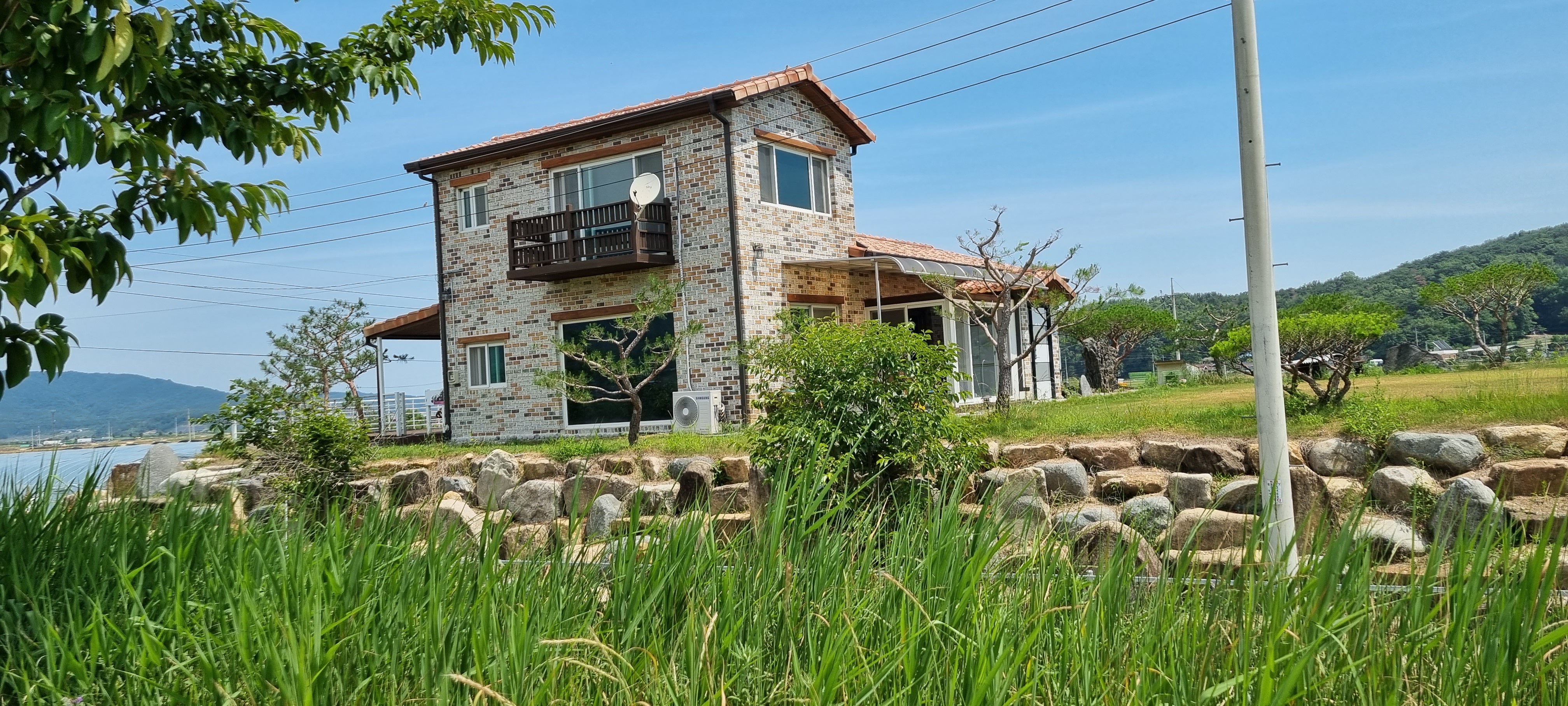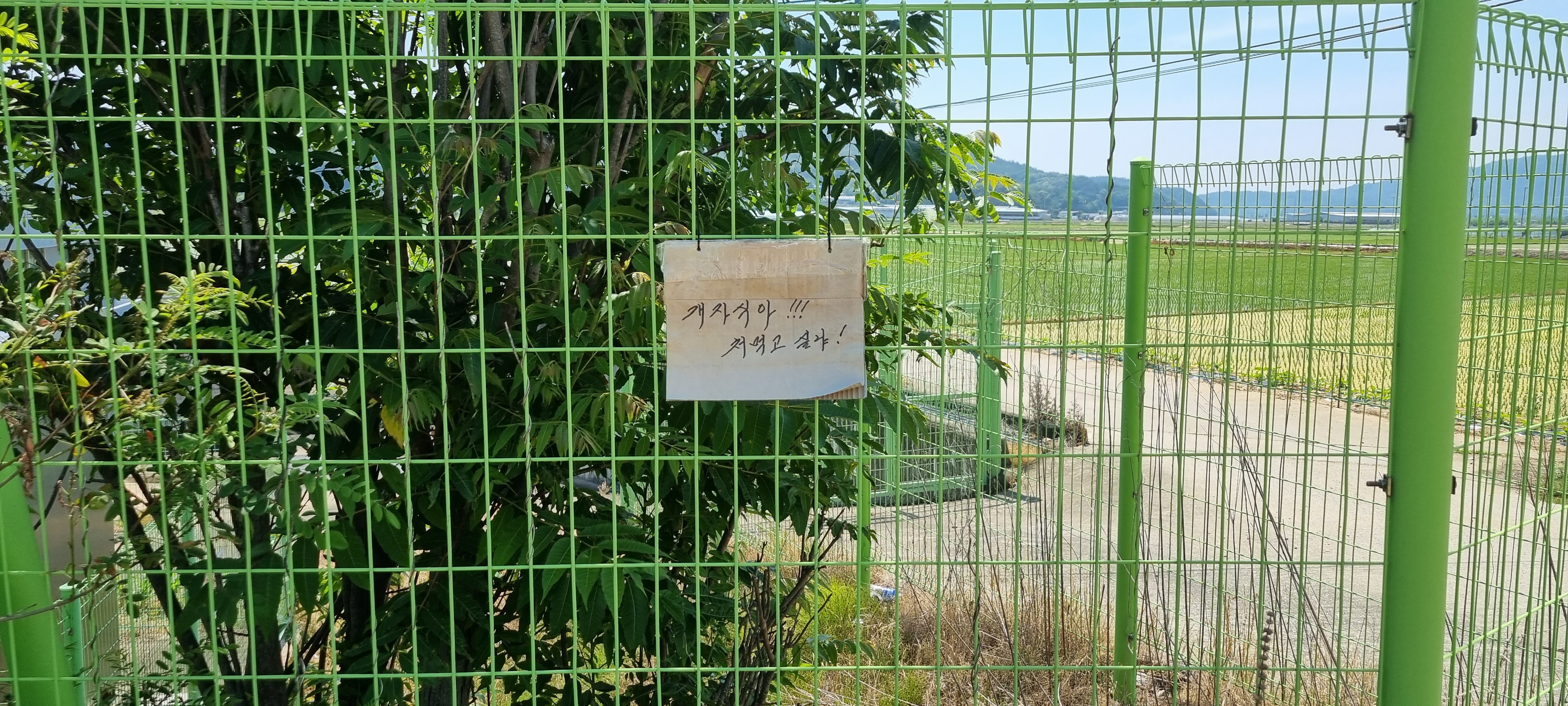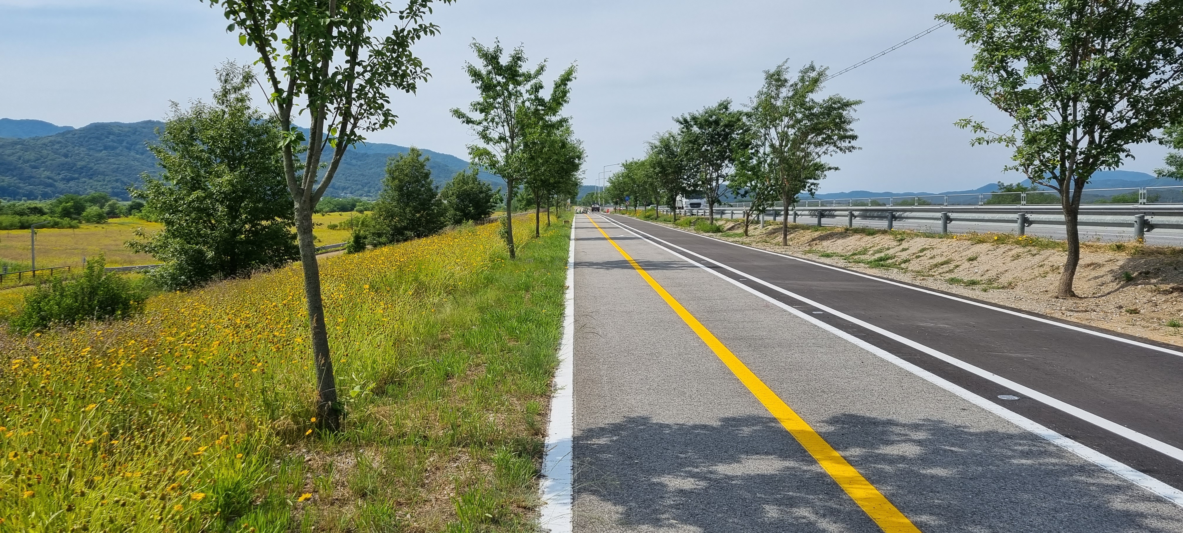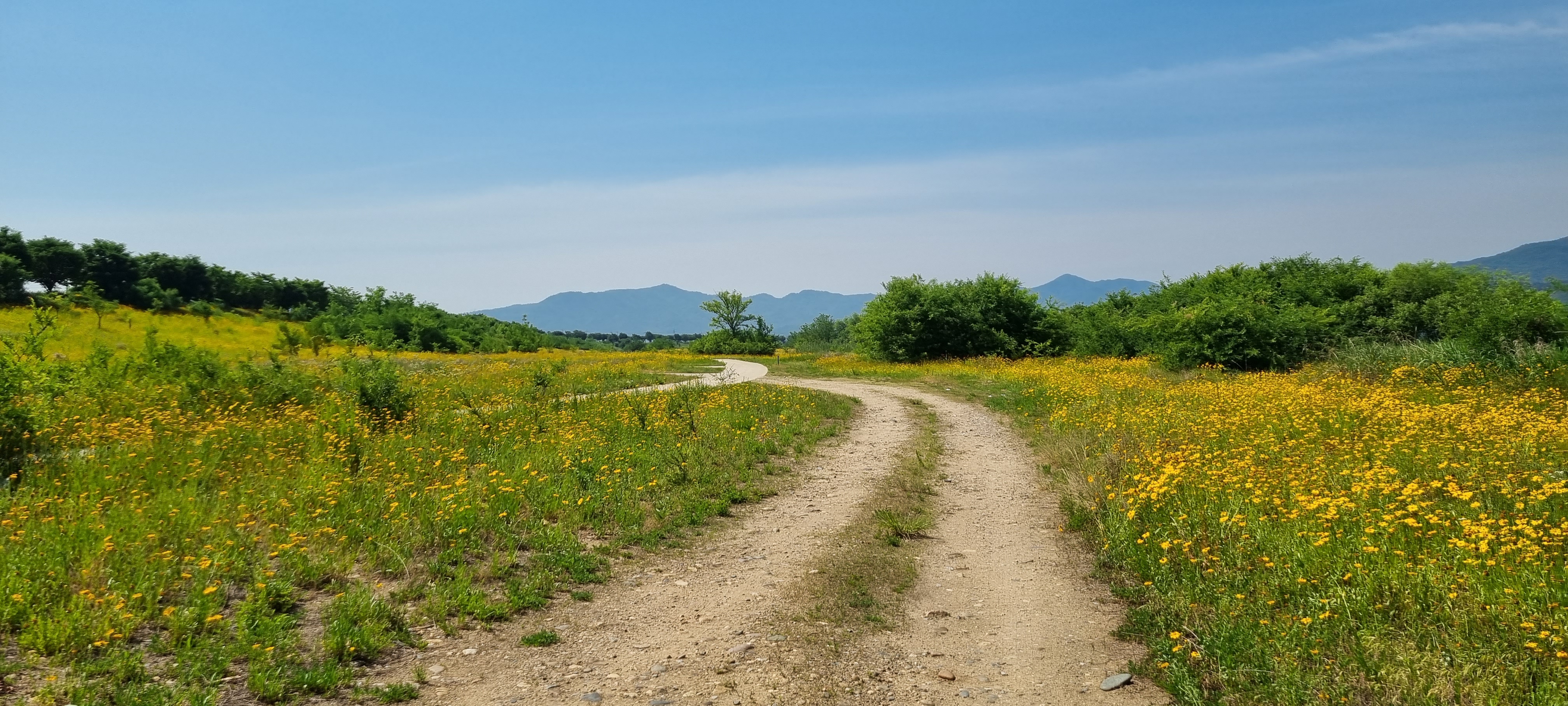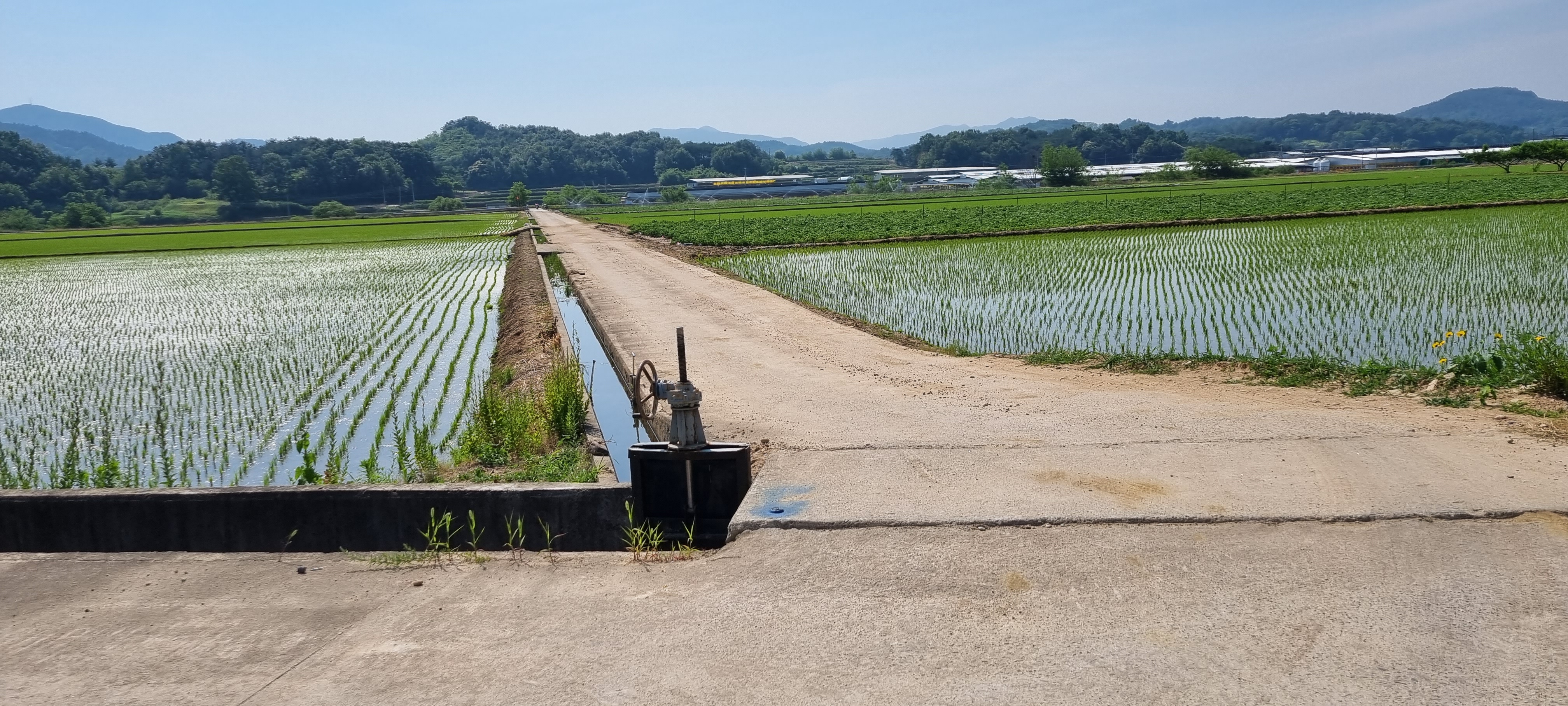 9시16분 낙동강의성휴게소(하행)를 출발했습니다. 이 휴게소 북단의 ‘언약의 장소’ 소공원(?)에서 서쪽으로 나 있는 야산의 호젓한 산길로 들어섰습니다. 경운기가 다닐만한 넓은 산길을 따라 내려가 볏모가 가지런히 이식된 넓은 들판을 지났습니다. 휴게소 출발 20분이 지나 올라선 가산제 둑방 길에서 의성군단밀면과 구미시도개면 경계점을 확인하고 낙동강 좌안의 하천부지로 내려가자 진노랑의 금계국 꽃이 활짝 피어 마치 화원(花原)에 들어선 듯했습니다. 강가로 다가가 잔잔히 흐르는 낙동강의 물흐름을 카메라에 옮겨 담은 후 다시 제방길로 올라서 남진했습니다. 가산리양수장의 철망에 걸려 있는 “개자식아!!! 쳐 먹고 싶냐!”라는 낙서를 보고 증오감에 사로잡힌 정신이상자가 이처럼 평온한 시골에도 있나 싶어 씁쓰레했습니다. 월림제 제방길로 들어선 지 얼마 후 2층 양옥의 단아한 독채 건물을 지나면서 생각한 것은 낙동강의 전망처로 이만한 집이 따로 있겠나 하는 것이었습니다.