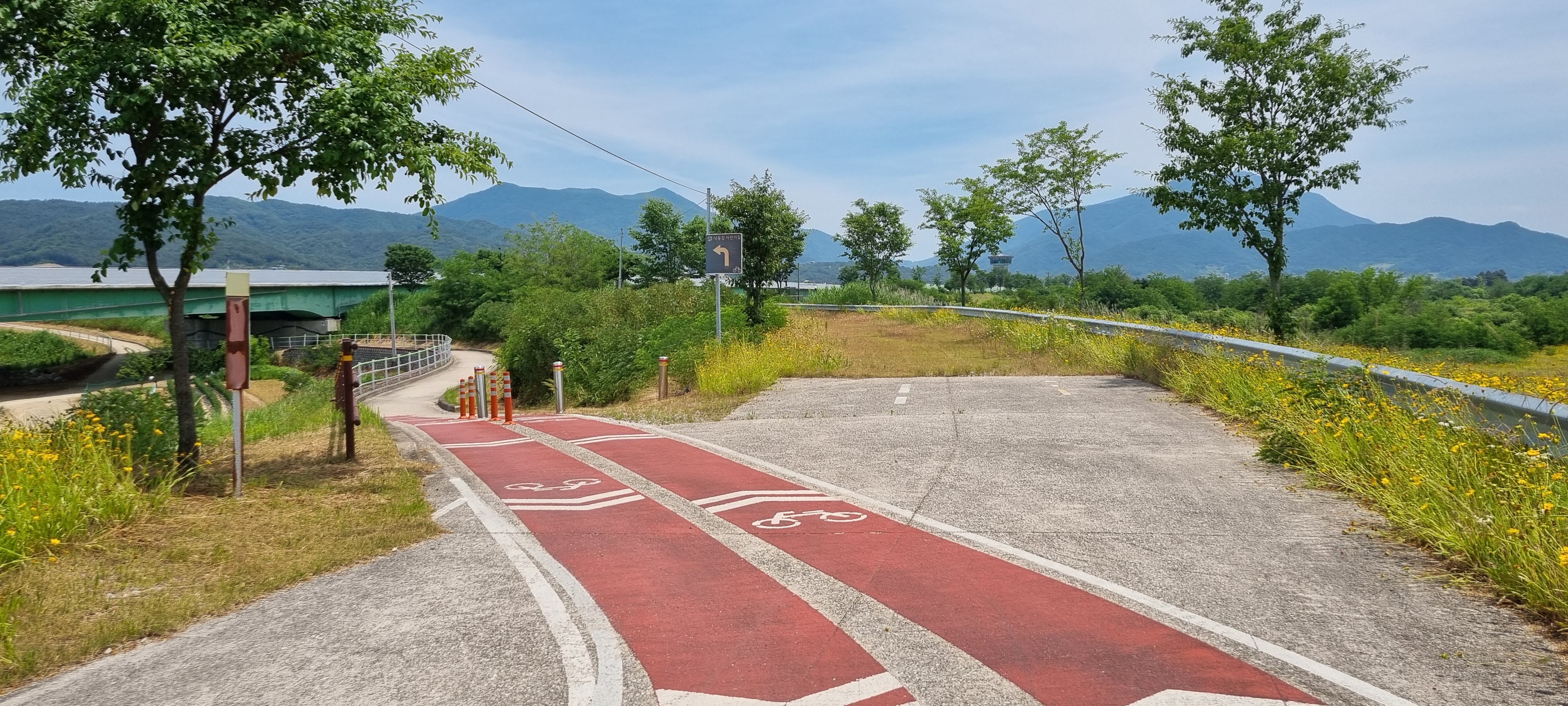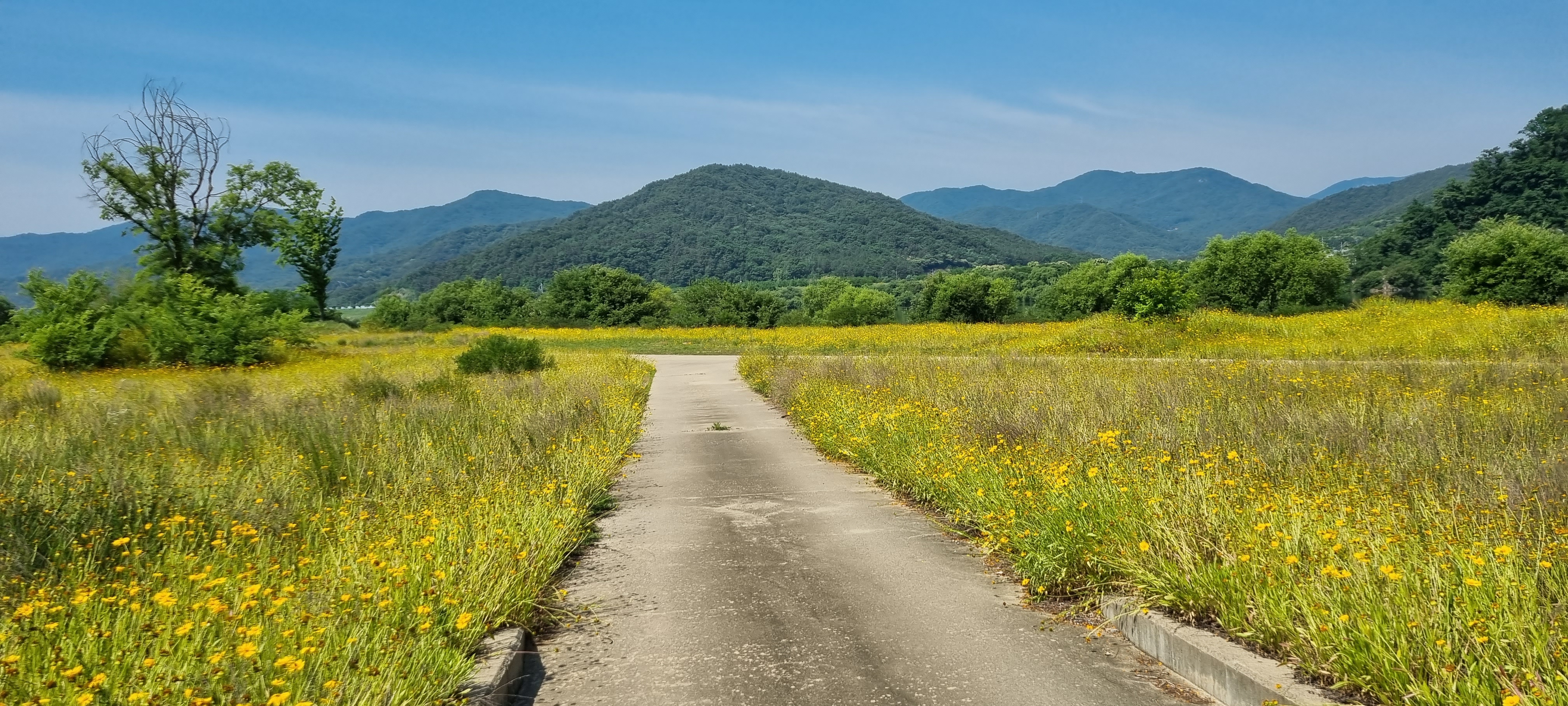 13시46분 선산대교에 다다랐습니다. 임호2제가 짧은 것은 북동쪽의 동산지에서 내려오는 지천을 만나서였습니다. 이 지천 위에 놓인 월림교를 건너 들어선 임호1제도 길지 않았는데, 그 까닭 또한 이 제방이 낙동강의 제1지류인 신곡천에서 끝나기 때문입니다. 신곡천 앞에서 왼쪽으로 내려가 신곡교를 건너 도개제 제방길로 들어섰습니다. 도개제 오른쪽 하천부지에는 도개파크골프장이 들어섰고, 왼쪽 옆 25번 도로변에는 낙동강을 조망할 수 있는 도개리전망대가 우뚝 서 있었습니다. 도개파크골프장이 끝나는 지점에서 신림교에 이르기까지 낙동강 좌안의 하천부지가 진노란 금계국 꽃들로 덮여 화사했습니다. 신림교를 건너 이어지는 신림제를 따라 걸으며 선산대교를 다리 밑으로 지났습니다.