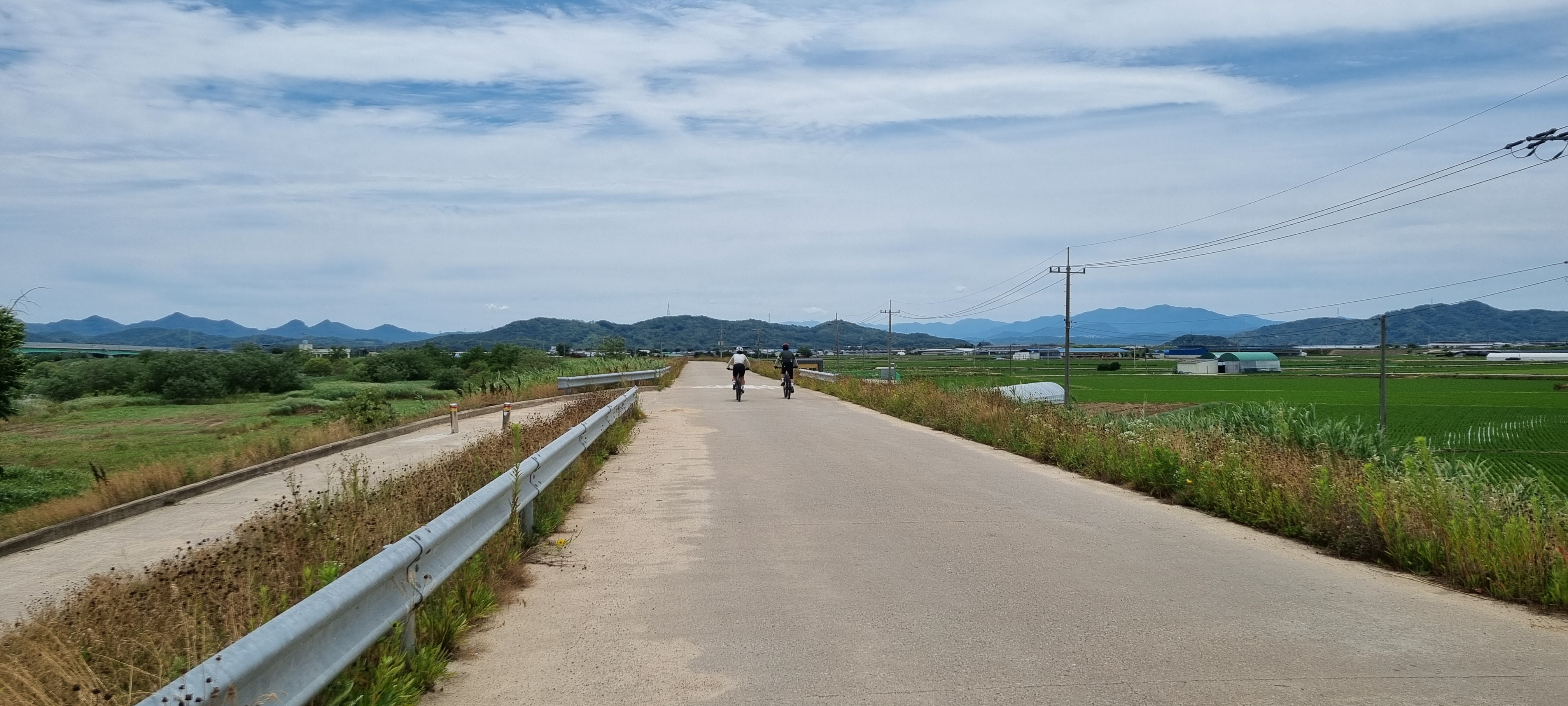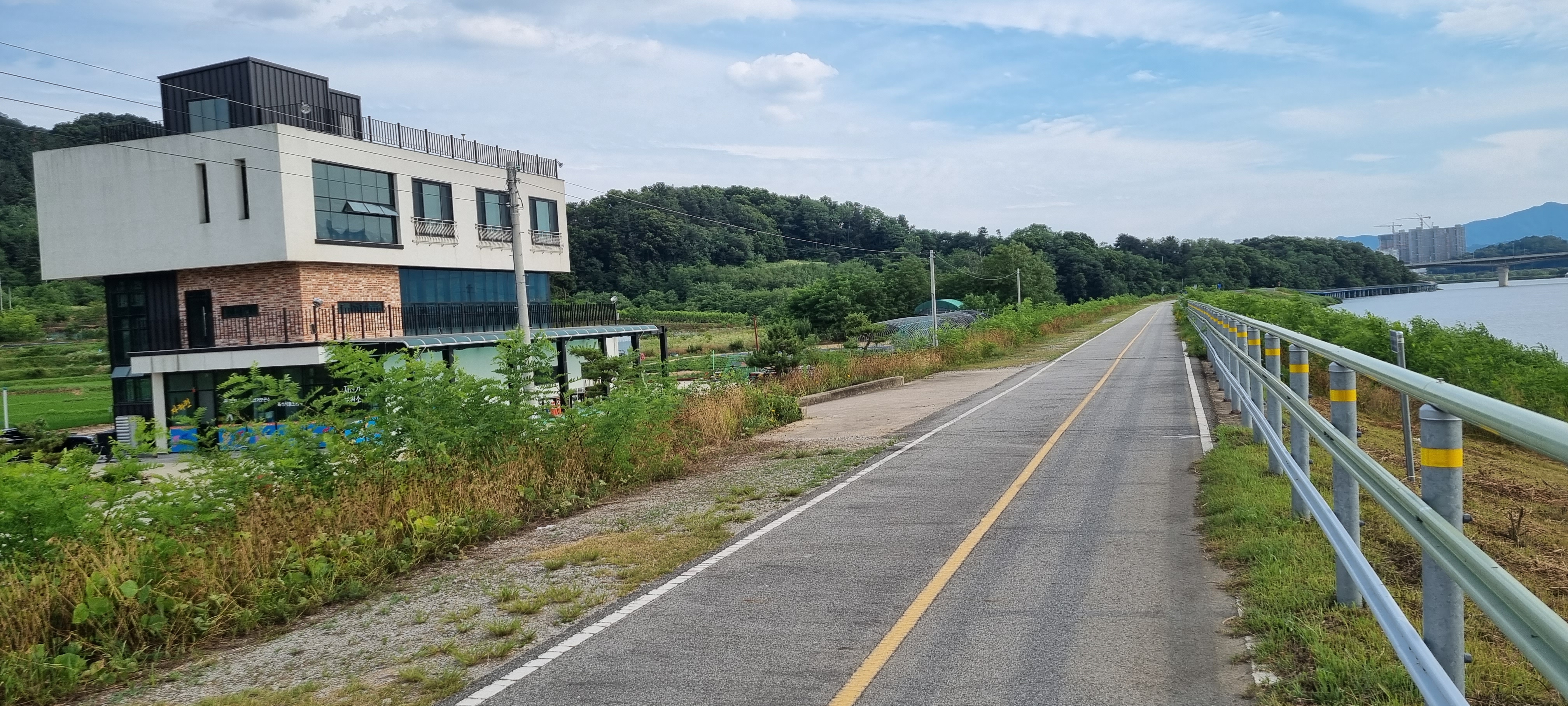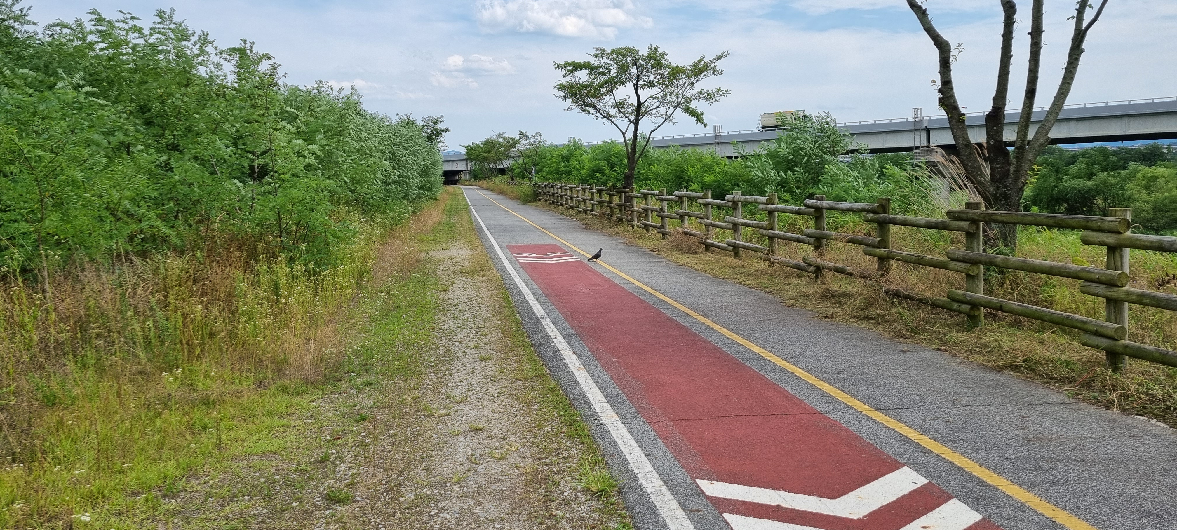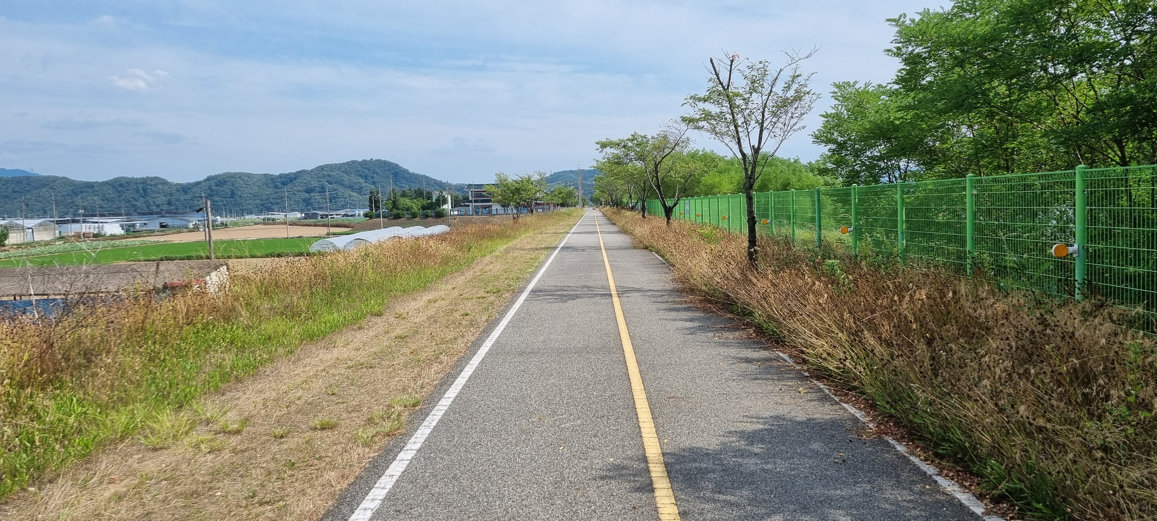 바로 옆 강변하우스 카페에서 물냉면을 시켜 들어 속을 식힌 후 숭선대교를 건너 낙동강 좌안의 자전거길로 들어섰습니다. 자전거길 양쪽으로 초록색 철망의 펜스가 쳐 있었는데, 왼쪽 펜스 너머로는 농수로를 따라 물이 콸콸 흘렀고, 오른쪽 펜스 너머로는 상수원보호구역으로 설정되어 사람들의 출입을 막았습니다. 자전거길을 따라 25번 도로와 나란한 방향으로 진행해 해평습지를 지난 후 낙동강 제1지류인 습운천 앞에 이르렀습니다.