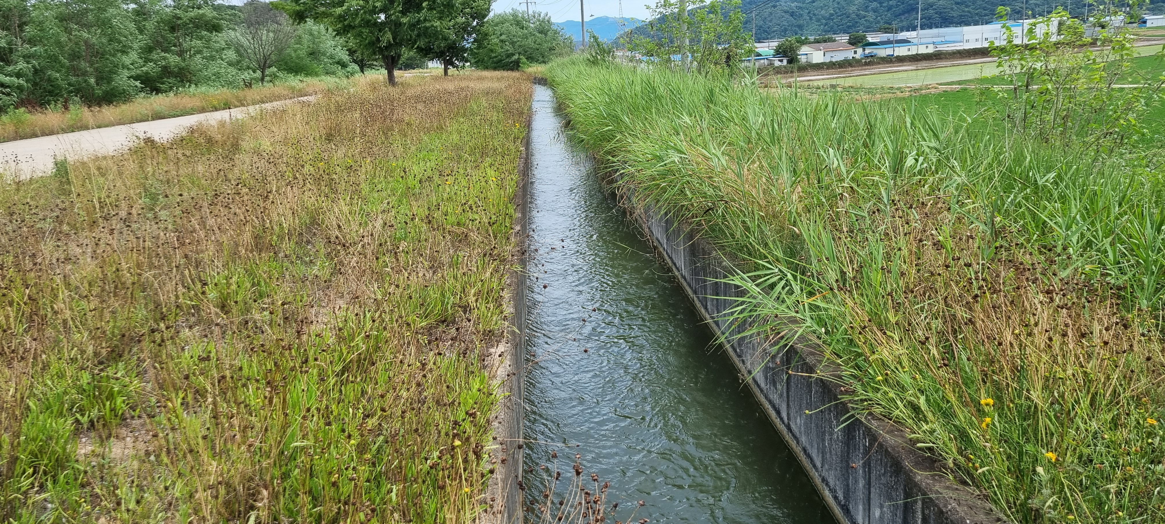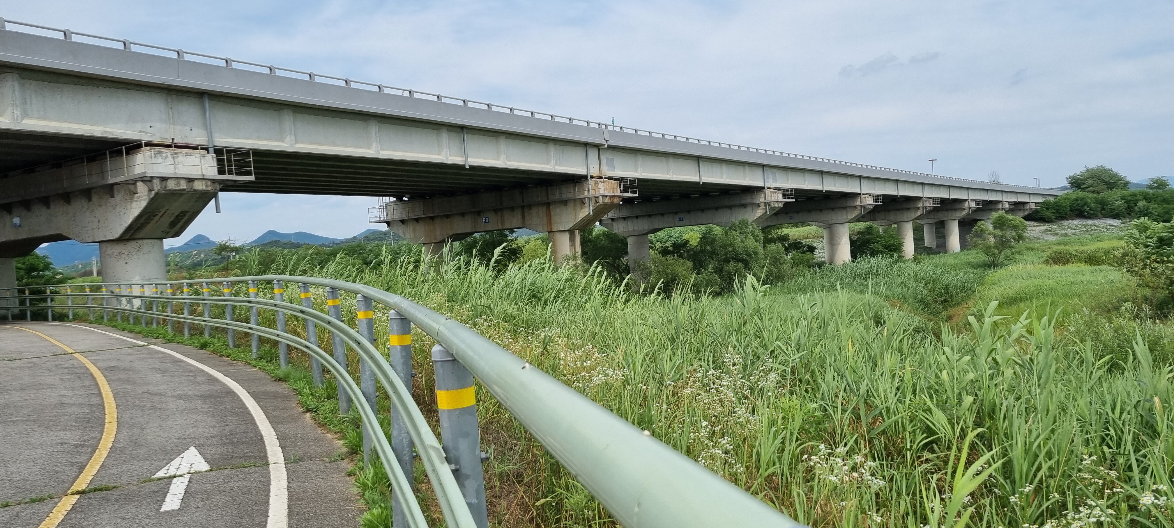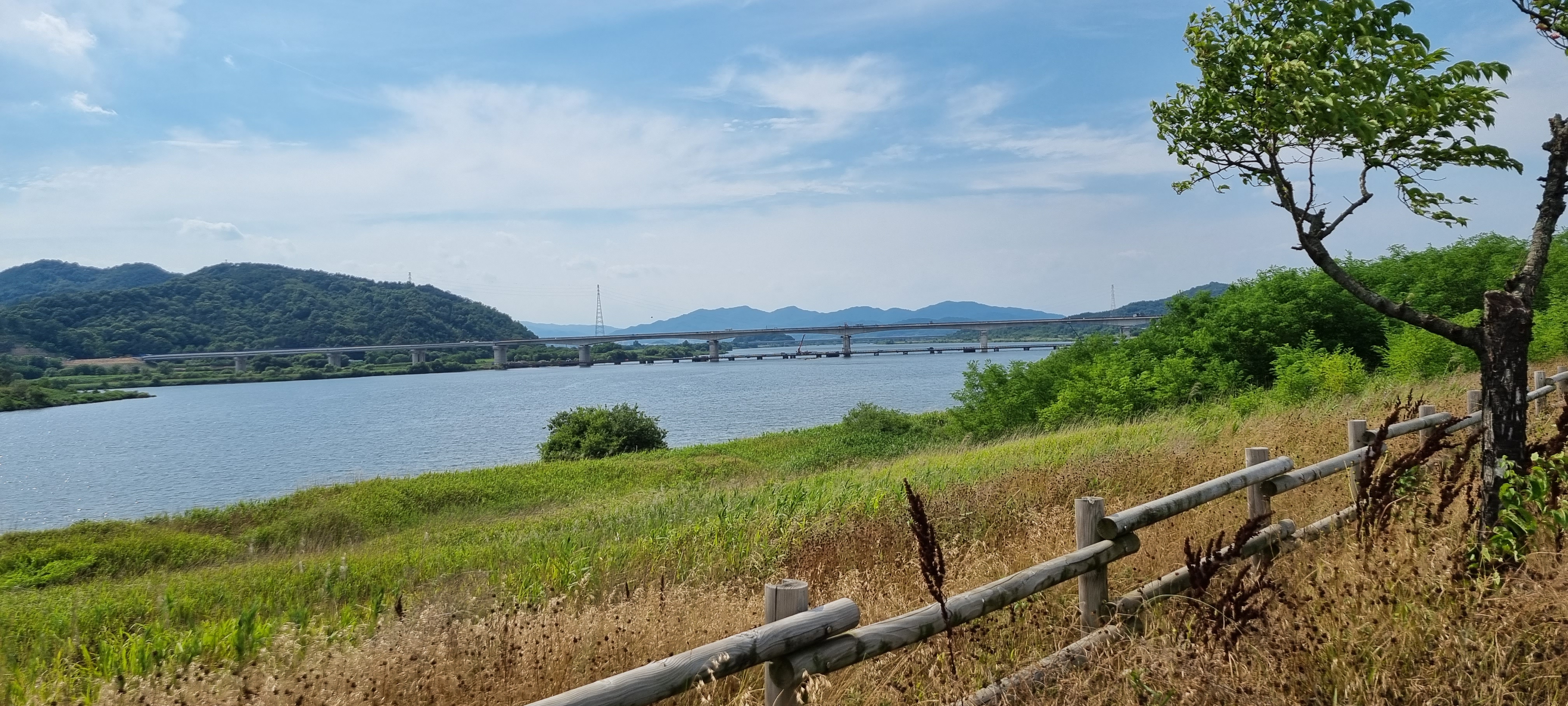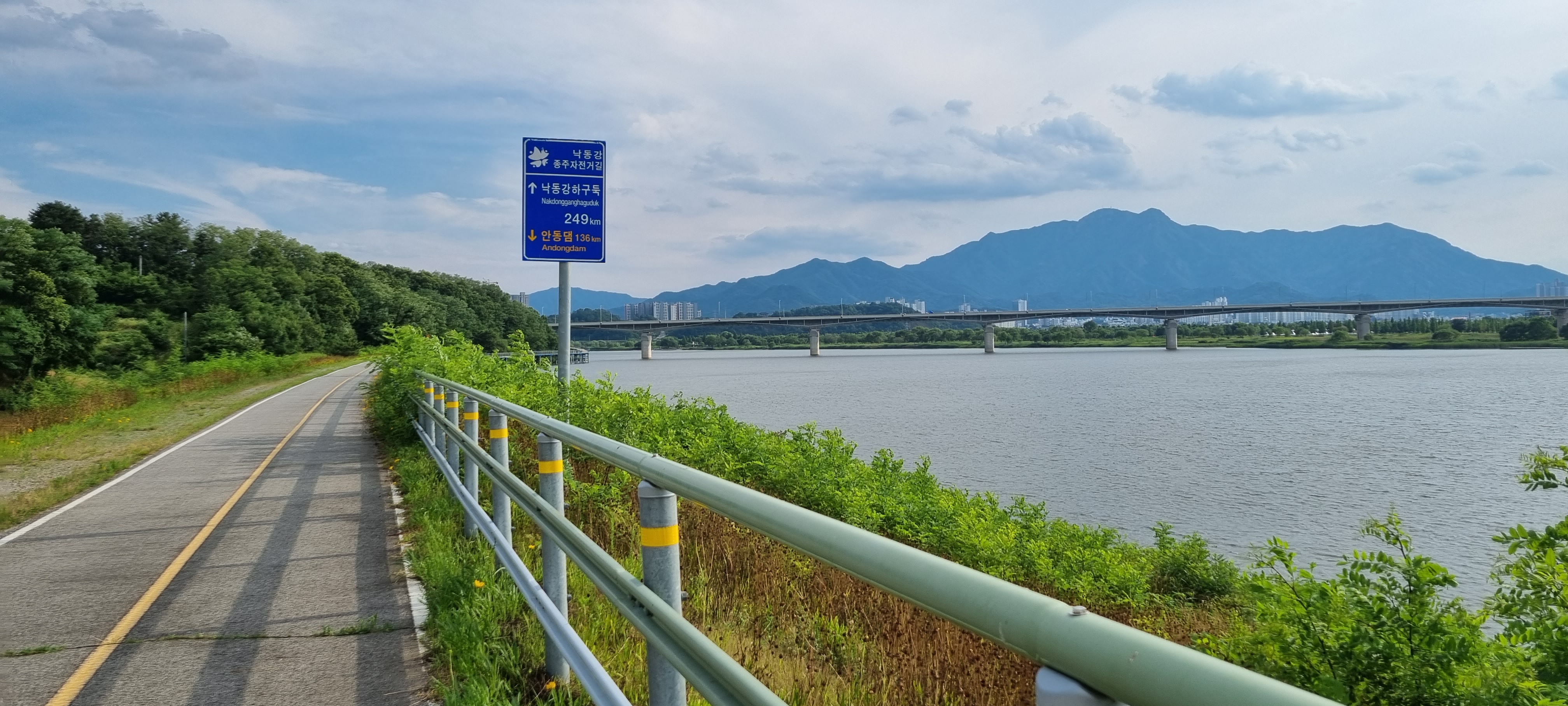 바로 옆 강변하우스 카페에서 물냉면을 시켜 들어 속을 식힌 후 숭선대교를 건너 낙동강 좌안의 자전거길로 들어섰습니다. 자전거길 양쪽으로 초록색 철망의 펜스가 쳐 있었는데, 왼쪽 펜스 너머로는 농수로를 따라 물이 콸콸 흘렀고, 오른쪽 펜스 너머로는 상수원보호구역으로 설정되어 사람들의 출입을 막았습니다. 자전거길을 따라 25번 도로와 나란한 방향으로 진행해 해평습지를 지난 후 낙동강 제1지류인 습운천 앞에 이르렀습니다.