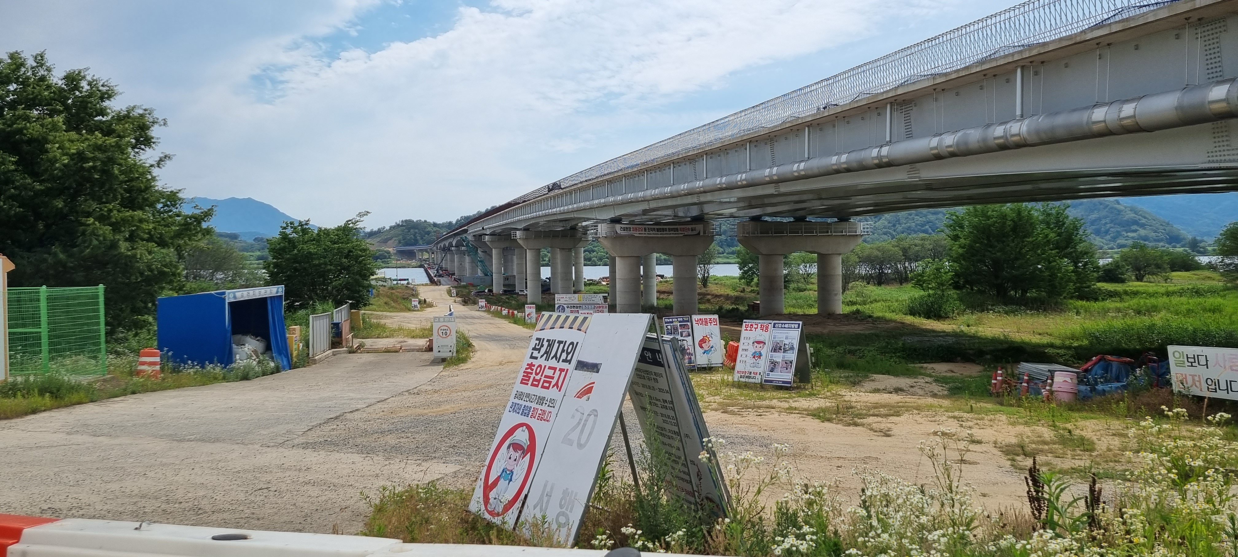 15시48분 K-Water 구미권지사 해평정수장/해평취수장을 지났습니다. 습운천 앞에서 왼쪽 굴다리로 25번 도로를 통과하자 길 건너 2층의 해평가마솥국밥집이 눈을 끌었습니다. 습운천을 건너 낙동강 교량건설로 주변이 어수선한 공사현장을 지나 해평제 제방길로 들어서자 강 건너 남서쪽으로 몇 번 오른 금오산이 가깝게 보여 반가웠습니다.