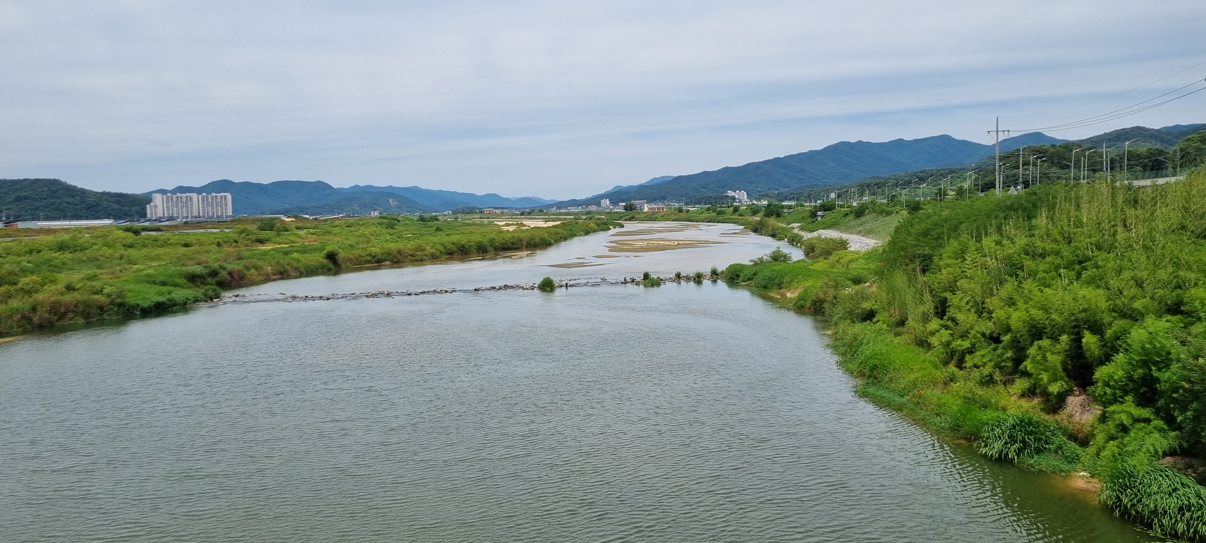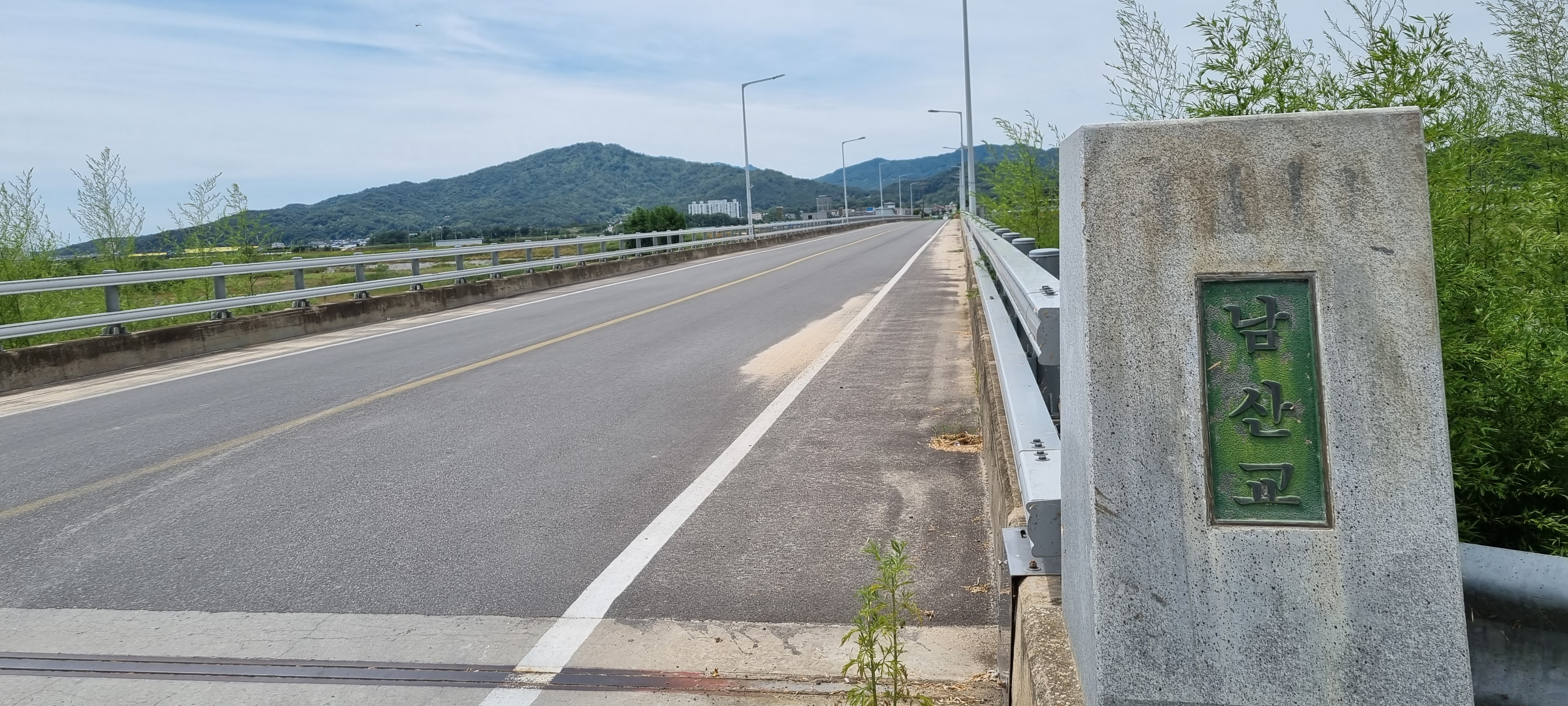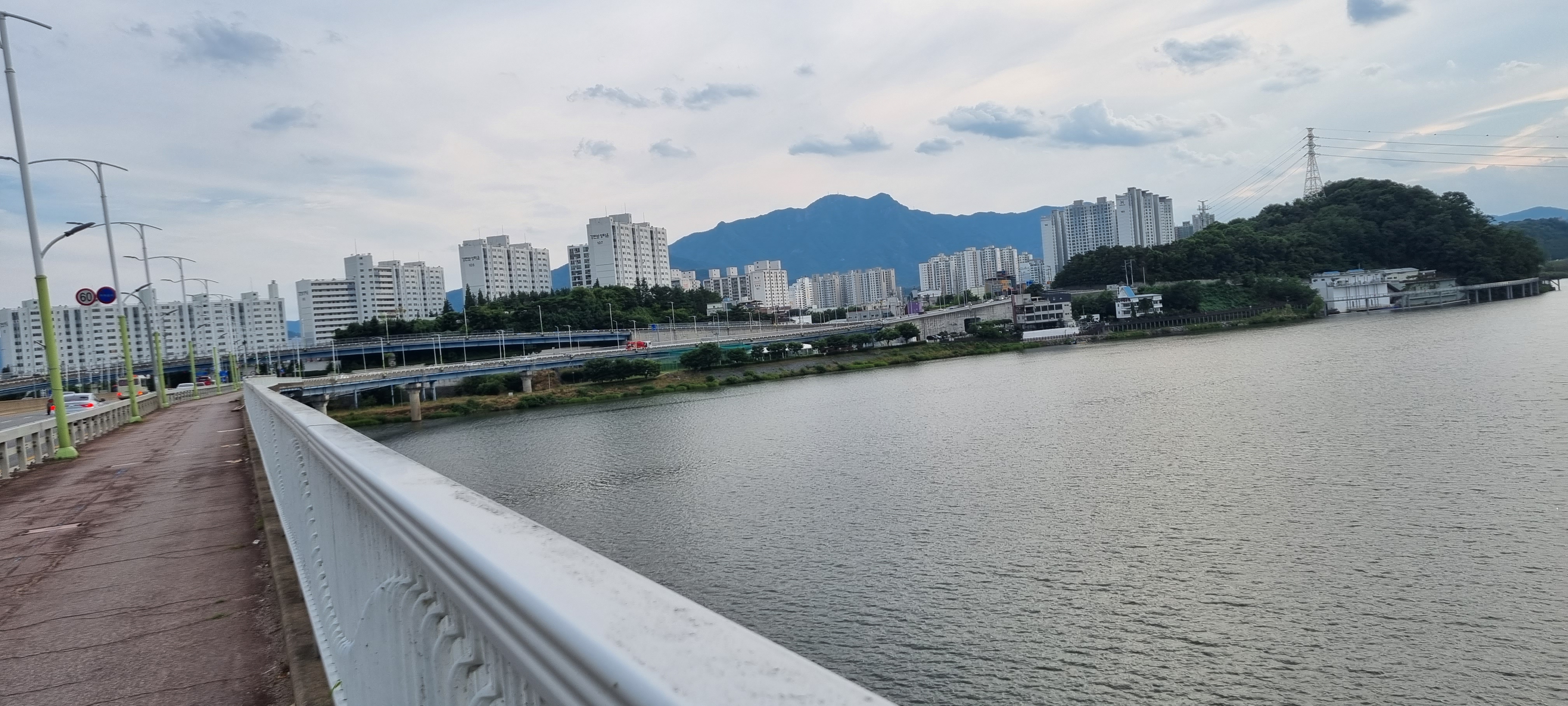 17시52분 산호대교에 이르렀습니다. 해평취수장/정수장을 지나서는 상수원보호구역이 해제되어서인지 초록색 펜스가 더 이상 보이지 않았습니다. 해평제를 가운데 두고 왼쪽 아래 넓은 들판은 초록색 농작물로 뒤덮였고, 오른 쪽 하천부지는 갈대와 수변 수목들이 가득 들어서 녹색의 향연이 펼쳐진 듯 했습니다. 성수천을 건너 낙동강 우안의 강물 위에 놓은 다리를 따라 걸으며 여러 차례 역동적인 강물의 흐름을 카메라에 옮겨 담았습니다. 강 다리를 지나 올라선 제방길을 따라 진행하다가 자하현편의점을 들러 시원한 콜라를 마시고 나자 더위에 지친 몸이 생기를 되찾은 듯 했습니다. 제방길을 따라 걸으며 길가 꽃잎에 앉아 있는 나비를 사진 찍었는데, 이는 실로 오랜 만의 일로 나비가 저의 접근을 허용해 가능했습니다. 나비가 더위에 지쳐 잠시 쉬고 싶었거나 혼자 땀 흘리며 걷고 있는 저를 측은히 여겨 저의 접근이 가능했을 것입니다. 다시 강물 위에 놓인 커브 길의 다리를 걸어 양호대교를 지나자 양호제 제방길이 이어졌습니다. 제방길에서 만난 별노랑이꽃은 꽃 모양이 별을 닮아 그 이름을 오래 기억할 수 있을 것 같습니다. 산호대교에 이르러 저녁나절 시원한 강바람을 온 몸으로 맞으면서 낙동강을 건넜습니다.