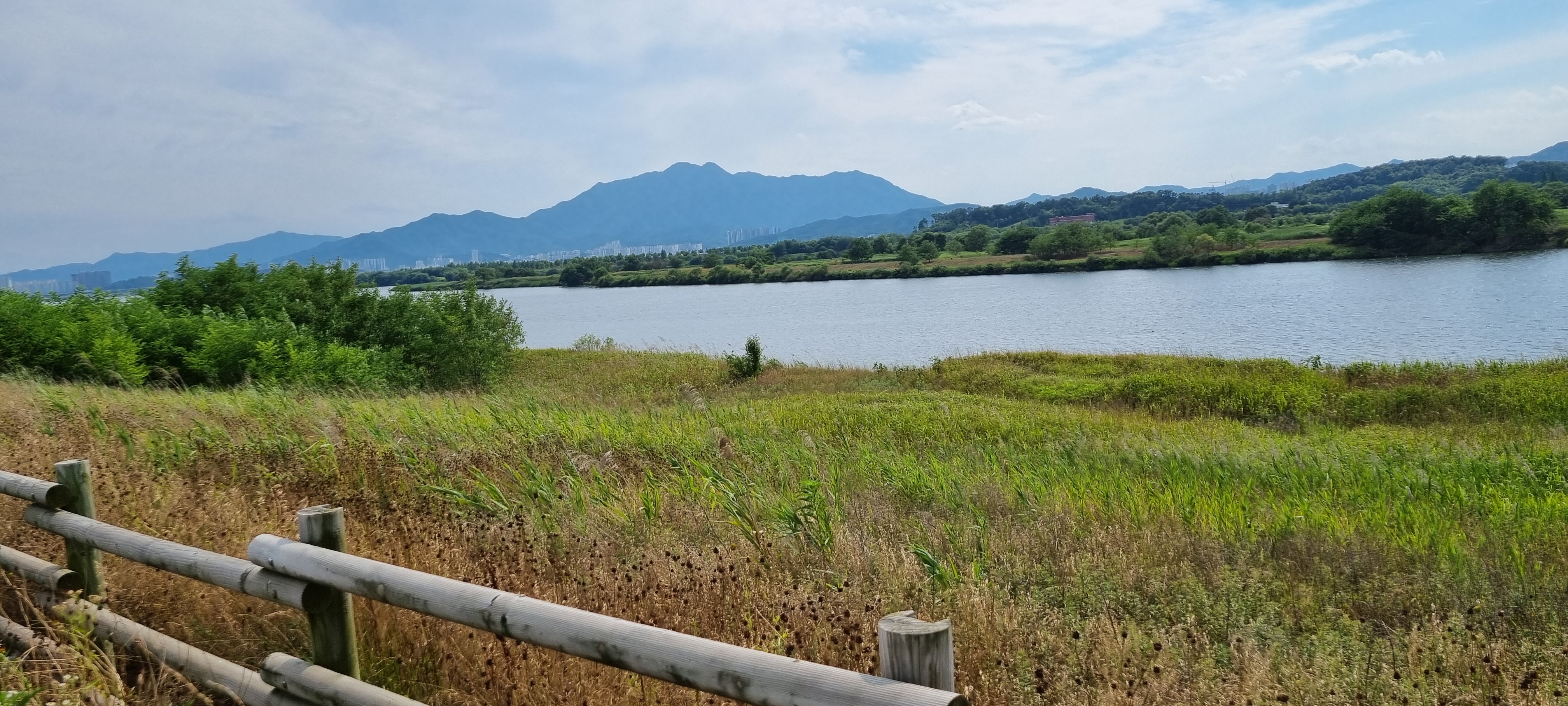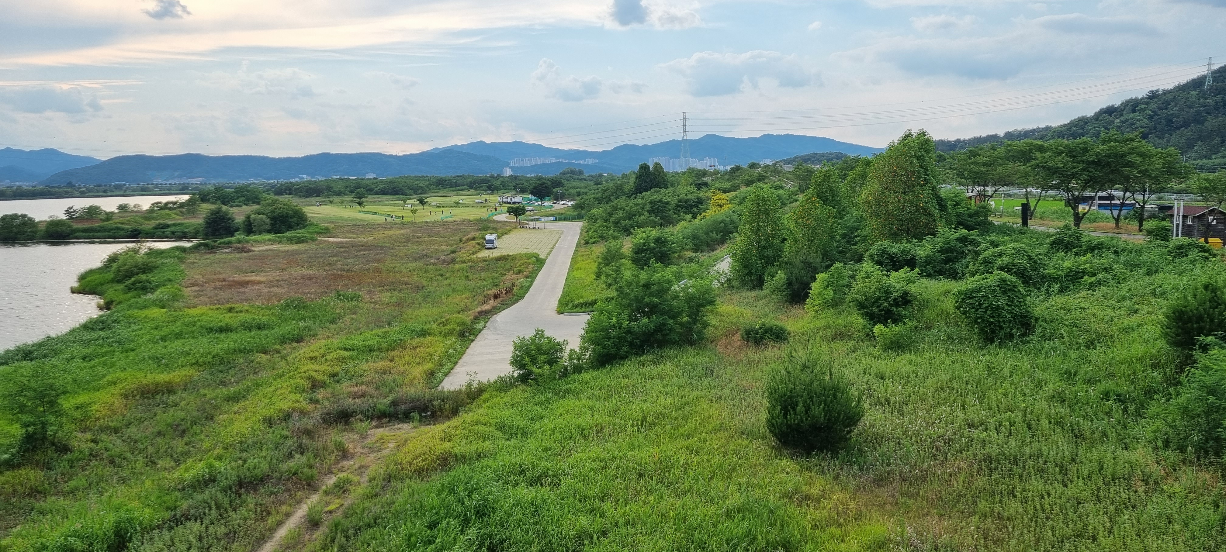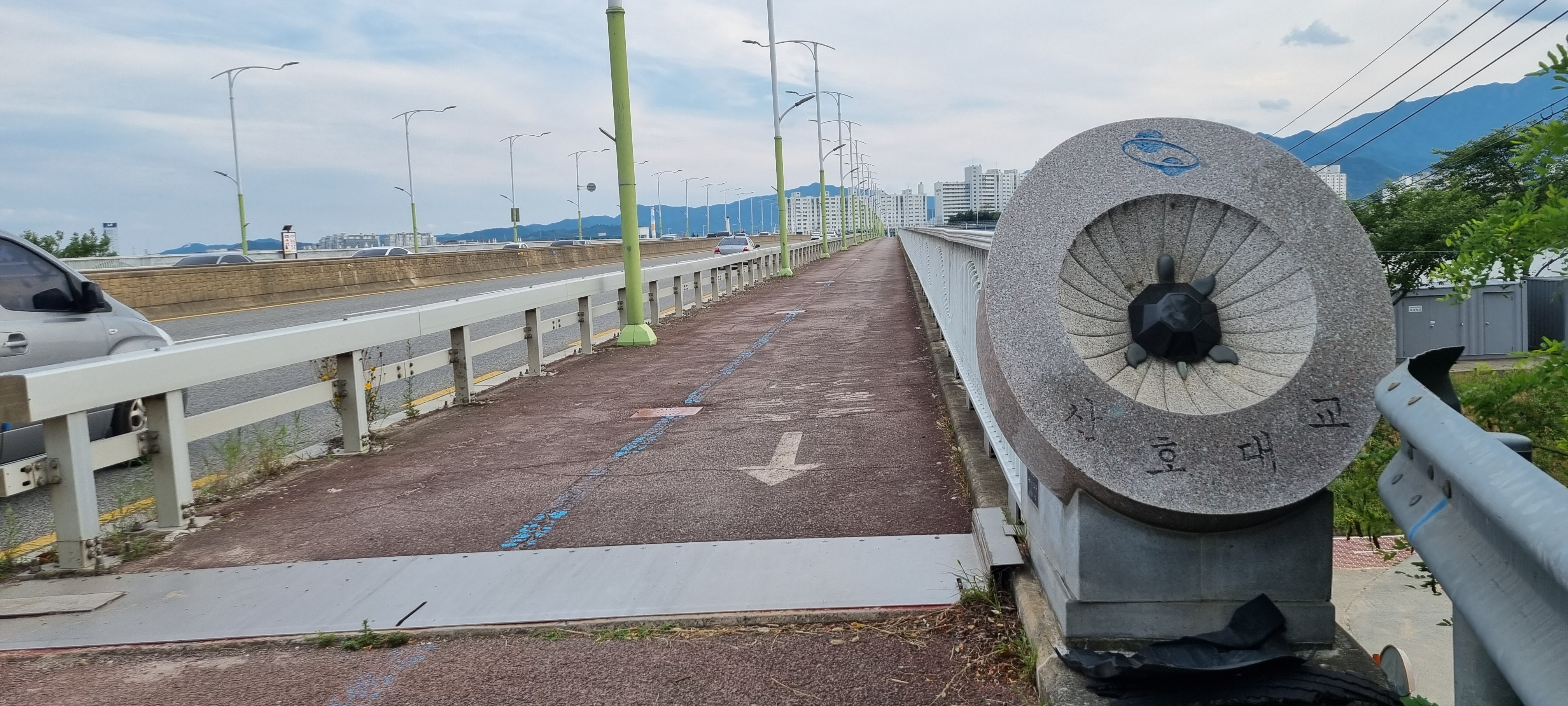 17시52분 산호대교에 이르렀습니다. 해평취수장/정수장을 지나서는 상수원보호구역이 해제되어서인지 초록색 펜스가 더 이상 보이지 않았습니다. 해평제를 가운데 두고 왼쪽 아래 넓은 들판은 초록색 농작물로 뒤덮였고, 오른 쪽 하천부지는 갈대와 수변 수목들이 가득 들어서 녹색의 향연이 펼쳐진 듯 했습니다. 성수천을 건너 낙동강 우안의 강물 위에 놓은 다리를 따라 걸으며 여러 차례 역동적인 강물의 흐름을 카메라에 옮겨 담았습니다. 강 다리를 지나 올라선 제방길을 따라 진행하다가 자하현편의점을 들러 시원한 콜라를 마시고 나자 더위에 지친 몸이 생기를 되찾은 듯 했습니다. 제방길을 따라 걸으며 길가 꽃잎에 앉아 있는 나비를 사진 찍었는데, 이는 실로 오랜 만의 일로 나비가 저의 접근을 허용해 가능했습니다. 나비가 더위에 지쳐 잠시 쉬고 싶었거나 혼자 땀 흘리며 걷고 있는 저를 측은히 여겨 저의 접근이 가능했을 것입니다. 다시 강물 위에 놓인 커브 길의 다리를 걸어 양호대교를 지나자 양호제 제방길이 이어졌습니다. 제방길에서 만난 별노랑이꽃은 꽃 모양이 별을 닮아 그 이름을 오래 기억할 수 있을 것 같습니다. 산호대교에 이르러 저녁나절 시원한 강바람을 온 몸으로 맞으면서 낙동강을 건넜습니다.
