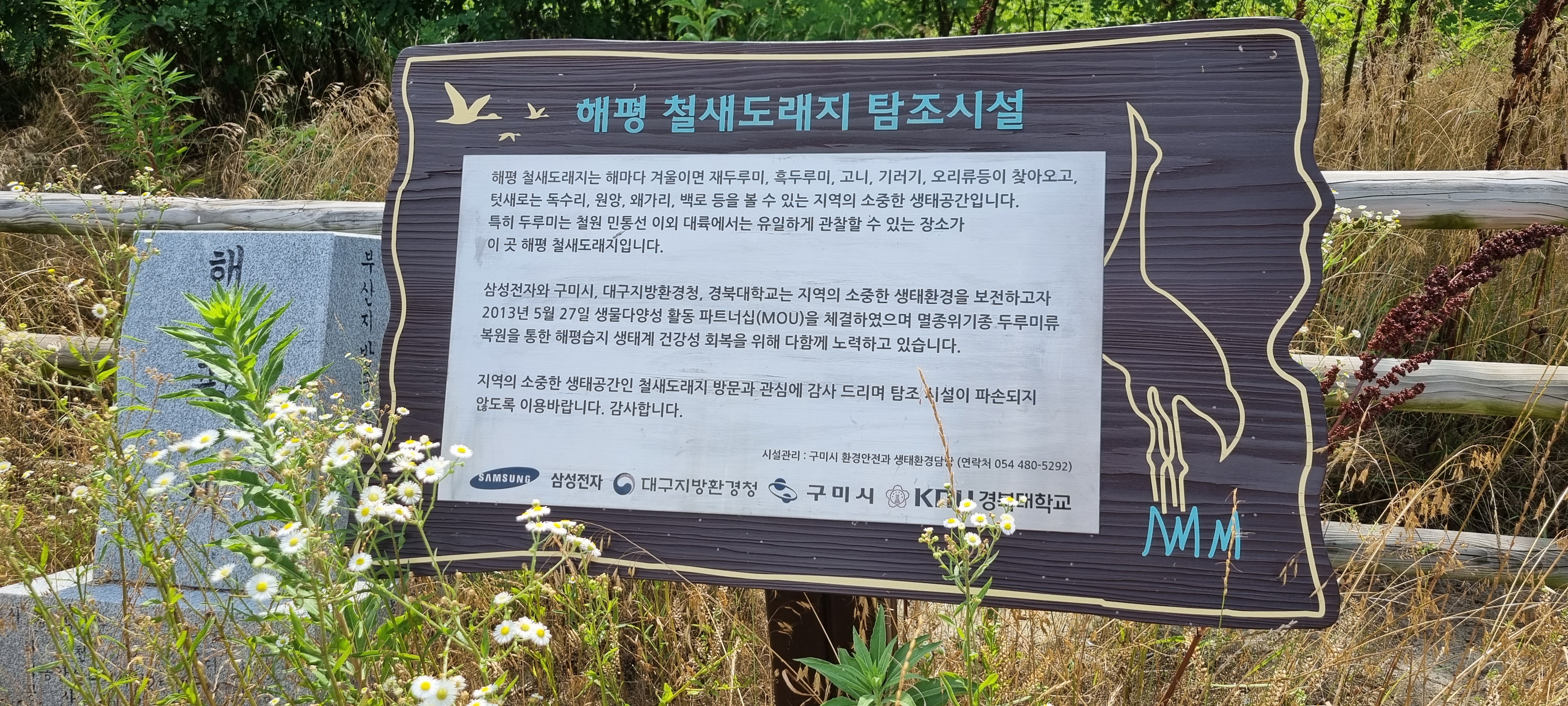 낙동강을 따라 걸으며 철새 도래지를 본 것은 이번이 처음이었습니다. 여기 해평철새도래지는 겨울이면 재두루미, 흑두루미, 고니, 기러기, 오리류 등이 찾아오고, 텃새로는 독수리, 원앙, 왜가리, 백로 등이 찾아온다고 합니다. 특히 여기 철새도래지는 강원도 철원 이외의 내륙에서 유일하게 두루미를는 관찰할 수 있는 곳입니다. 겨울철이 아니어서인지 철새든 텃새든 어떤 새도 보이지 않아 안내판이 설치되지 않았다면 이곳이 철새도래지인지를 모르고 그냥 지나칠 뻔했습니다.