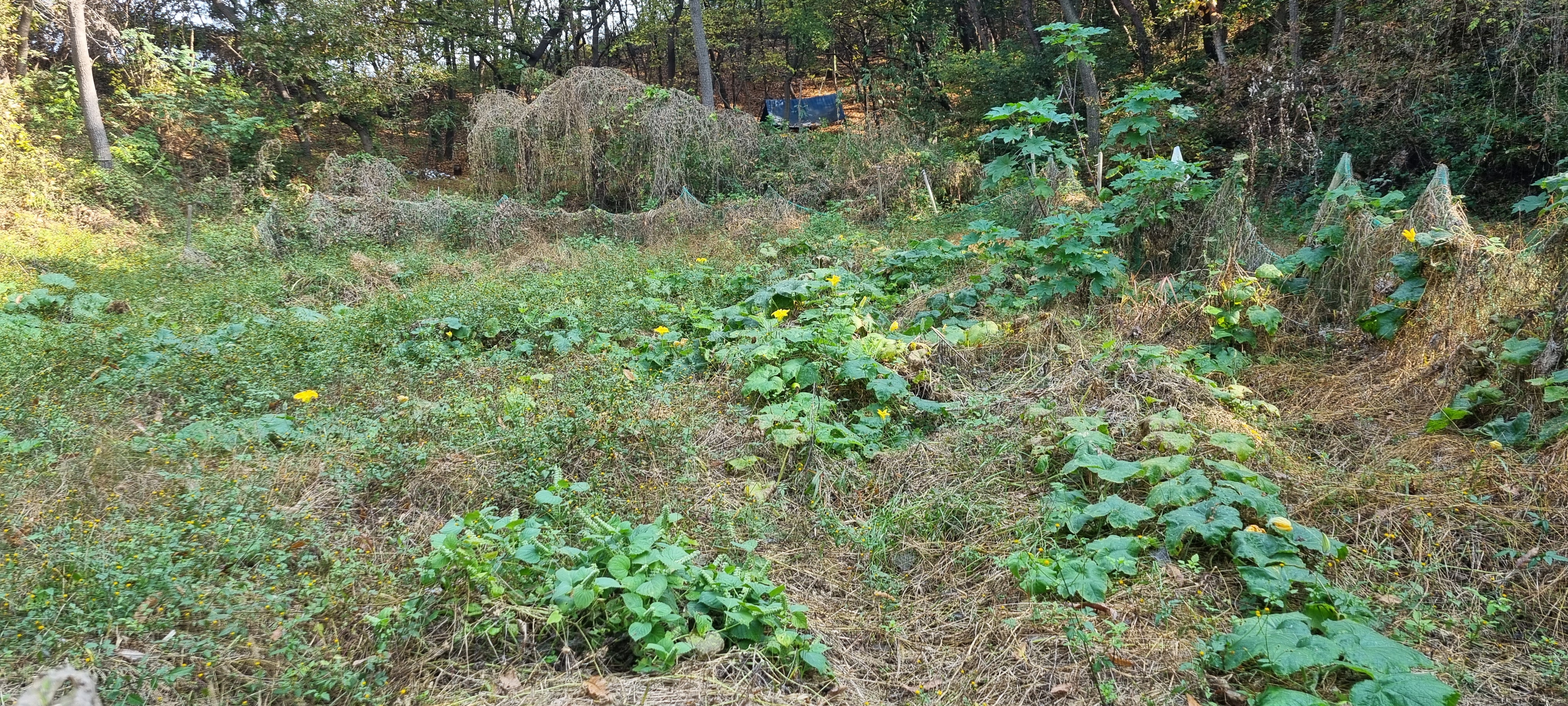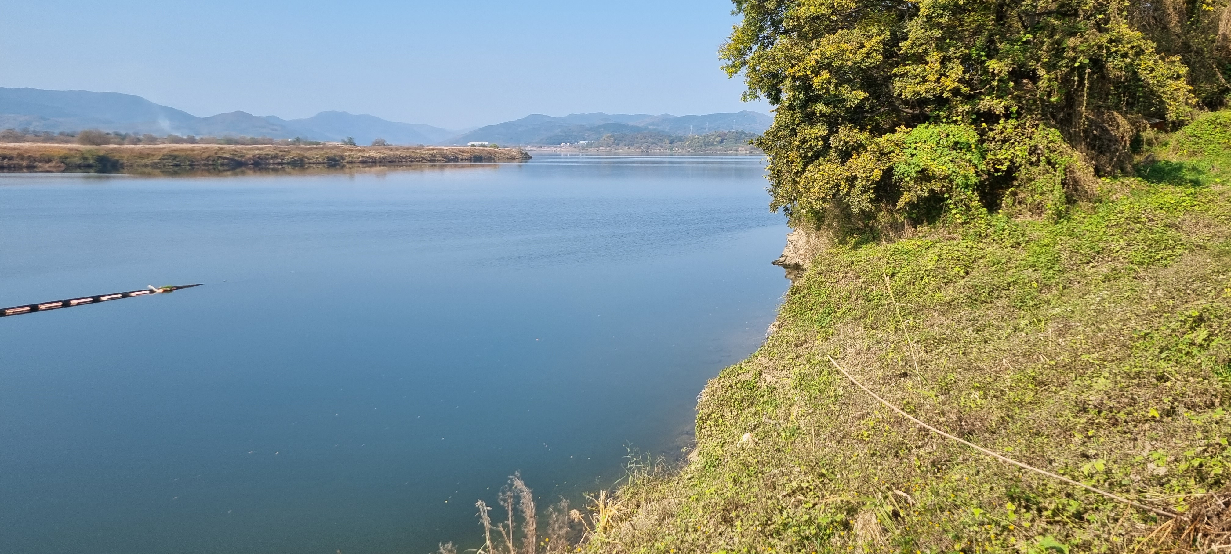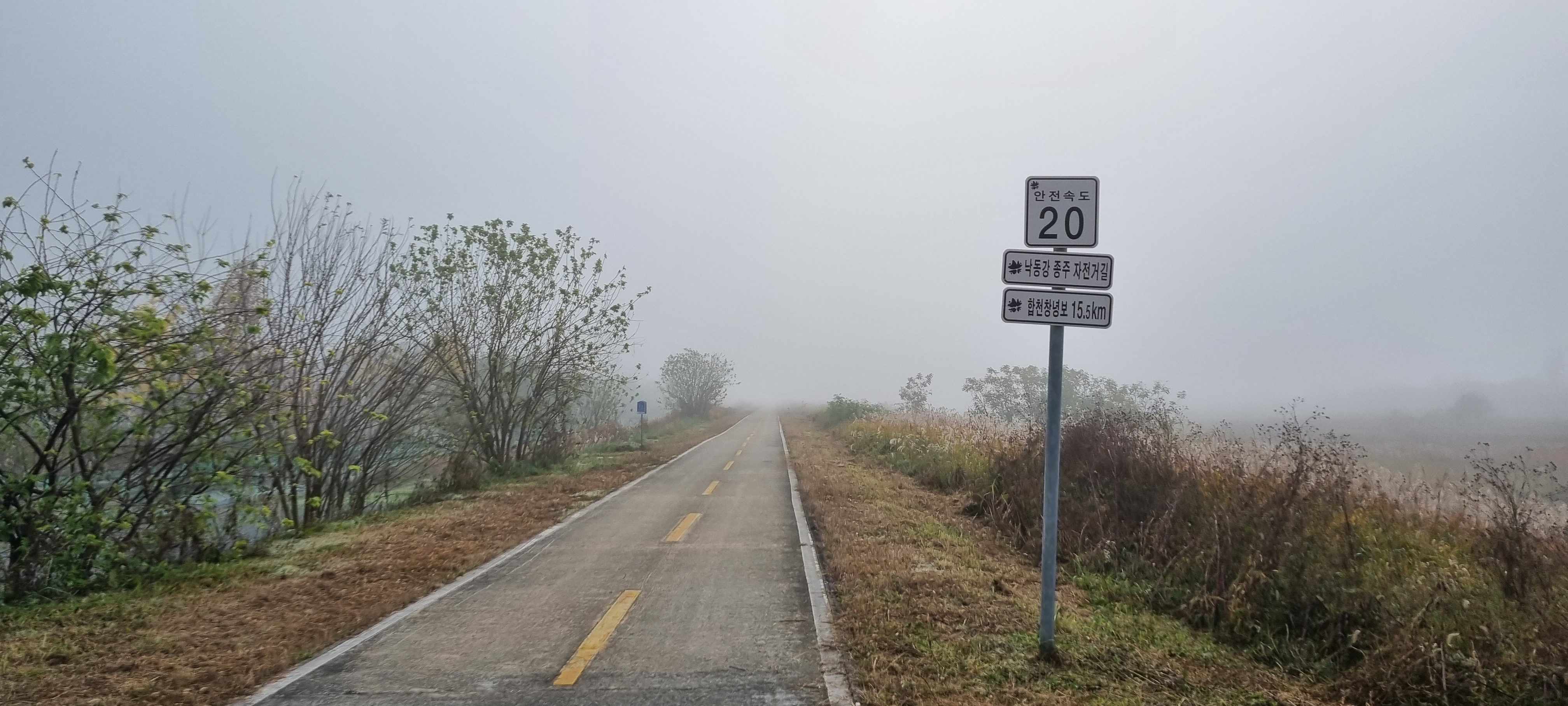 10시10분 안개가 낀 구지오토캠핑장을 출발했습니다. 안개로 가시거리가 100m를 넘지 않는 징리제 제방 길을 따라 얼마 만큼 걸어가다 햇살이 퍼지면서 안개가 사라지기 시작해 강가로 내려갔습니다. 대구교육낙동강수련원이 당국의 허가를 받아 설치한 것을 모르고 수상횔동장의 부표에 올라가 사진을 찍다가 관계자로부터 한 소리 들어 얼른 사과하고 제방 길로 복귀했습니다. 그새 안개가 사라져 대구교육낙동강수련원 건물이 전모를 드러냈는데, 그동안 강을 따라 걸으며 보았던 강원도정선군의 한강에 가까이 위치한 아라리교직원연수원이나 충남옥천군의 금강 변에 자리한 충남학생수련원옥천분원에 비할 수 없이 규모가 커 압도당하는 기분이 들었습니다. 징리제 제방길에 이어지는 화산제 제방길로 발을 들였는데, 넓게 자리한 갈대밭이 제 눈을 끌었습니다. 드넓은 갈대밭보다 더 눈을 끈 것은 길가의 버려진 밭에서 피어난 노란 호박꽃이었습니다. 십 수일 전에 낙동강을 따라 걸으며 봄에 피는 애기똥풀 꽃을 보고서 기상이변을 실감했는데, 이번에 호박꽃을 보고 나자 일시적인 기상이변이 기후변화로 발전할 것 같아 새삼 걱정됐습니다.