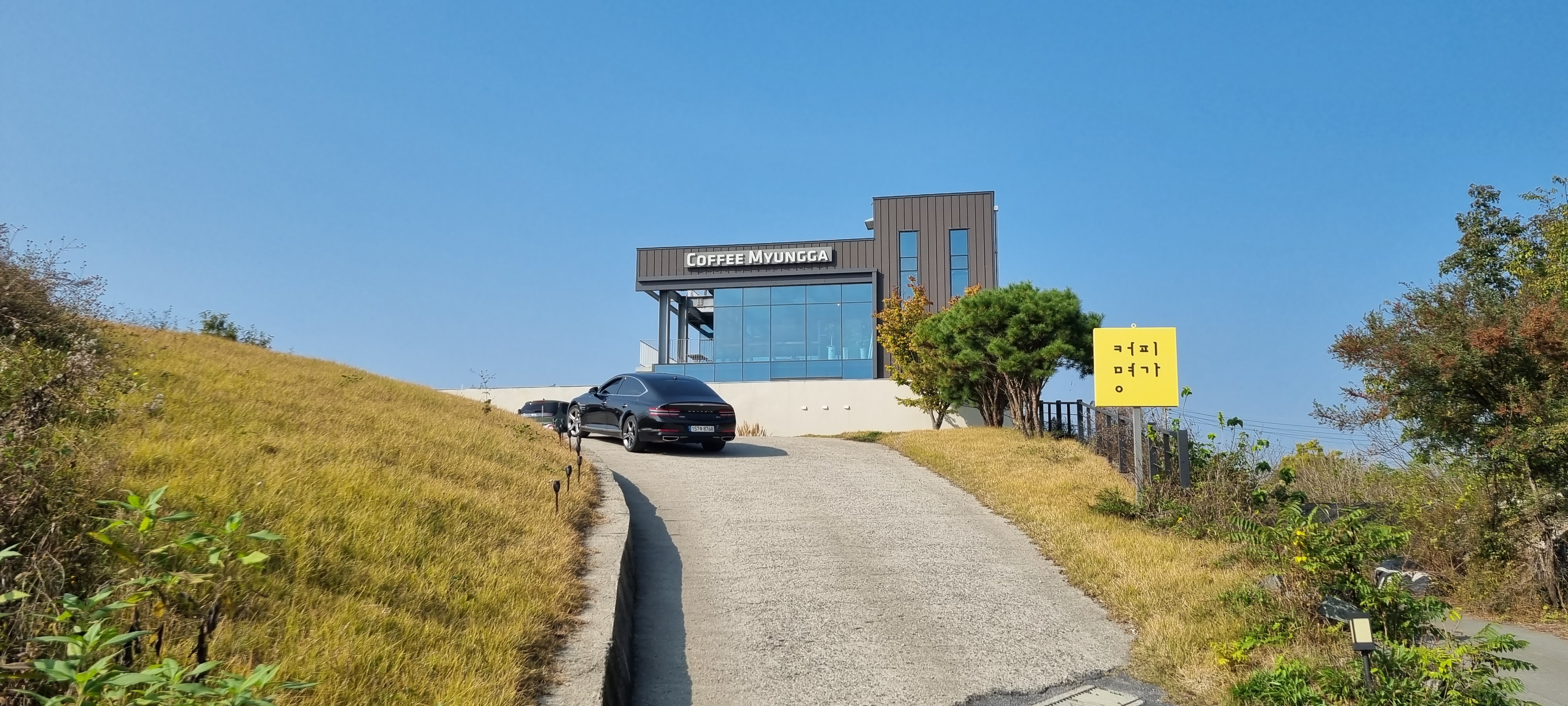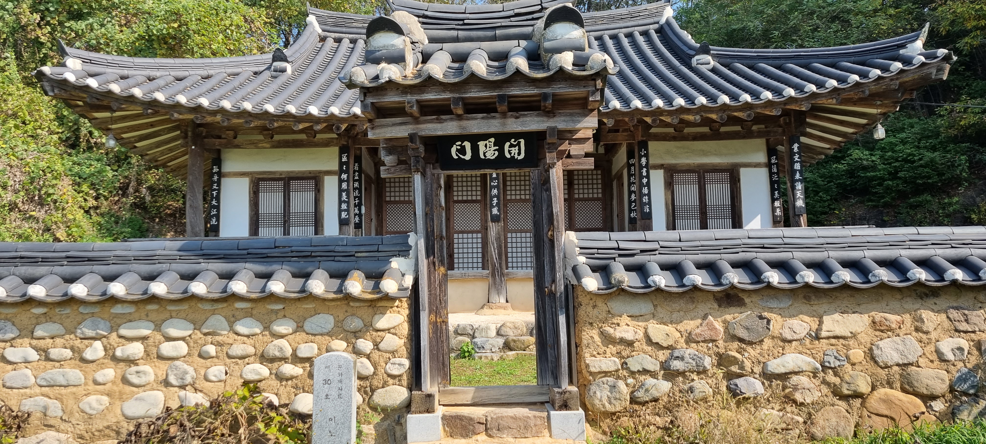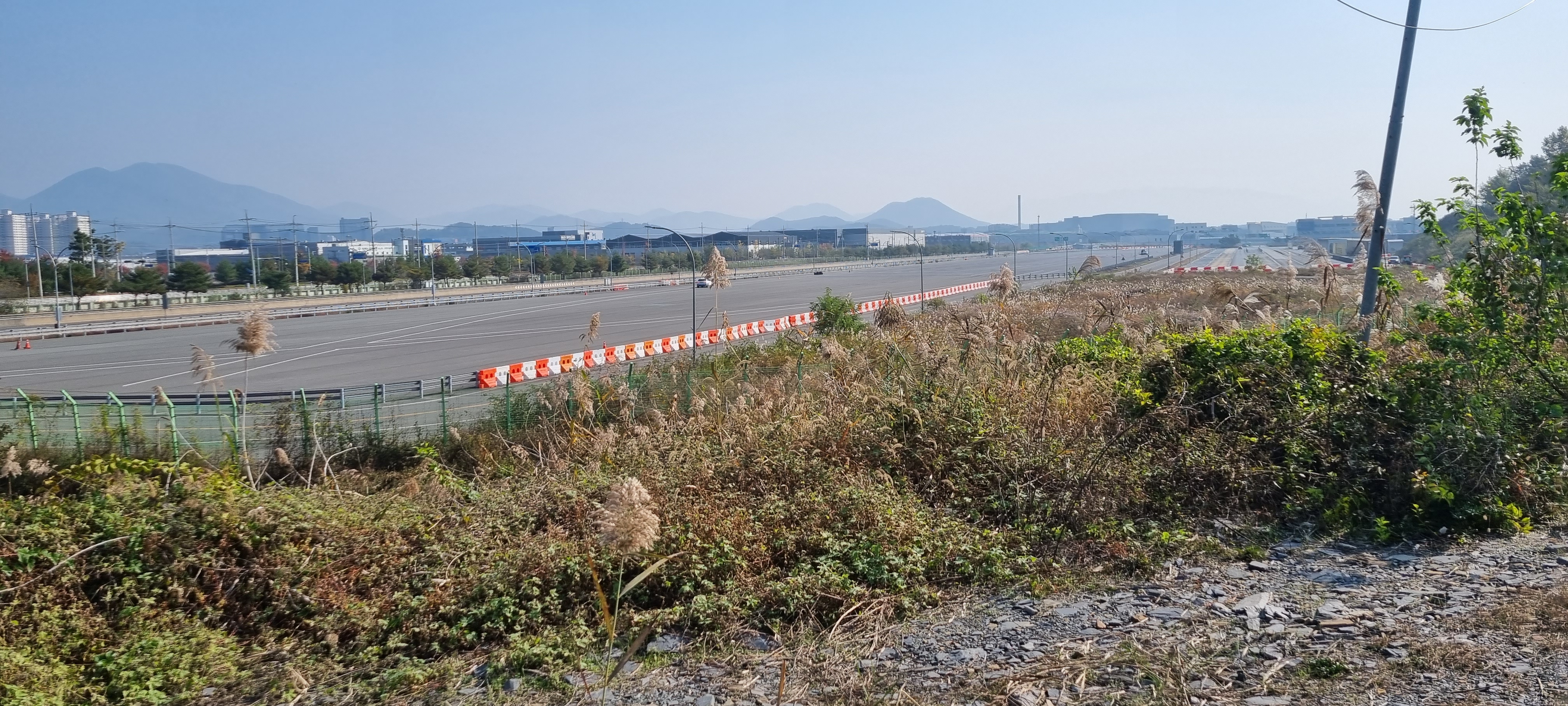12시31분 이노정(二老亭)에 다다랐습니다. 호박꽃을 사진 찍고 제방길로 올라서자 왼쪽으로 규모가 엄청 큰 자동차주행시험장이 보였습니다. 이 주행장 울타리에 사진 촬영을 금지한다는 경고판이 붙어있어 이상하다 했는데, 알고 보니 이 주행시험장은 지능형자동차주행시험장으로 일반 주행시험장보다 몇 배는 커 보였습니다. 대암4제 제방길이 끝나고 강변의 구비 길을 지나 강변 누정인 이노정에 이르렀습니다.