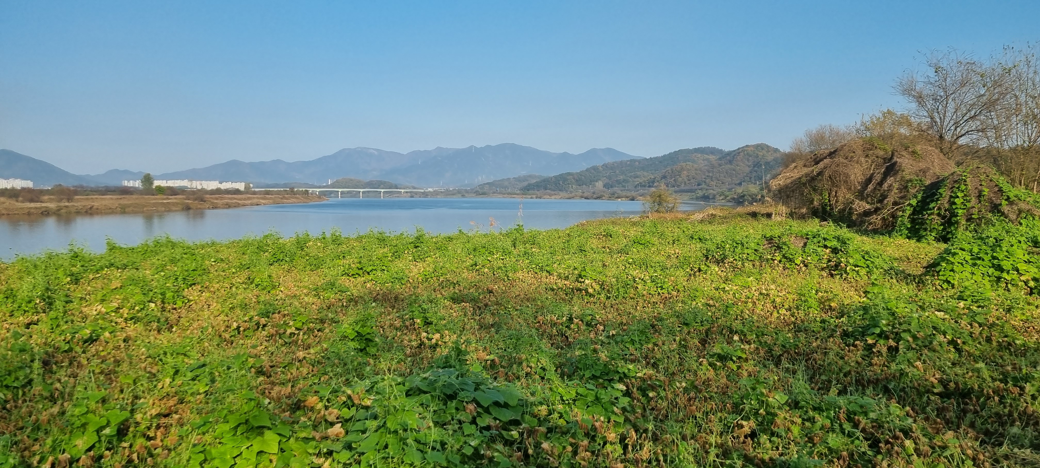 대구시달성군의 현풍공영버스정류장에서 이번 낙동강 따라 걷기의 출발지인 구지오토캠핑장입구까지는 택시로 이동했습니다. 낙동강 제방 안쪽의 넓은 밭이 푸르른 것은 단무지용 무를 재배하기 때문이라는 것을 기사분이 말씀해주어 알았습니다.