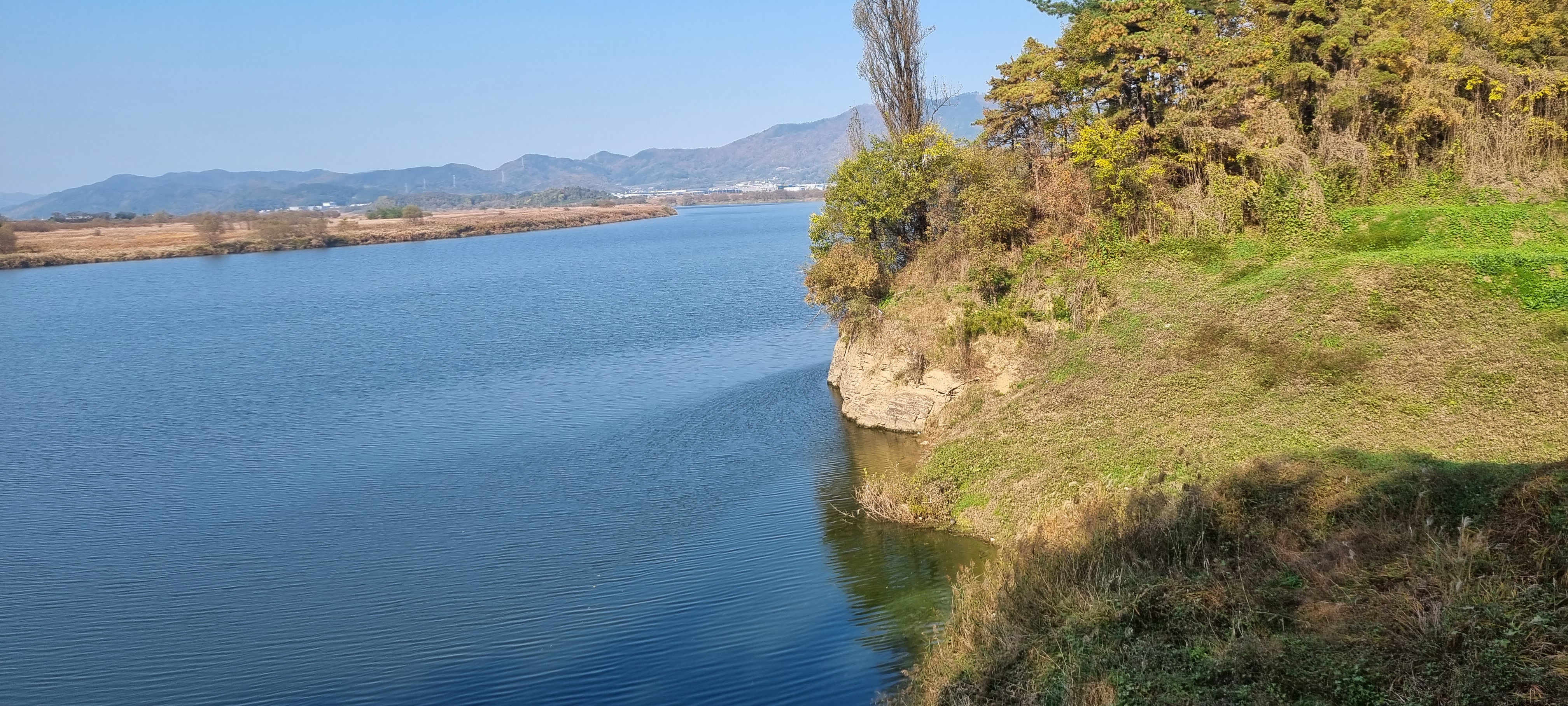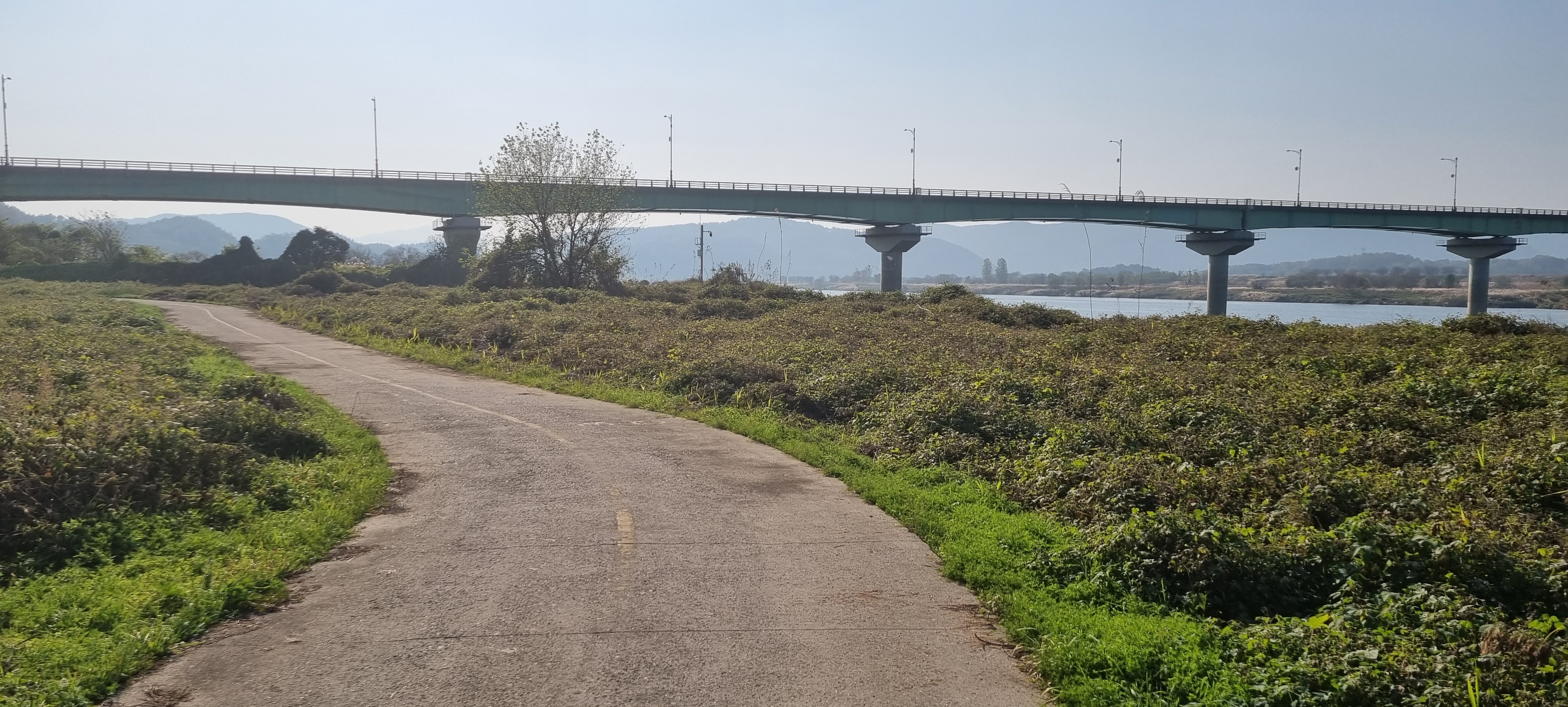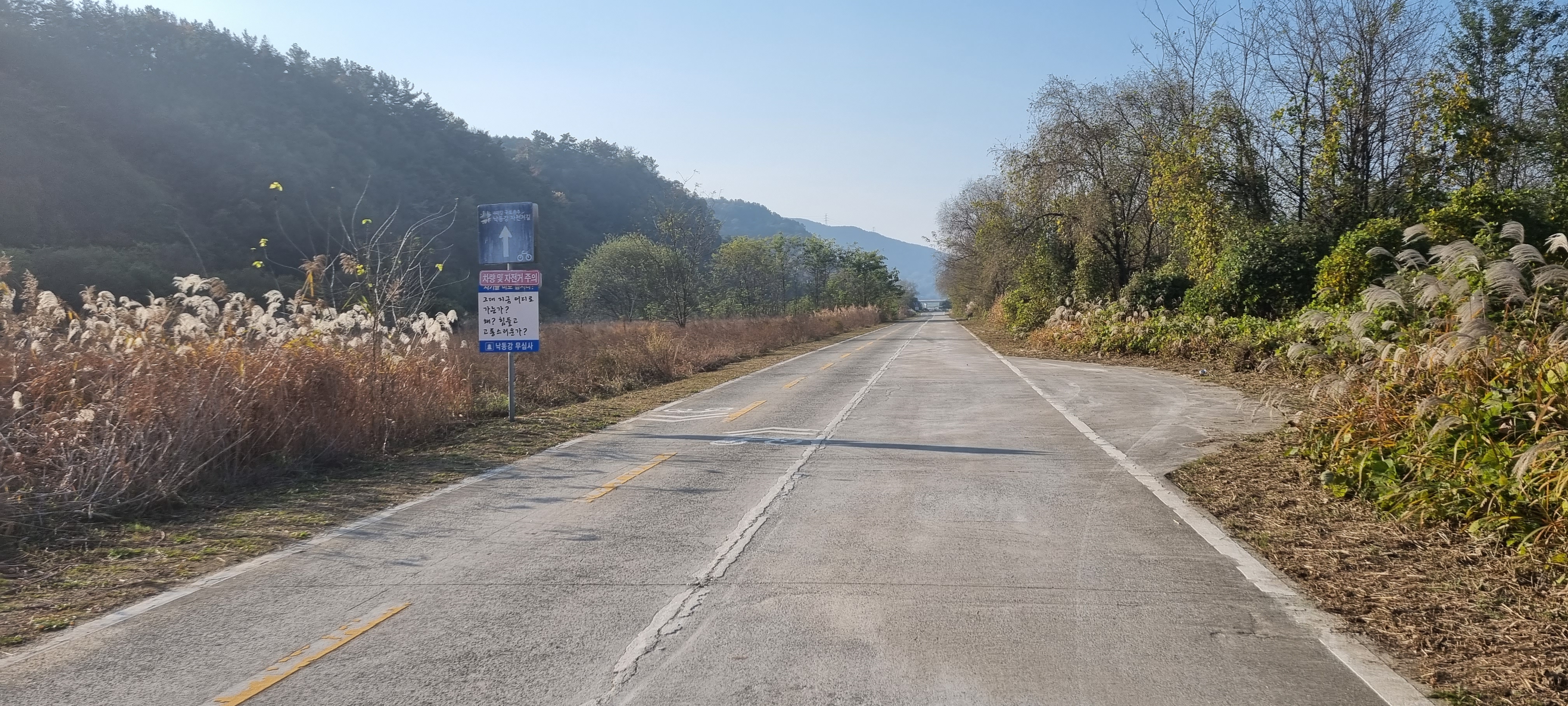 강변을 따라 S 자로 커브를 그리며 낸 데크 길을 걸어 대암양수장 앞에 이르렀습니다. 꽤 큰 2층 건물의 텅 빈 마당에 승용차 한 대 보이지 않는 것으로 보아 이 양수장은 가동되지 않는 것 같습니다. 고개를 넘어 대암보건진료소를 지나 차도를 따라 걷다가 대암1제 제방길로 올라섰습니다. 우곡교를 다리 밑으로 지나 국가산담남로에 접해 낸 낙동강자전거도로로 들어서 그대로 직진하다가 대암2리2정류장 앞에서 제방길로 올라섰습니다.