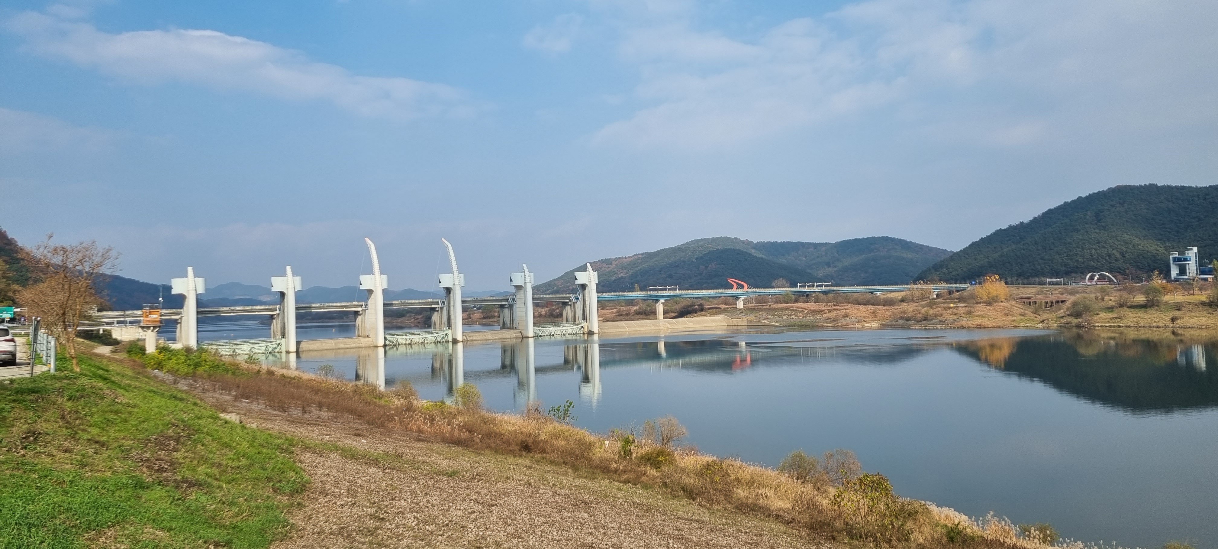 공도교를 건너 합천 땅에 발을 들였습니다. 합천창녕보그린생태공원을 지나 낙동강 우안의 외삼학제에 낸 자전거길을 따라 걷다가 뒤를 돌아보자 외관이 날렵한 5개의 보가 주변 풍광과 잘 어울려 사진을 찍었습니다. 곧게 뻗어나간 외삼학제 제방이 황강이 낙동강에 흘러드는 합류점에 이르러 오른쪽으로 휘어 이어졌습니다.