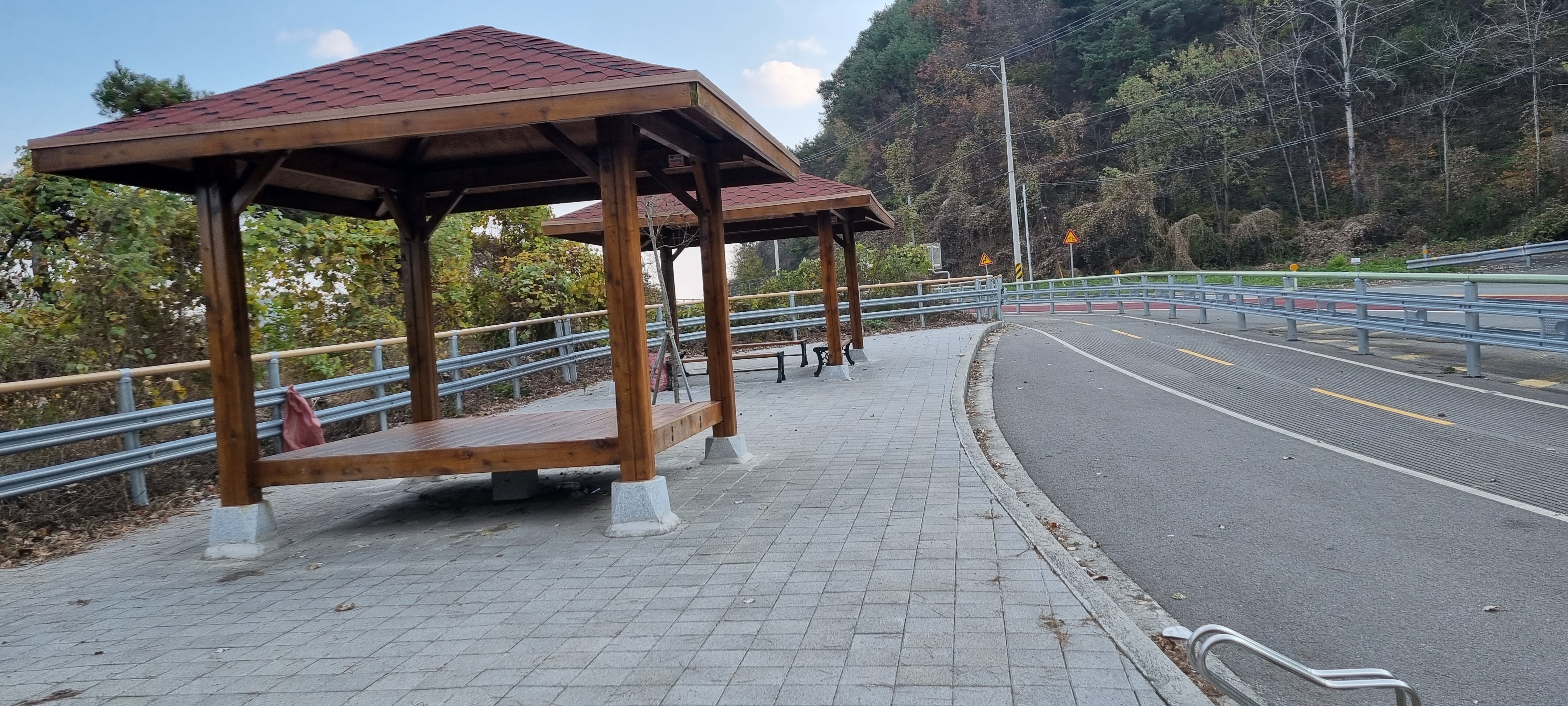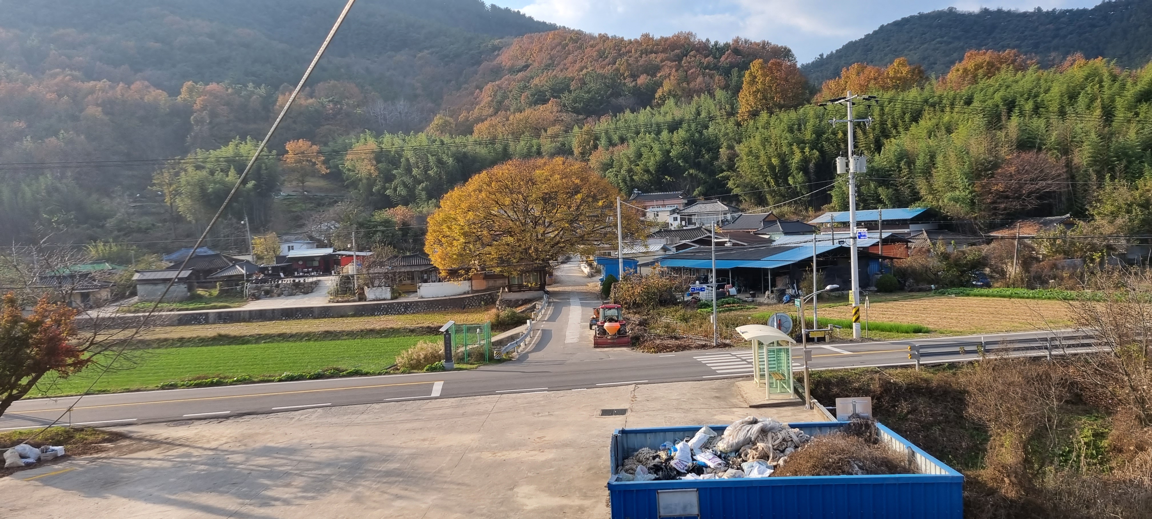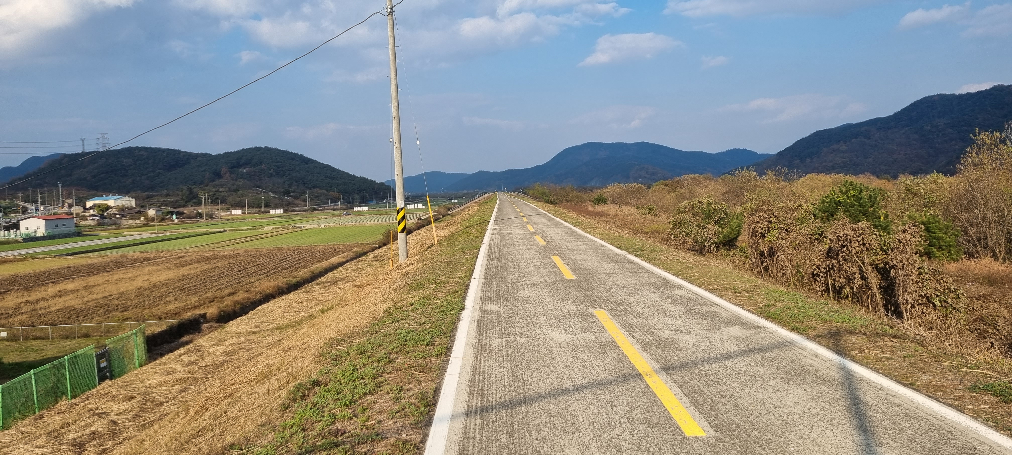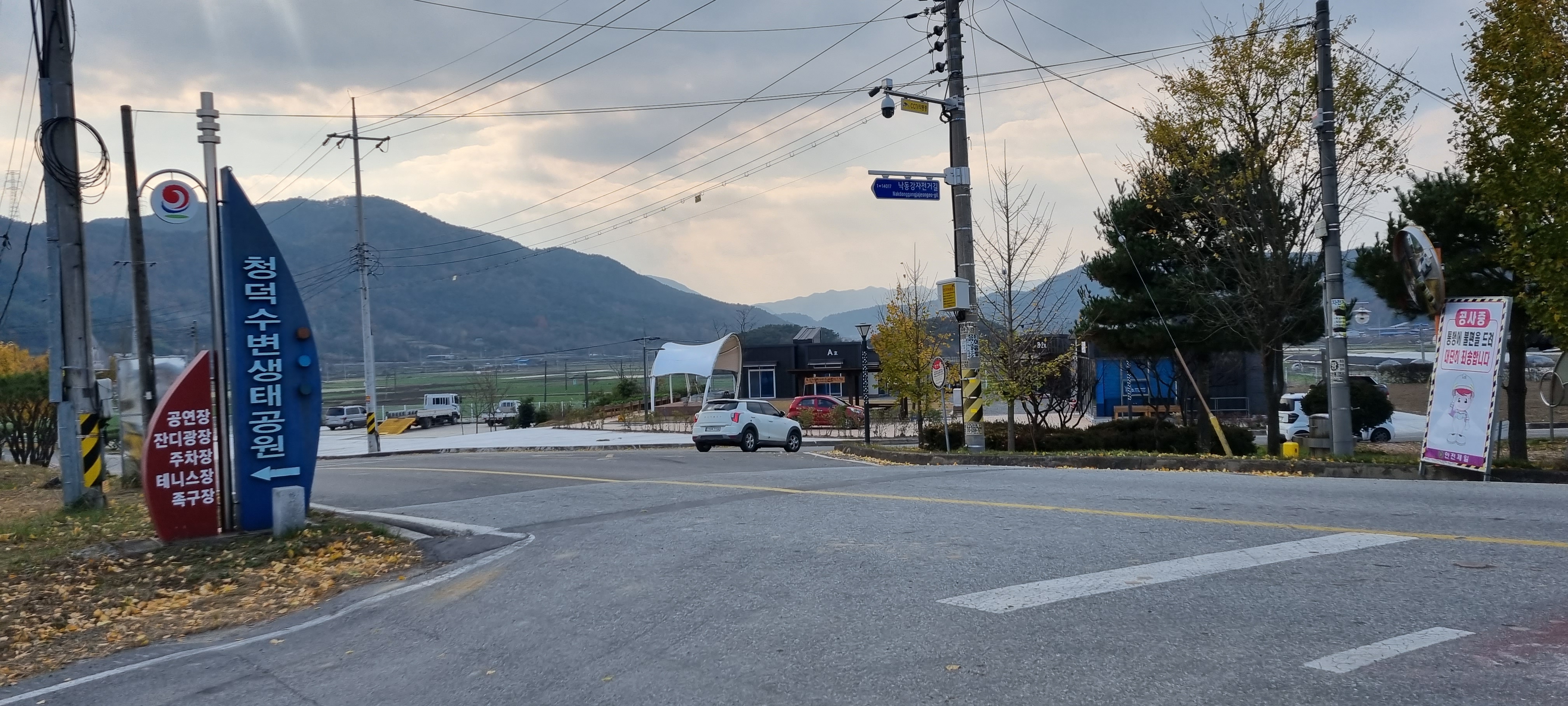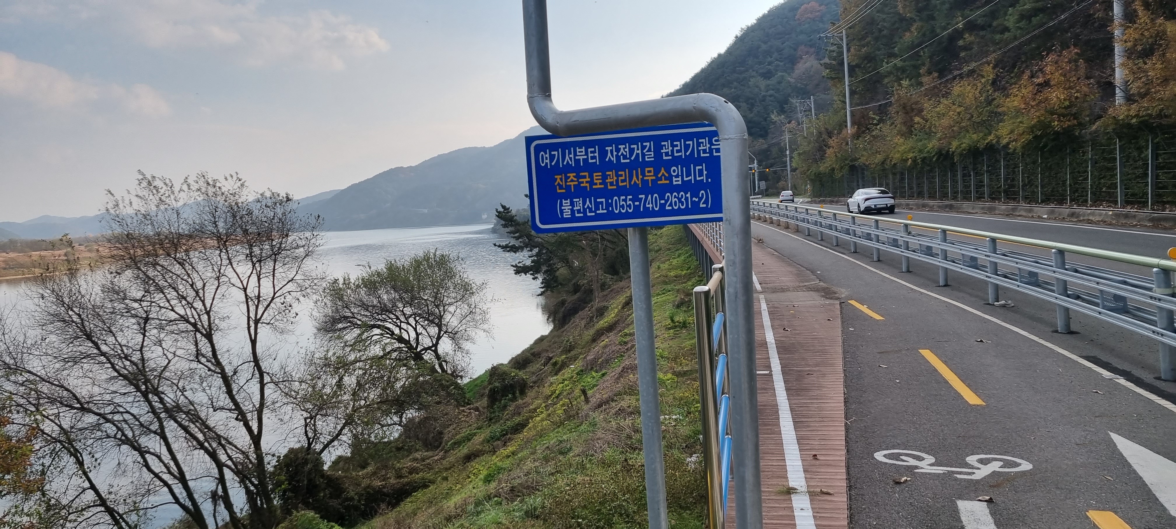 15시4분 하적포정류장을 지났습니다. 적포제로 들어서 자전거길을 따라 걷다가 길 위에서 죽음을 맞이한 사마귀를 보았습니다. 색상이 녹색에서 갈색으로 바뀐 것을 빼고는 살아 있을 때의 모습을 그대로 간직하고 있어 저도 모르게 경건한 마음이 일었습니다. 적포3배수문을 지나 하적포정류장에서 이르자 길 건너 마을 입구에 단풍이 노랗게 곱게 든 노거수 느티나무가 의젓해 보여 카메라에 옮겨 담았습니다. 제방 길이 끝나고 차도 옆 강변 길로 들어서자 “여기서부터 자전거길 관리기관은 진주국토관리사무소입니다.”라는 안내판이 세워져 있었습니다. 안내판을 보고 자전거길 관리기관이 낙동강유역횐경청에서 진주국토관리사무소로 바뀐 것은 알았지만 왜 관리기관이 바뀌어야 하는가는 파악하지 못했습니다.
