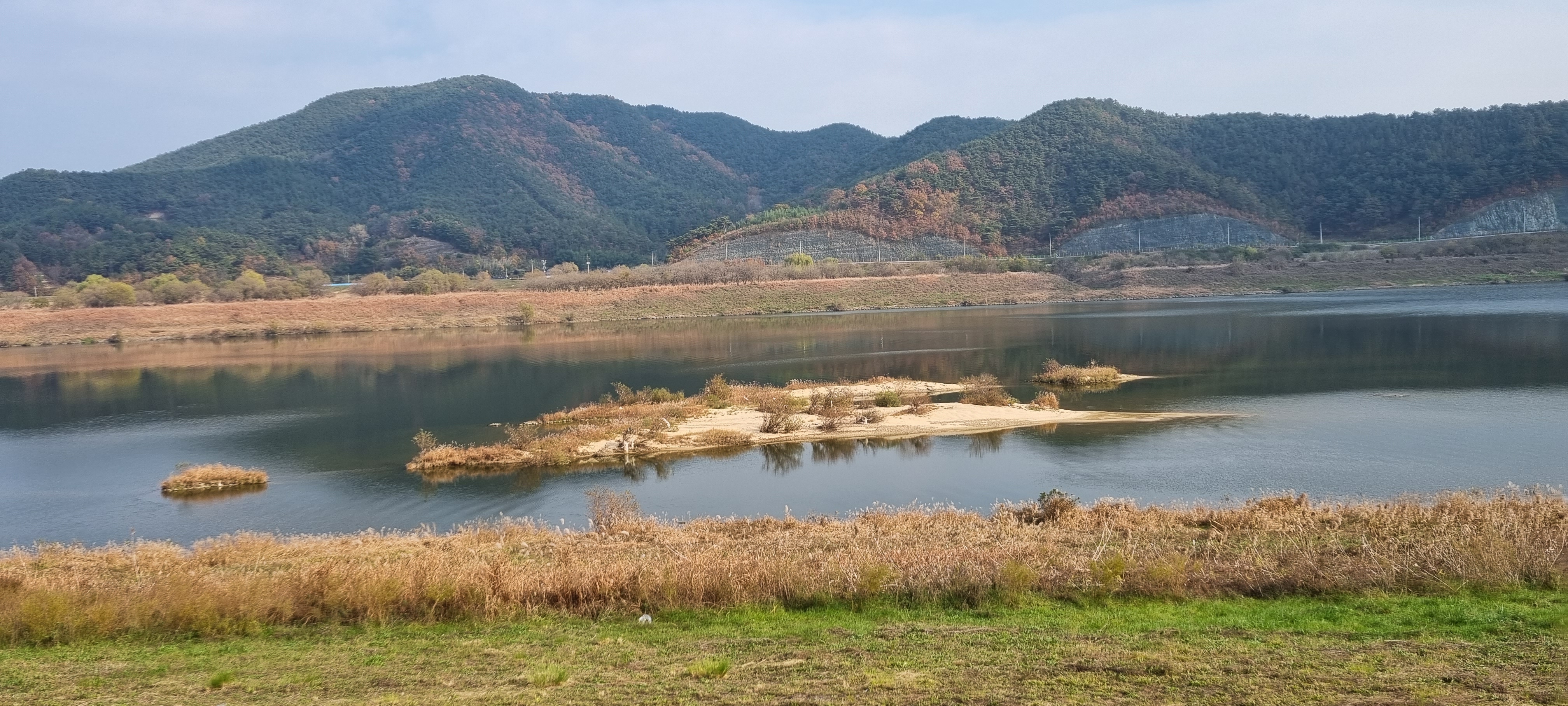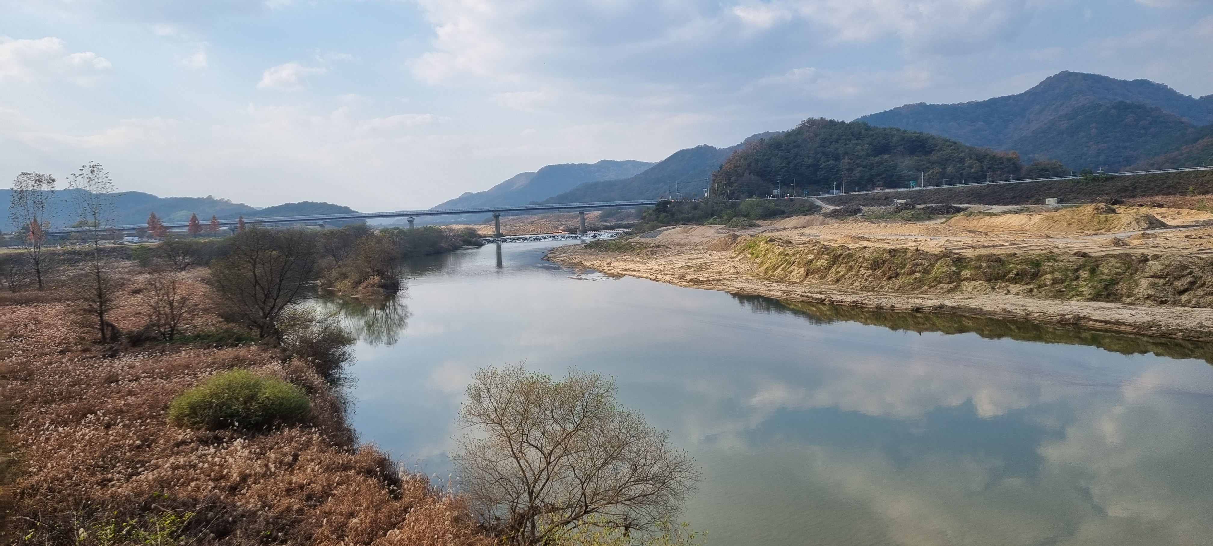 왼쪽으로 완만하게 휘어져 흐르는 낙동강을 따라 얼마 걷지 않아 저 멀리 다리 하나가 희미하게 보여, 지도에서 확인해본즉 그 다리는 이번 탐방의 끝점인 적포교였습니다. 적포교를 향해 유유히 흐르는 낙동강 강변의 정경도 눈길을 끌었지만 강물에 투영된 흰 구름의 몸놀림도 그에 못지않게 고혹적이었습니다.