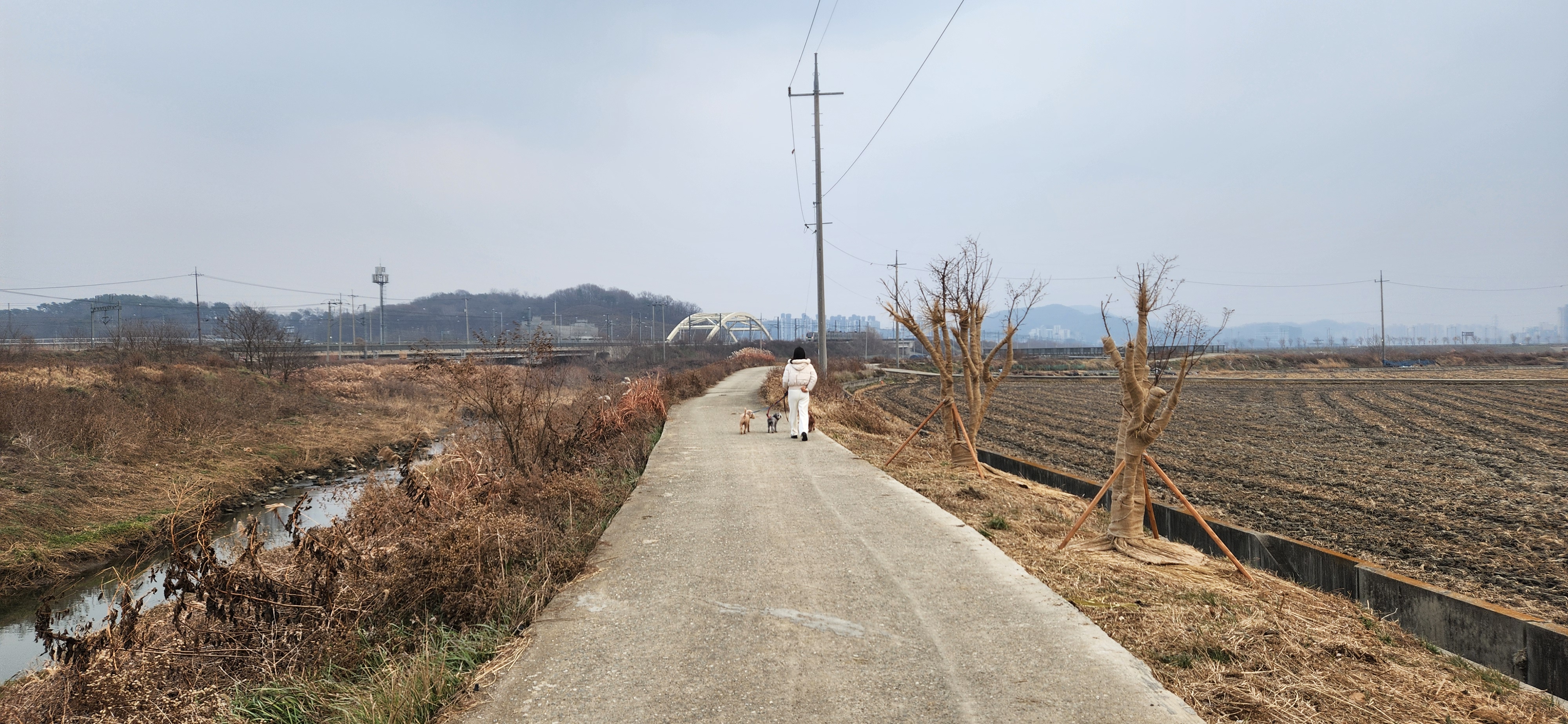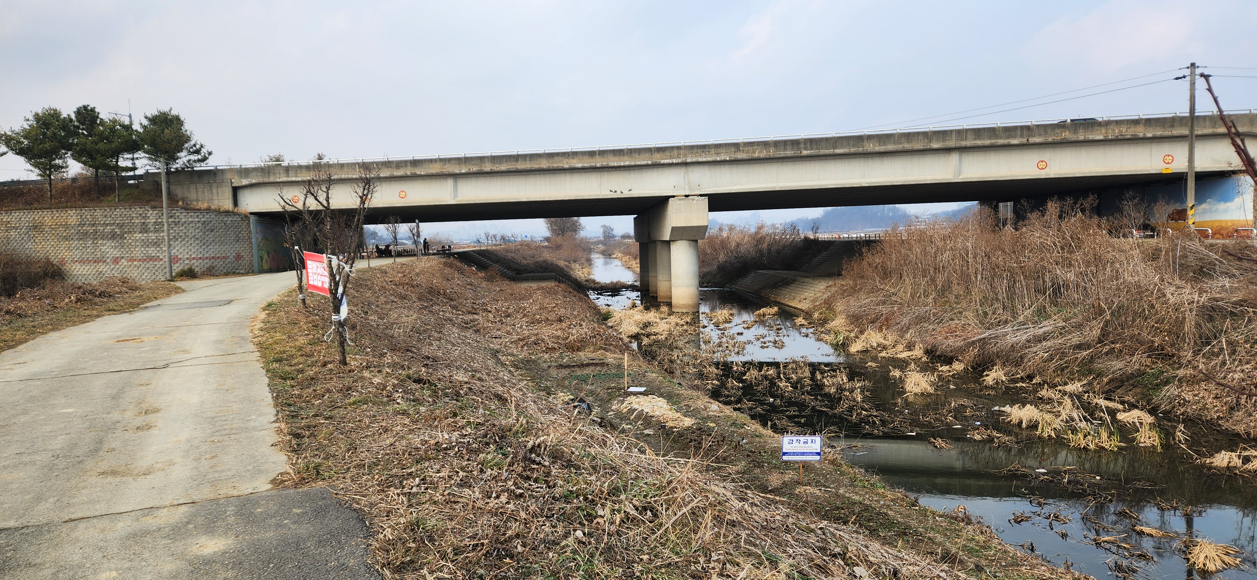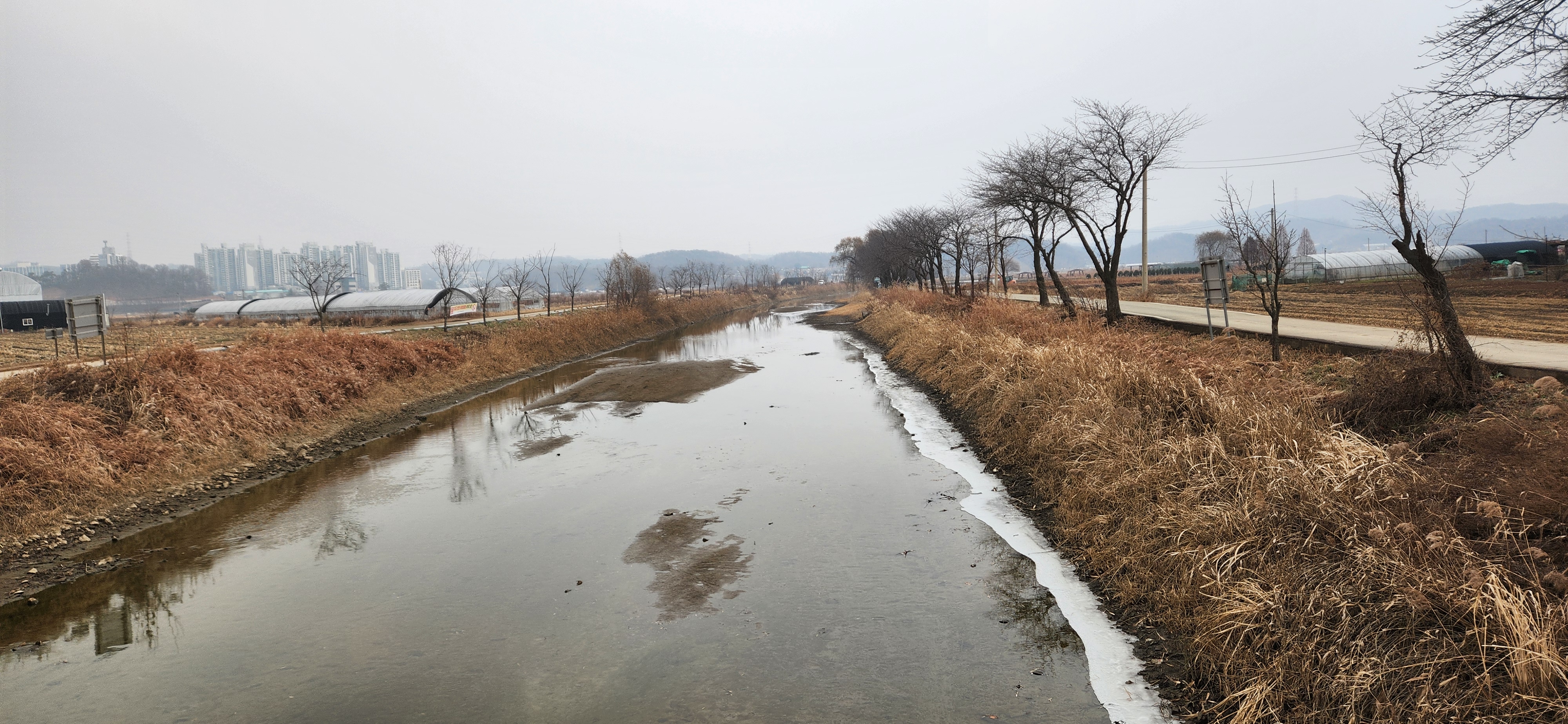 15시51분 은행천/보통천 합류점에 이르렀습니다. 수타박사 앞 하중로를 건너 다시 보통천 좌안 길로 내려섰습니다. 이어서 시흥대로가 지나는 하중2교를 밑으로 지난 다음 서해선 전철을 막 지나 다다른 곳이 은행천과 보통천이 만나는 합류점이었습니다. 이 합류점에서 조금 더 걸어 만난 작은 다리를 건너자 드넓은 벌이 눈 앞에 펼쳐졌습니다. 이 넓은 벌은 간척지인 것 같은데 확인하지는 못했습니다. 다리를 건너 신현역으로 가는 길은 은계호수공원에서 흘러내려오는 은행천을 거슬러 올라가는 은행천 우안길로 신현역 앞까지 이어져 걷기에 좋았습니다.