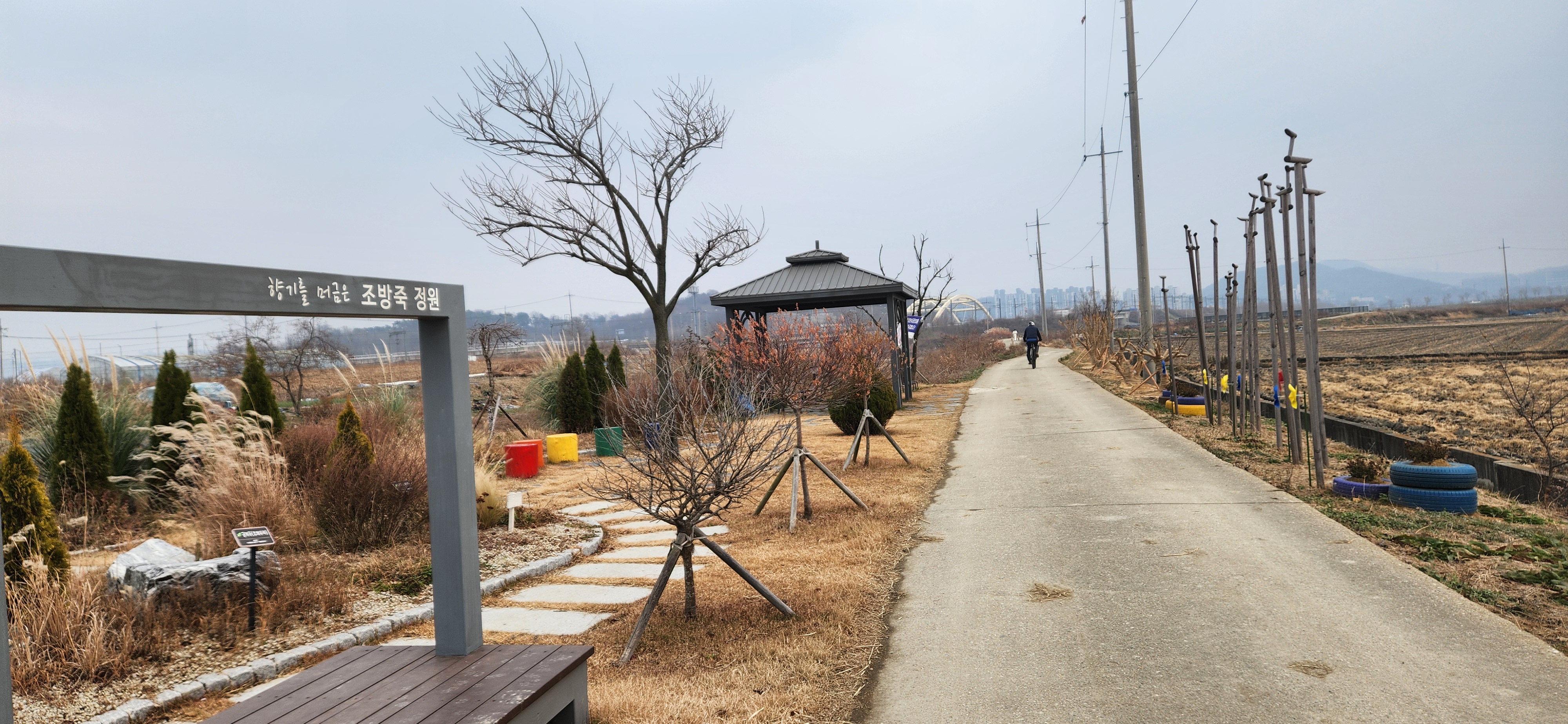 합류점 아래 다리를 건너 조방죽 정원을 지났는데, 흥미로운 것은 조방죽 이름의 유래였습니다. 안내판의 소개 글에 따르면 조방죽이란 농림부 기사출신인 조성근이라는 분이 1969년 매립허가를 받아 뻘이었던 곳의 조수를 막아 논으로 만든 방죽에서 기원한 것이라 합니다. 조수를 막아 방죽을 만든 곳이 여기뿐이랴만 유독 이 방죽을 조방죽이라 부르는 것은 농림기사 조성근을 기리는 것이기도 해 조방죽의 조를 기사분의 성에서 따온 것일 수도 있 다 싶어 적합하다는 생각이 들었습니다.