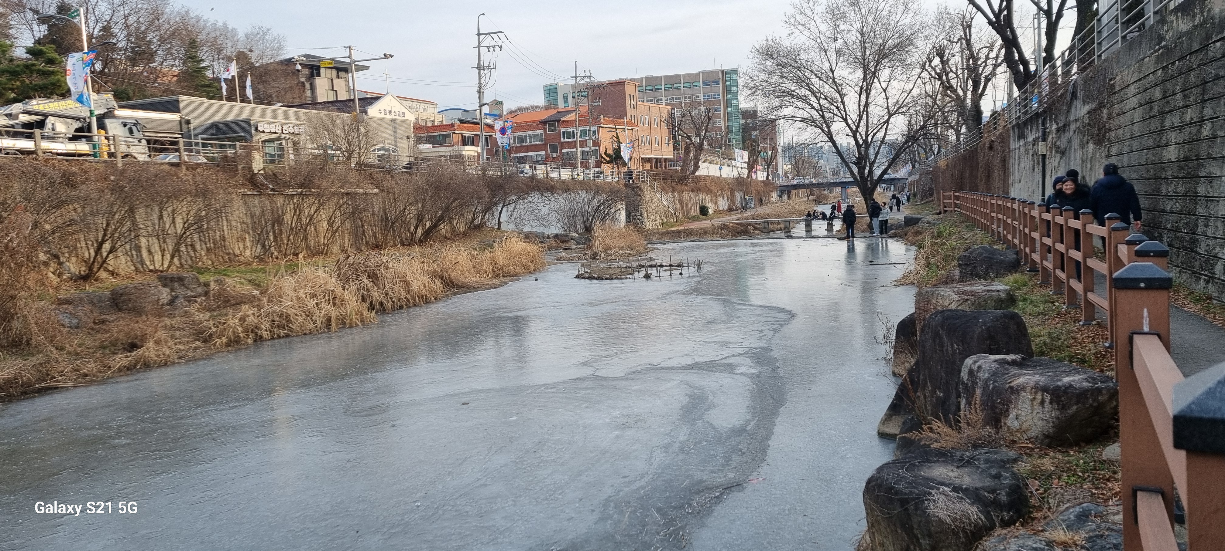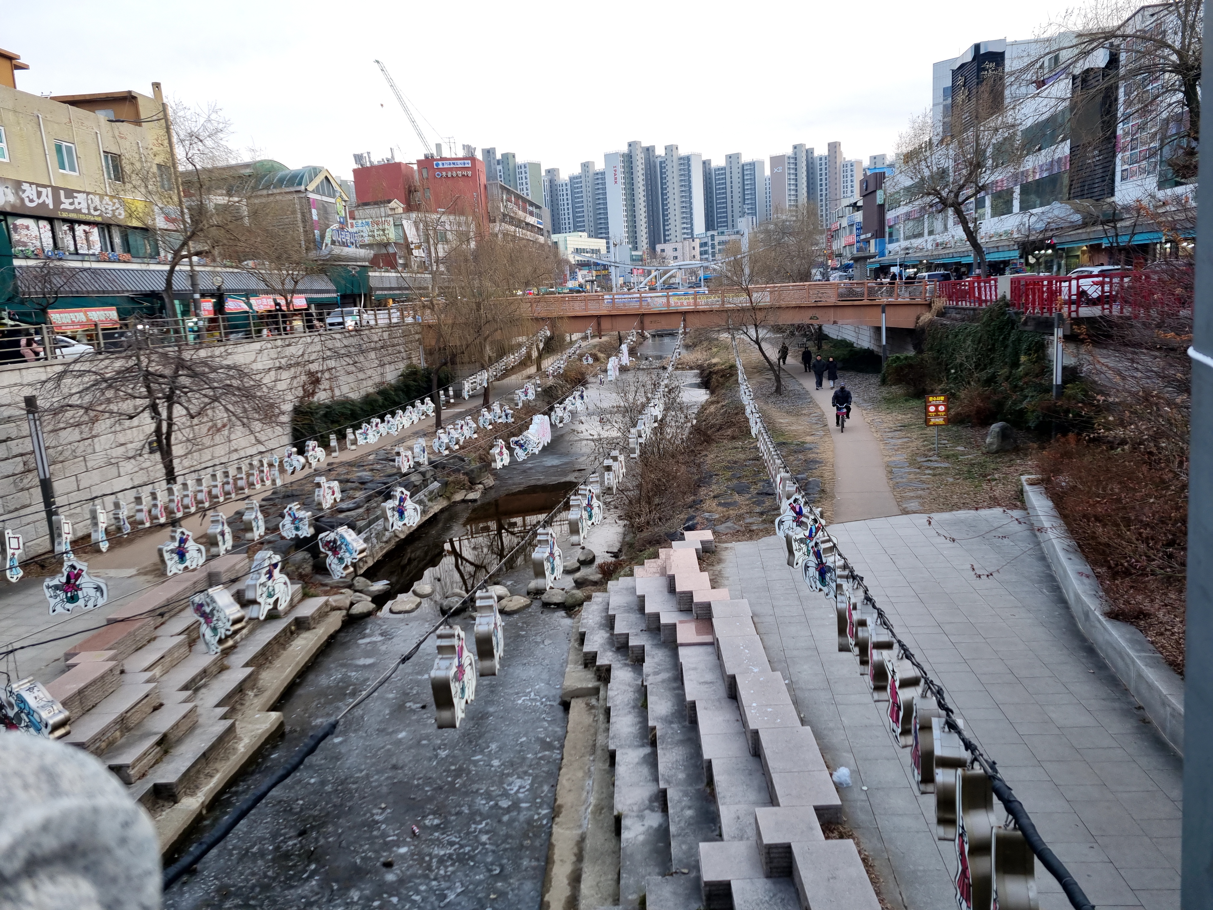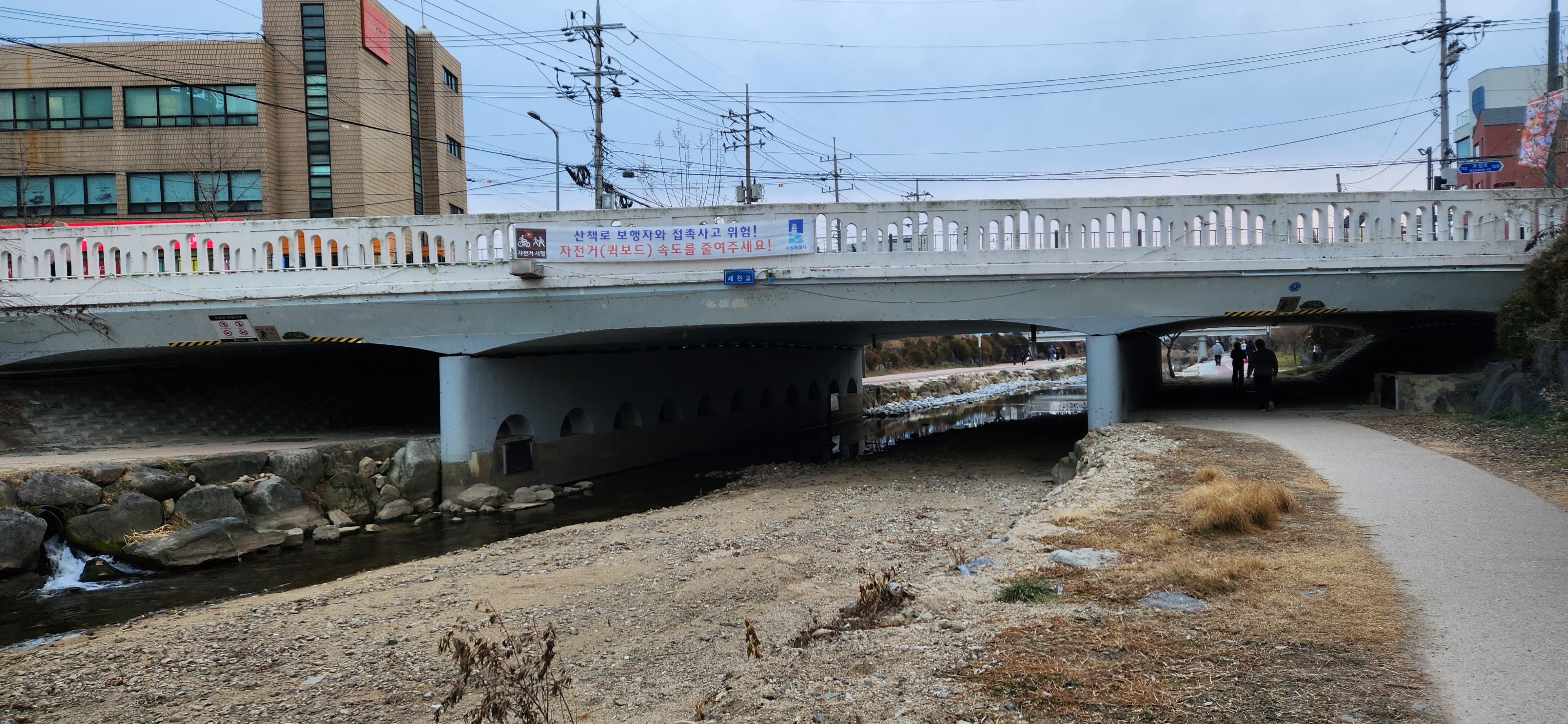 수변산책로를 걸으면서 반쯤 얼은 저수지를 보았습니다. 나머지 얼지 않은 수면도 소한이나 대한을 겪고 나면 꽁꽁 얼을 것입니다. 데크길을 따라 여러 차례 오르락내리락해 다다른 제방을 건너 그 아래 광교공원으로 이동했습니다. 거란의 침략을 막아낸 고려의 명장 강감찬(姜邯贊, 948-1041) 장군의 동상을 사진 찍은 후 수원천 제1교인 경기교 아래로 내려가 좌안의 천변 길로 내려섰습니다. 길 건너 수원시 상수도사업소가 가까이 보이는 제2교 창훈교를 거쳐 연화교를 지나 무명교 아래에 이르자 공사로 길이 막혀 제방으로 올라섰습니다. 다리 이름이 한자 ‘迎練橋’(영련교)로 표기된 다리를 건너자 제가 걷고 있는 하천이 ‘지방하천 수원천’임을 알려주는 표지판이 서 있어 반가웠습니다.