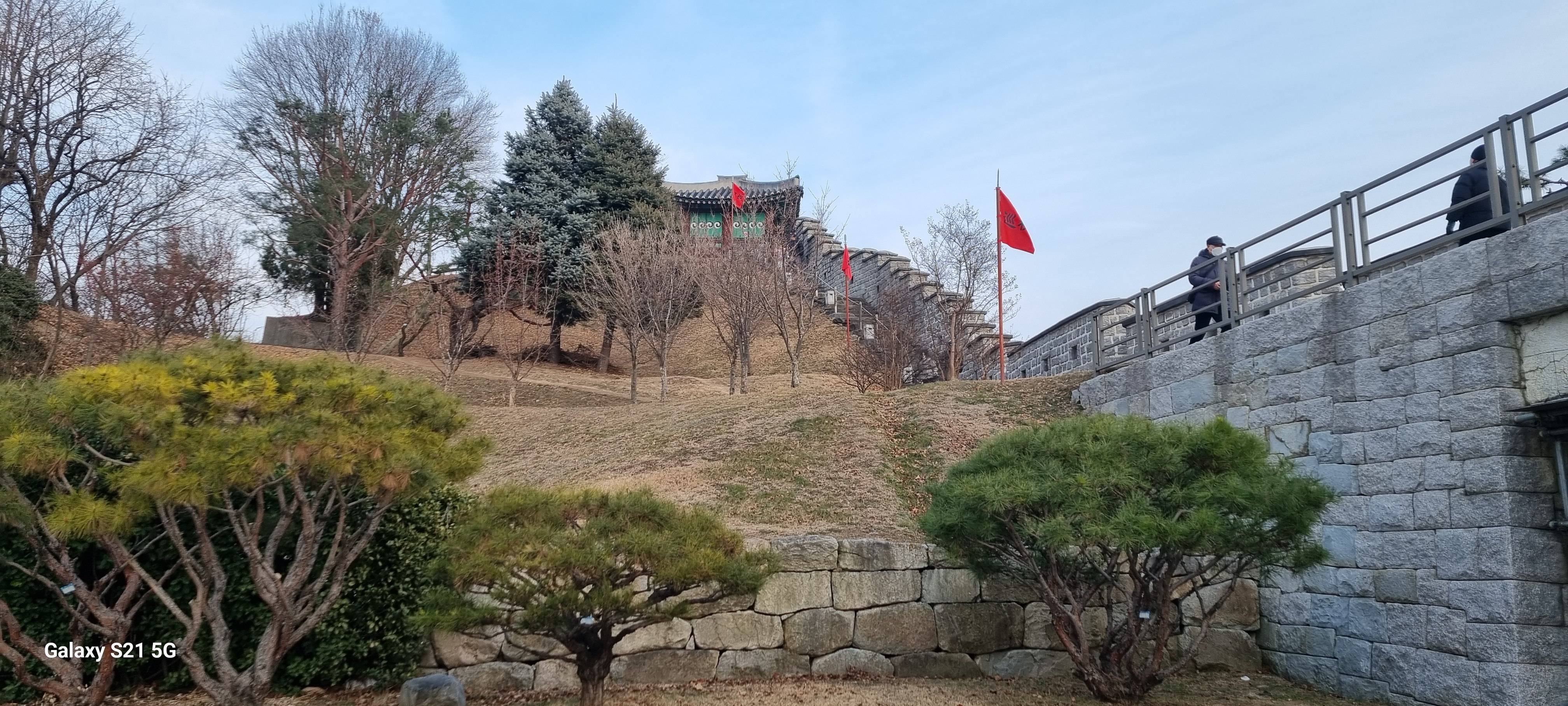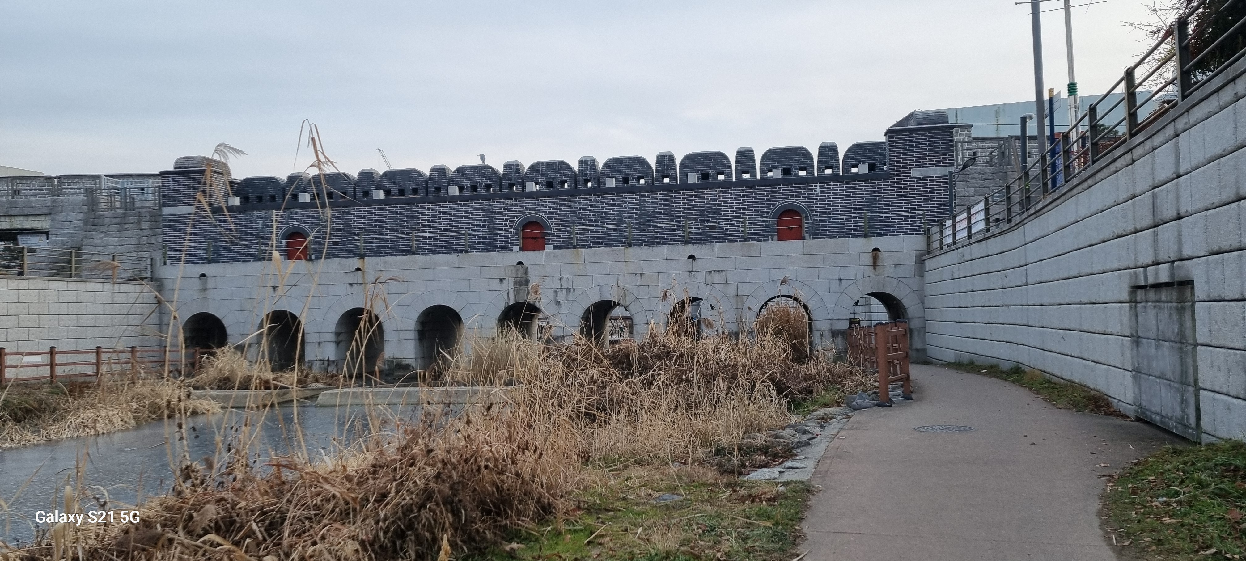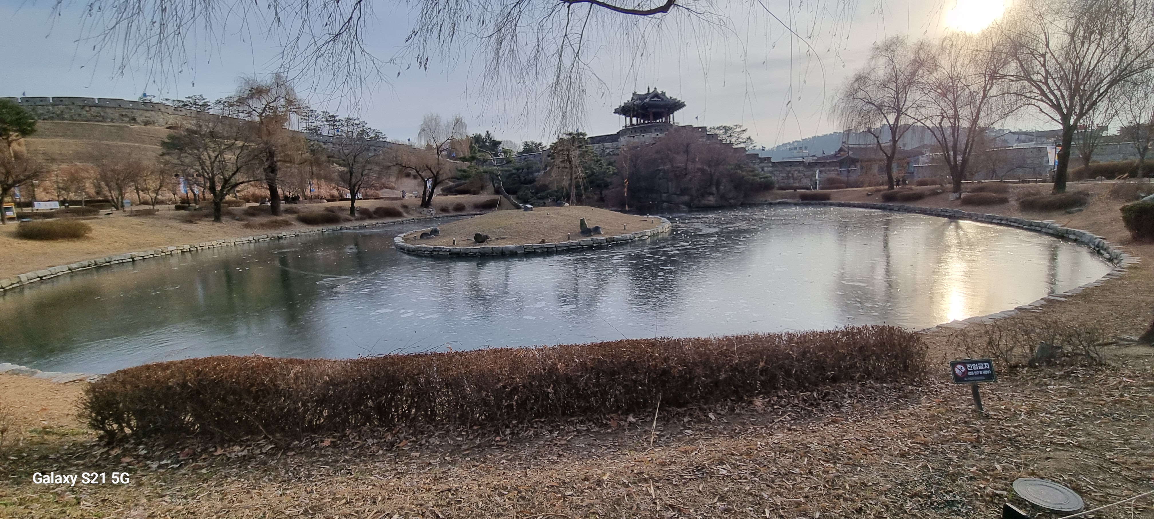 15시58분 작은 연못 용연(龍淵)을 들렀습니다. 영련교에서 우안의 천변길로 내려서 연무교와 방화2교를 차례로 지나 방화교 위로 올라서자 서쪽으로 화성의 북동포루가 보였습니다. 방화교를 건너 동쪽의 동북각루 아래에 자리한 아담한 연못인 용연을 카메라에 옮겨 담았습니다.