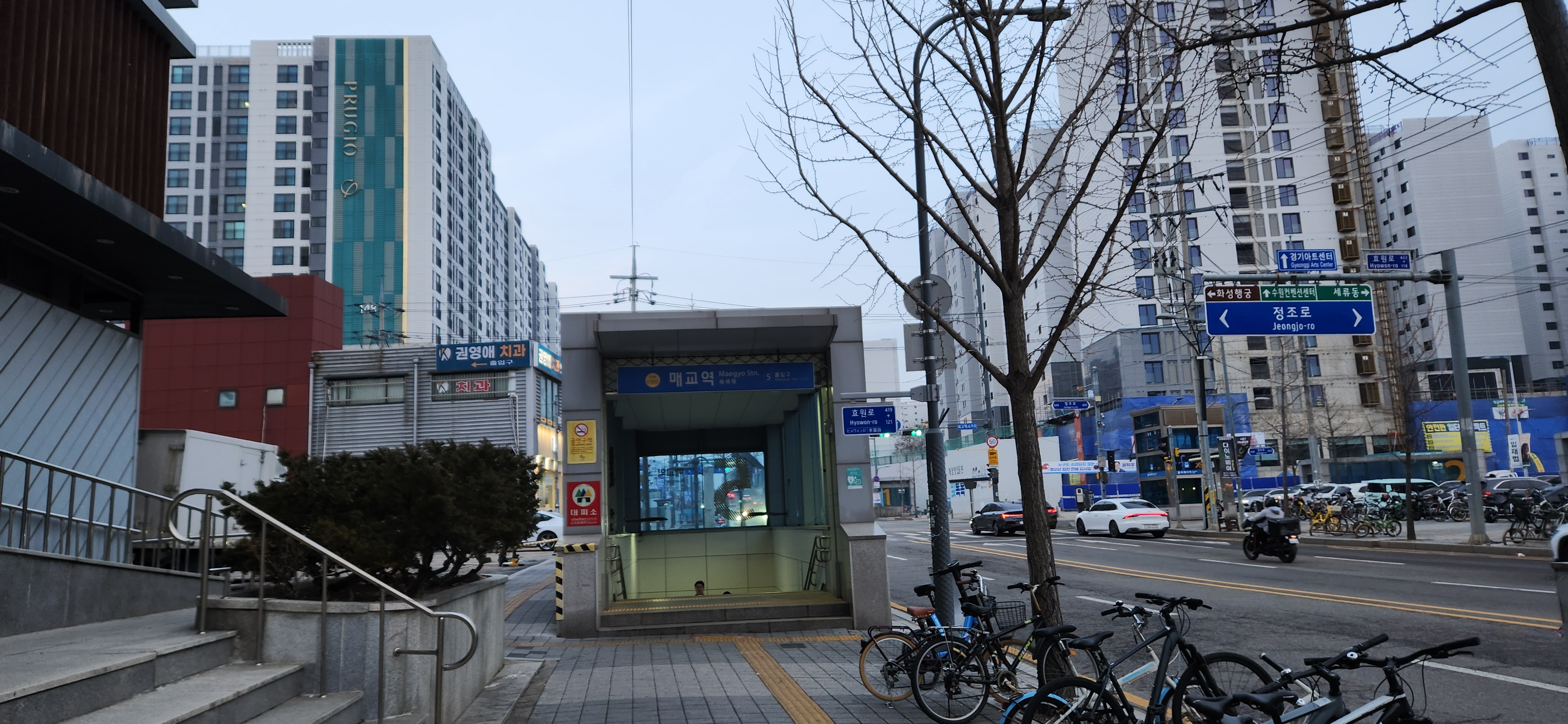 17시15분 매교역에 도착해 수원천 1구간의 탐방을 마쳤습니다. 수원천이 화성의 성곽 안을 흐르는 것은 화홍문에서 남수문까지로 1Km 남짓 됩니다. 동쪽으로 동남각루(東南角樓)가 가까이 보이는 남수문을 지나 제방으로 올라선 것은 마주보고 있는 영동시장과 지동시장 입구를 보기 위해서였습니다. 또 다시 천변으로 내려가 우안길을 걸으며 빠른 속도로 내려앉는 어둠을 감지했습니다. 세천교를 건너 매교역에 도착한 시각은 일몰 10여분 전이었습니다. 광교쉼터에서 더 올라가 발원지에서 수원천 따라 걷기를 시작했다면 어둡기 전에 매교역에 다다르지는 못했을 것입니다. 매교역에서 수인분당선을 타고가다 4호선의 한대앞 역에서 환승해 산본 집으로 돌아갔습니다.