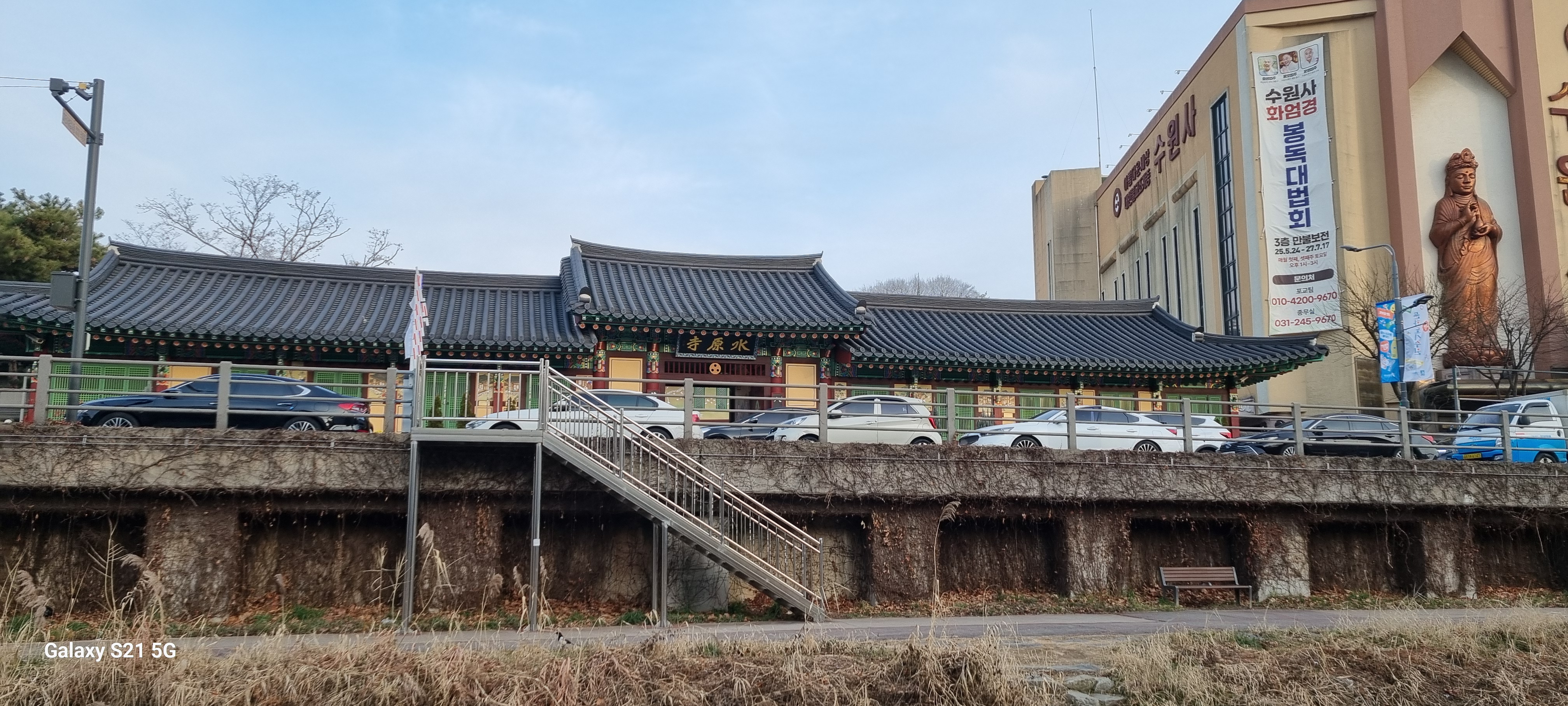 매향교를 지나 눈길이 머문 곳은 하천 건너 쪽에 자리한 조계종 수원사(水原寺)였습니다. 산골짜기를 벗어나 도심 속의 천변에 내려다 지은 수원사의 부속건물은 전통 가람과 대비되는 현대식 건물로 지어졌습니다.