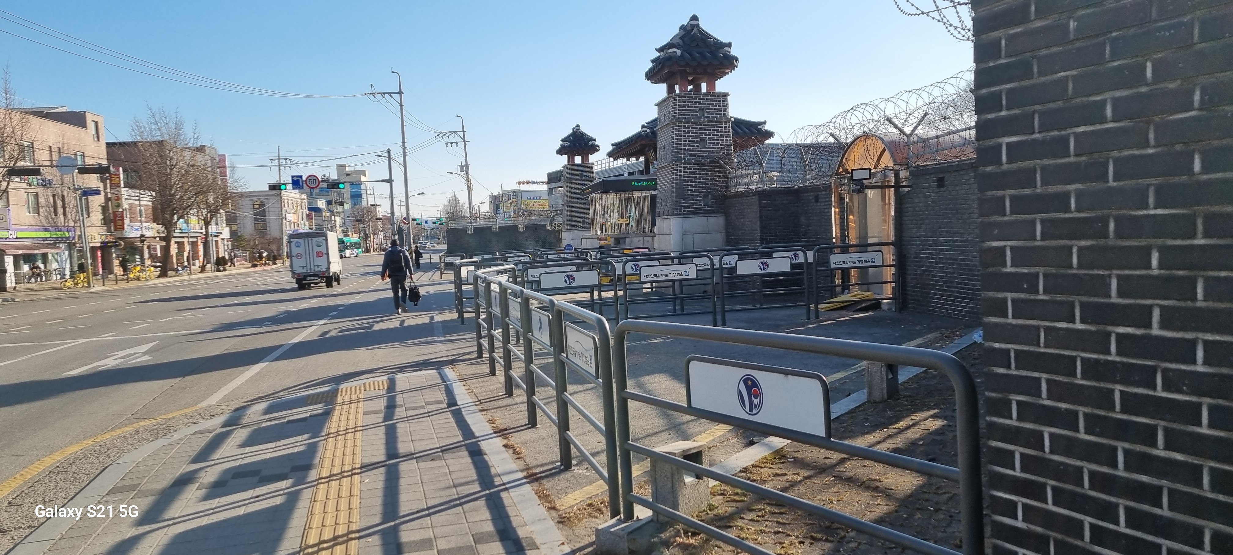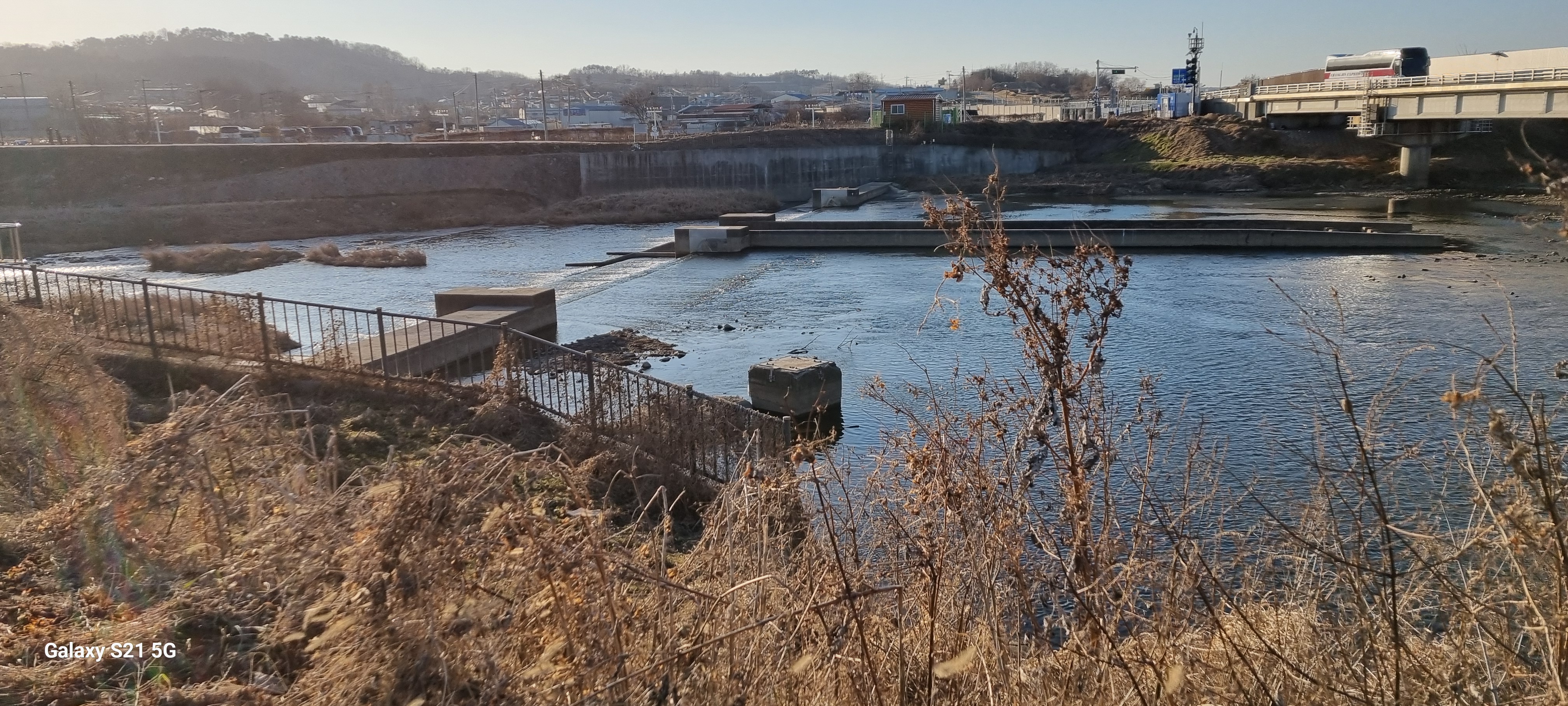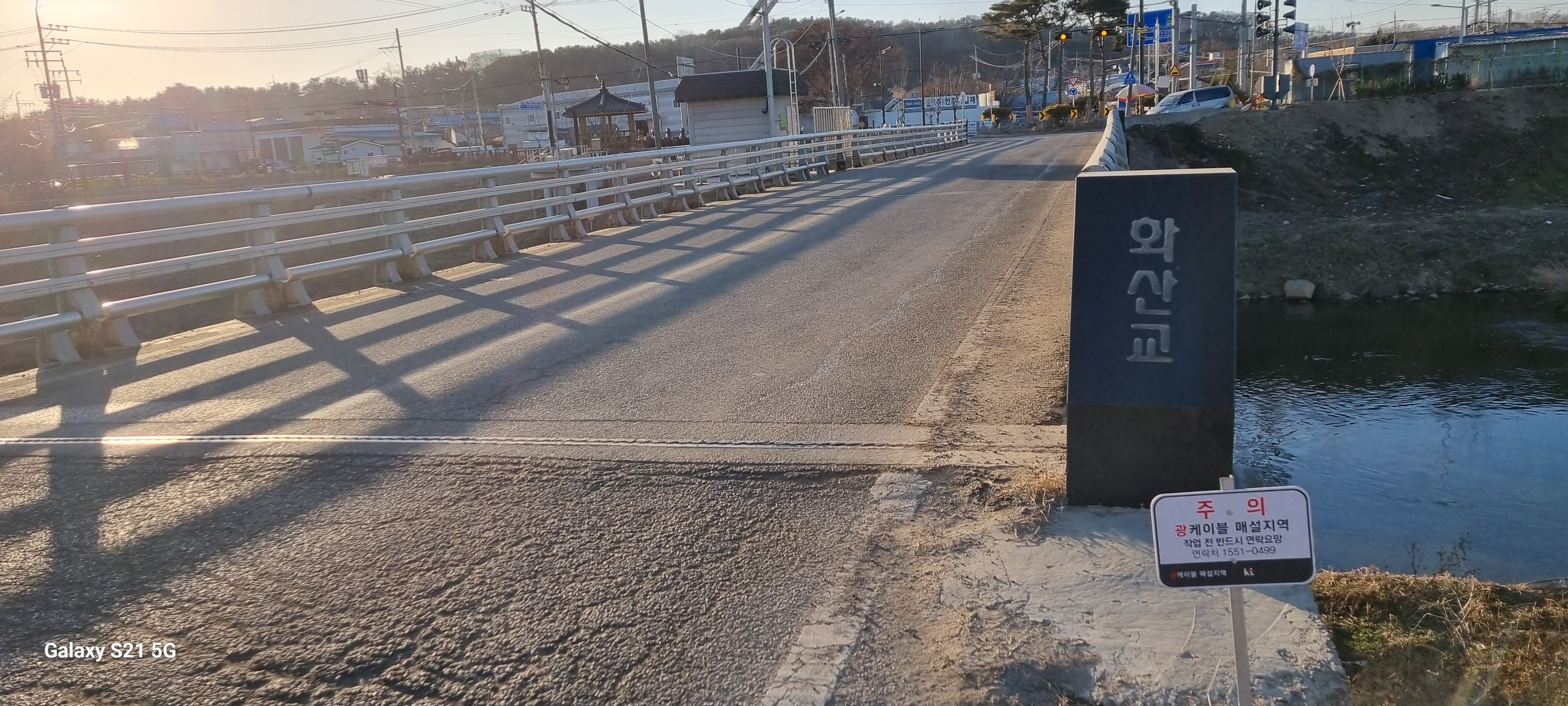 대황교를 건너 사거리에서 우회전해 1호선 철로 아래 황계지하차도를 건너 황구지천 위에 놓은 황계교 앞에 다다랐습니다. 이 다리는 황구지천을 따라 걸을 때 한 번 왔던 다리 북쪽에 차단물이 설치되어 안타깝게도 지도에 나오는 수원천과 황구지천의 합류점을 확인하지 못했습니다.