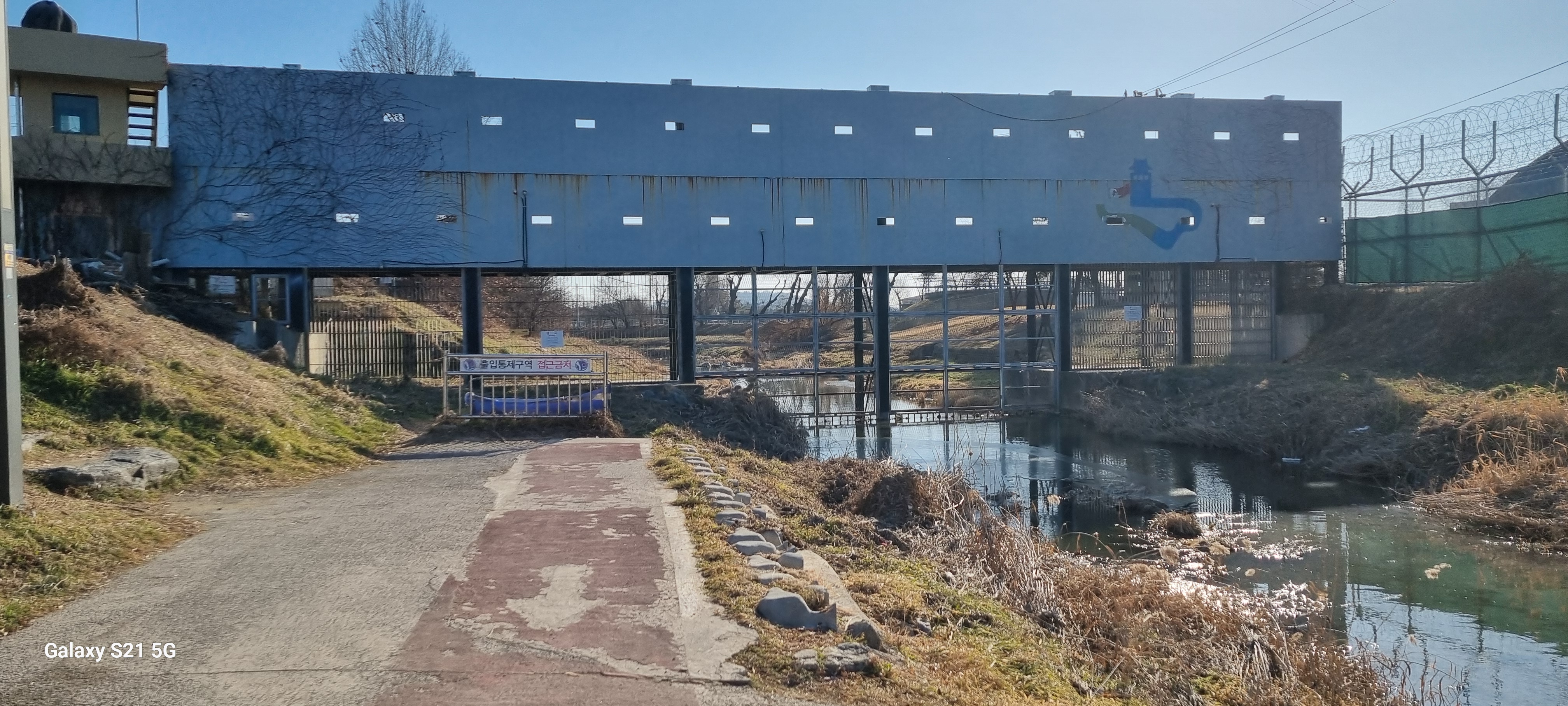 이름이 독특한 ‘카네이션 경로당’을 거쳐 다리 폭이 깨 넓어 보이는 세류대교를 지나자 앞쪽으로 1호선 전철이 보였습니다. 천변에 홀로 서 있는 갯버들 한 그루를 카메라에 옮겨 담은 후 폭이 좁은 철다리를 지나 다다른 이름 없는 다리 아래에 차단막이 설치되어 더 이상 진행하지 못하고 오던 길로 되돌아가 좌안의 반야사에 이르렀습니다. 다리 아래를 차단해 통행을 금한 것은 여기서부터 수원천은 수원비행장 안으로 흐르기 때문일 것입니다.