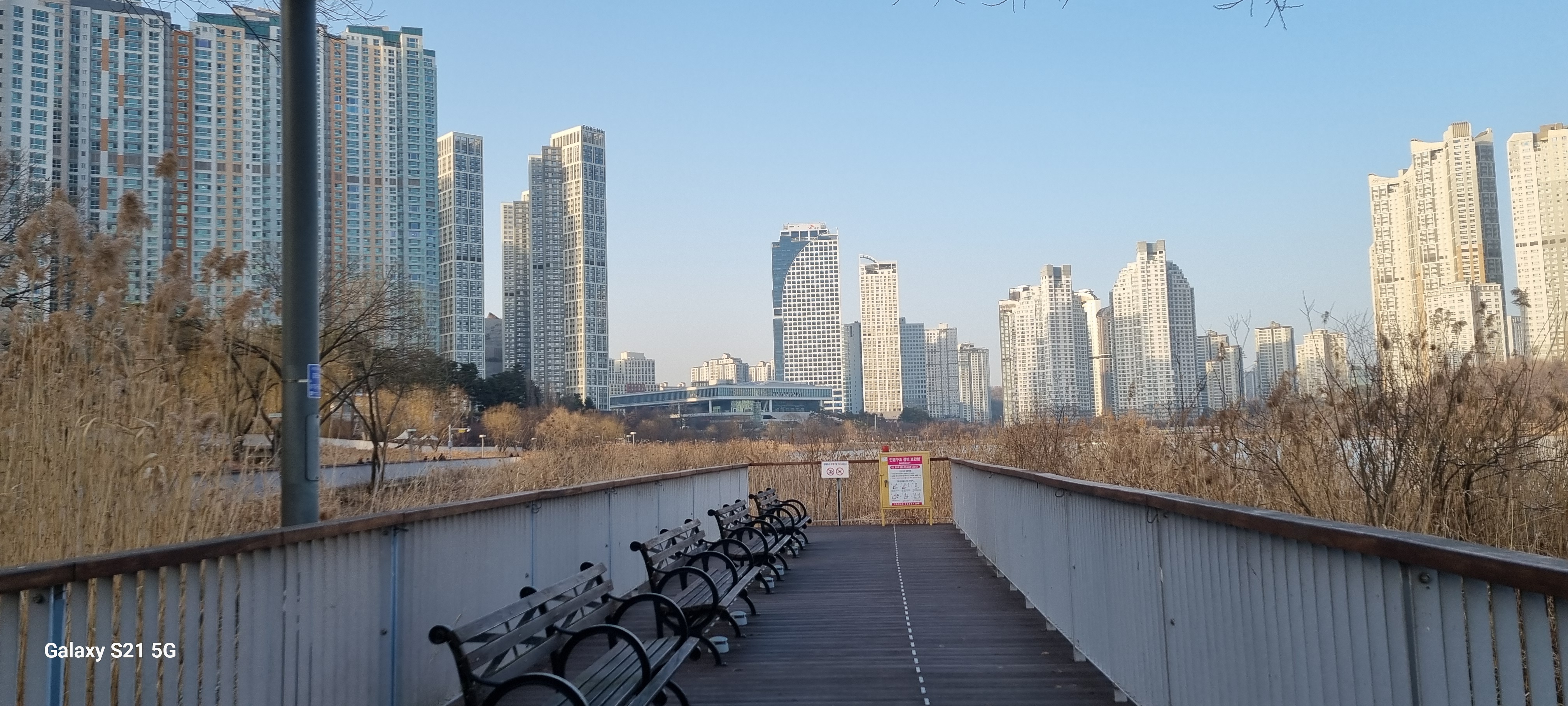 원천호수 상류의 여천을 건너 이 호수 서안길로 접어든 시각은 16시9분이었습니다. 북쪽 상류에서 남쪽 제방으로 이어지는 원천호수 서안길은 편안한 데크길로 걷기에 좋았습니다. 이번 탐방의 끝점인 매탄권선역까지는 그 거리가 5.6Km로, 서둘러야 해 떨어지기 전에 도착할 수 있을 것 같아 사진 찍는 횟수를 줄이고 발걸음을 빨리했습니다. ‘어반 레비(urban levee)’를 지나 원천호수 남쪽 제방에 이르기 얼마 전 이번 탐방 처음으로 호숫가 벤치에 앉아 쉬면서 원천호수를 조망했습니다. 길쭉한 고구마를 닮은 타원형의 원천호수는 동쪽이 야산으로, 서쪽이 고층아파트로 둘러싸여 양안(兩岸)이 극명하게 대비되었습니다.