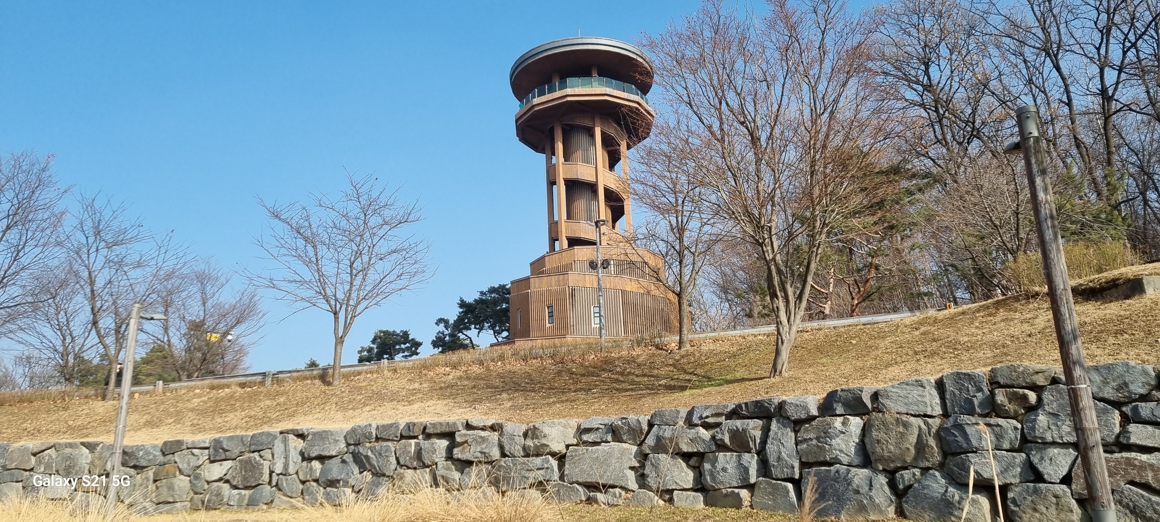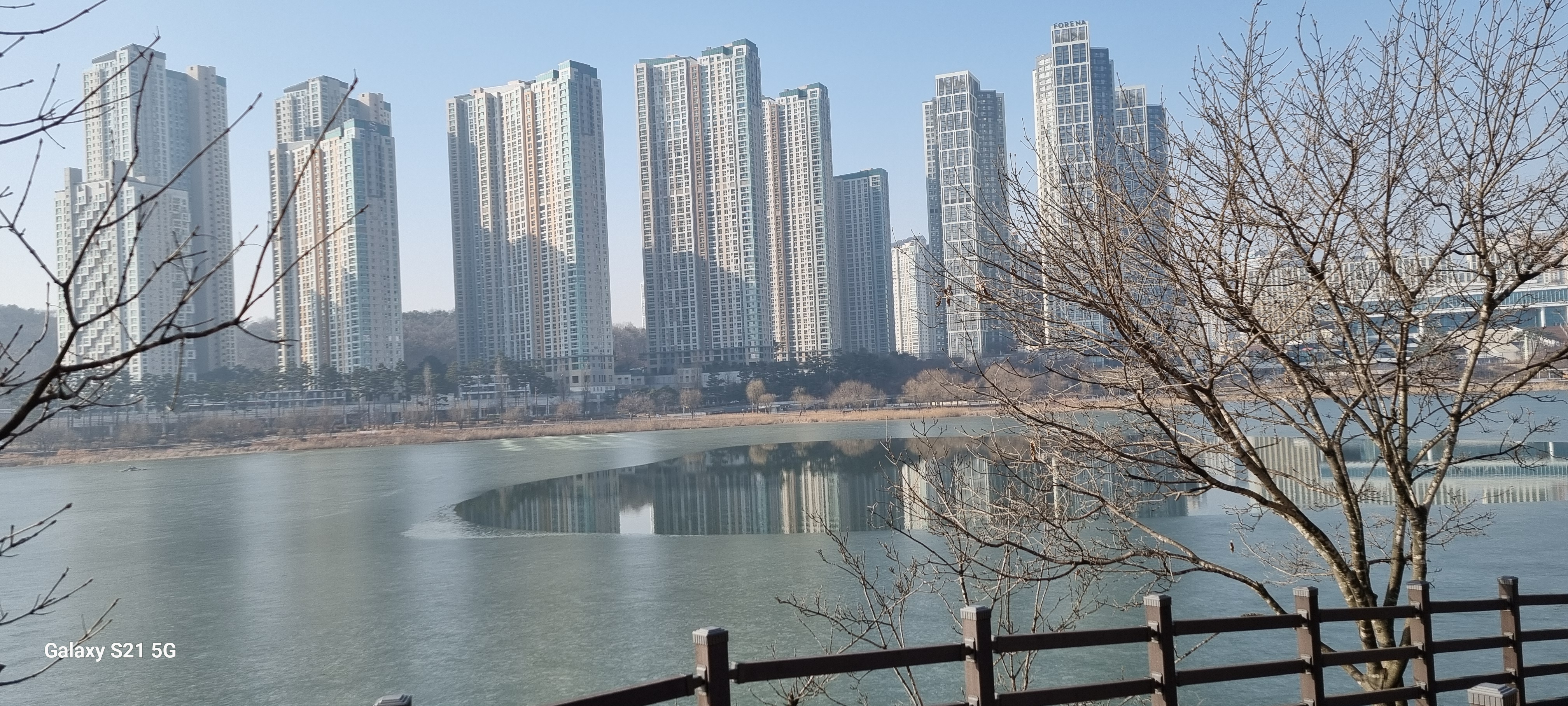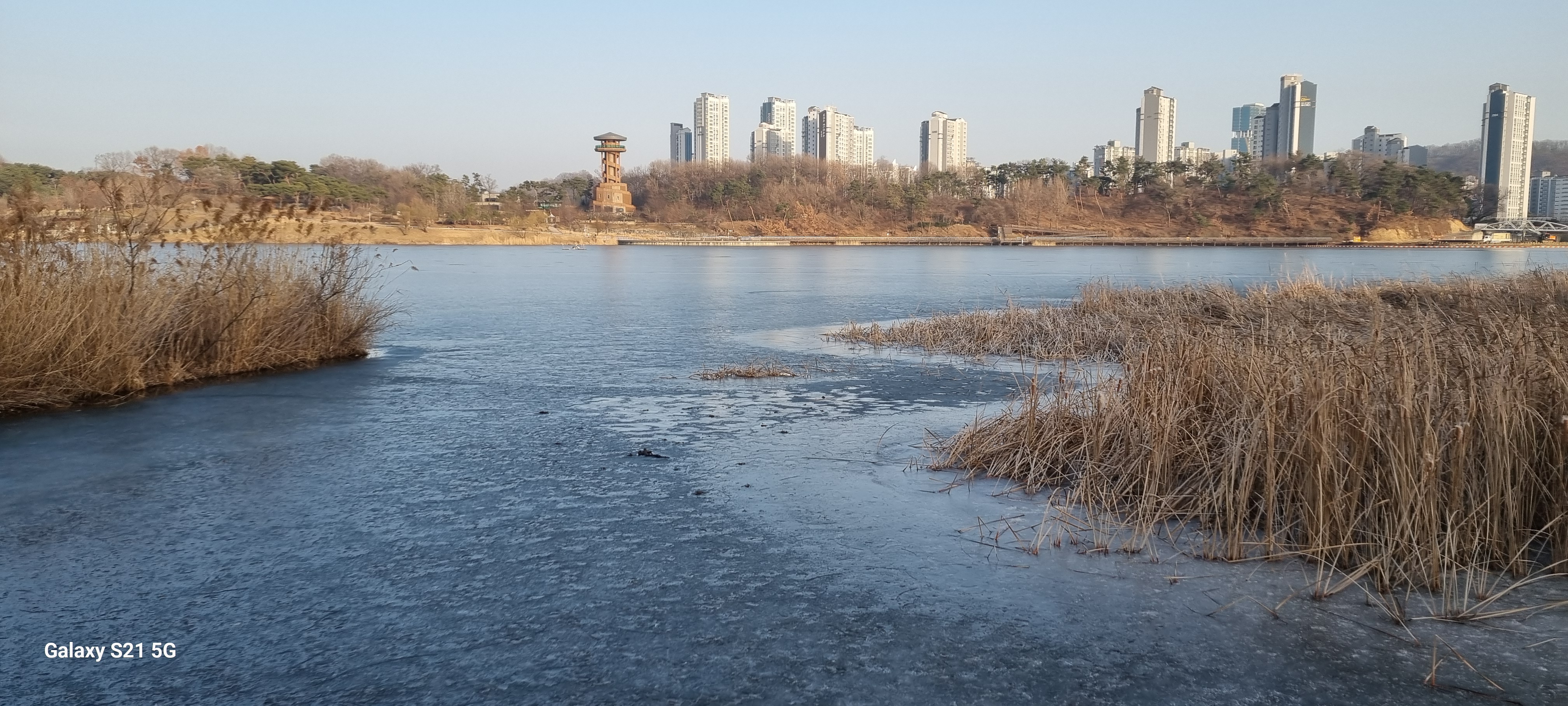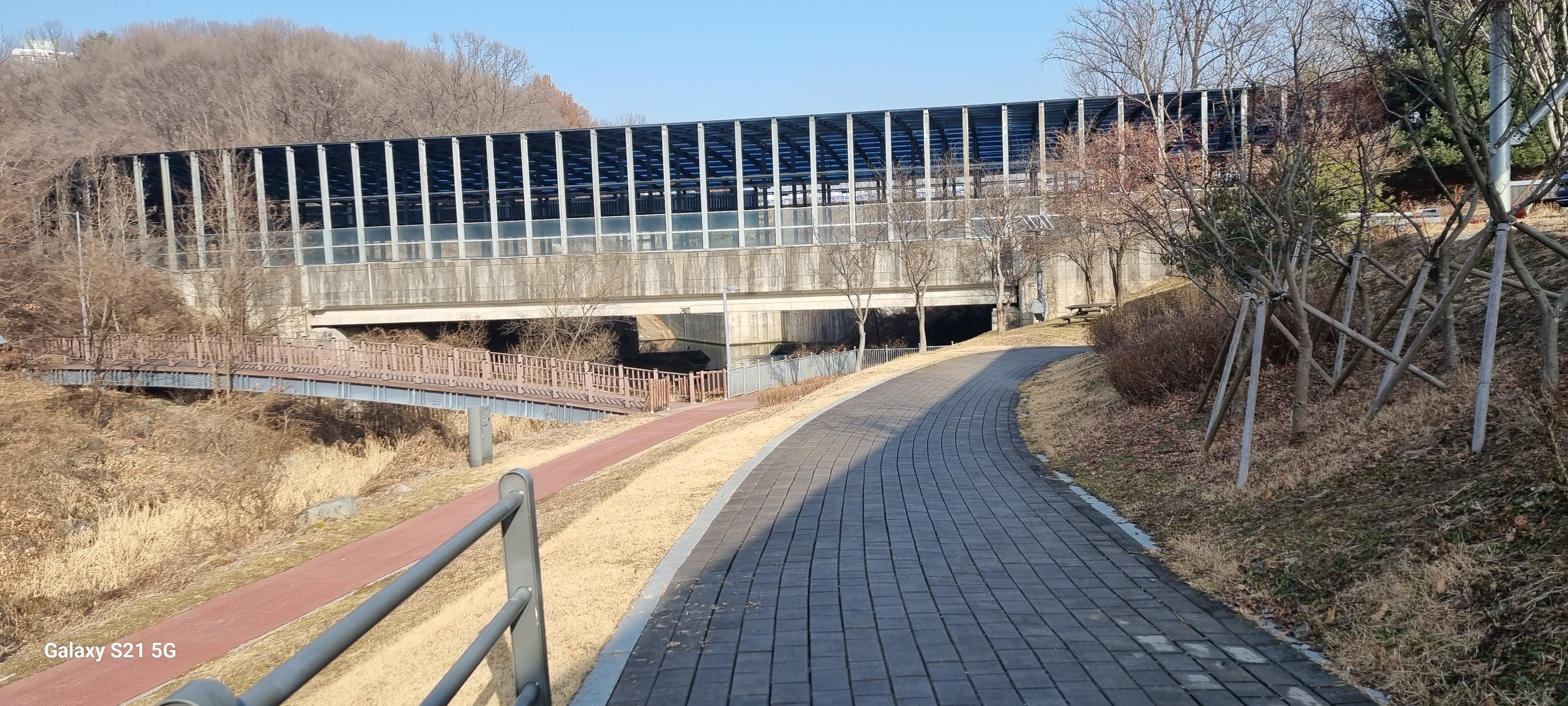 물너미분수 광장을 지나 우뚝 솟은 프라이부루크전망대를 사진 찍은 후 광교푸른숲도서관 옆길로 내려가 폭이 좁아 도랑처럼 보이는 원천리천 동안(東岸)길로 들어섰습니다. 이 길을 따라 원천리천을 거슬러 올라가다 금광지하차도에 길이 막혀 오른쪽으로 꺾어 광교체육복합센터 왼쪽에 난 길로 나지막한 언덕에 오르자 시원스레 펼쳐진 신대저수지가 보였습니다.