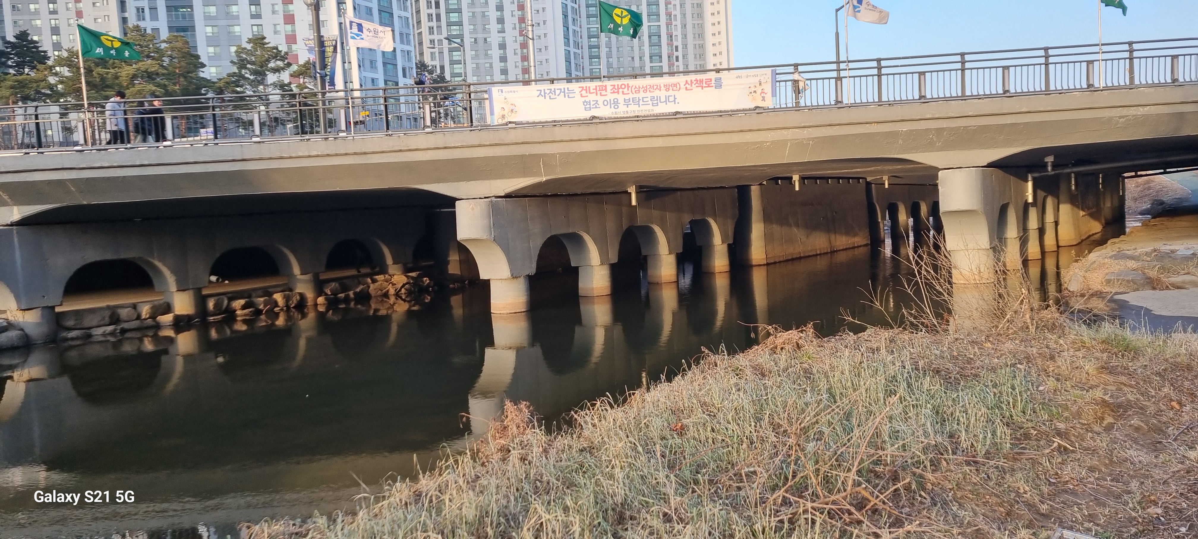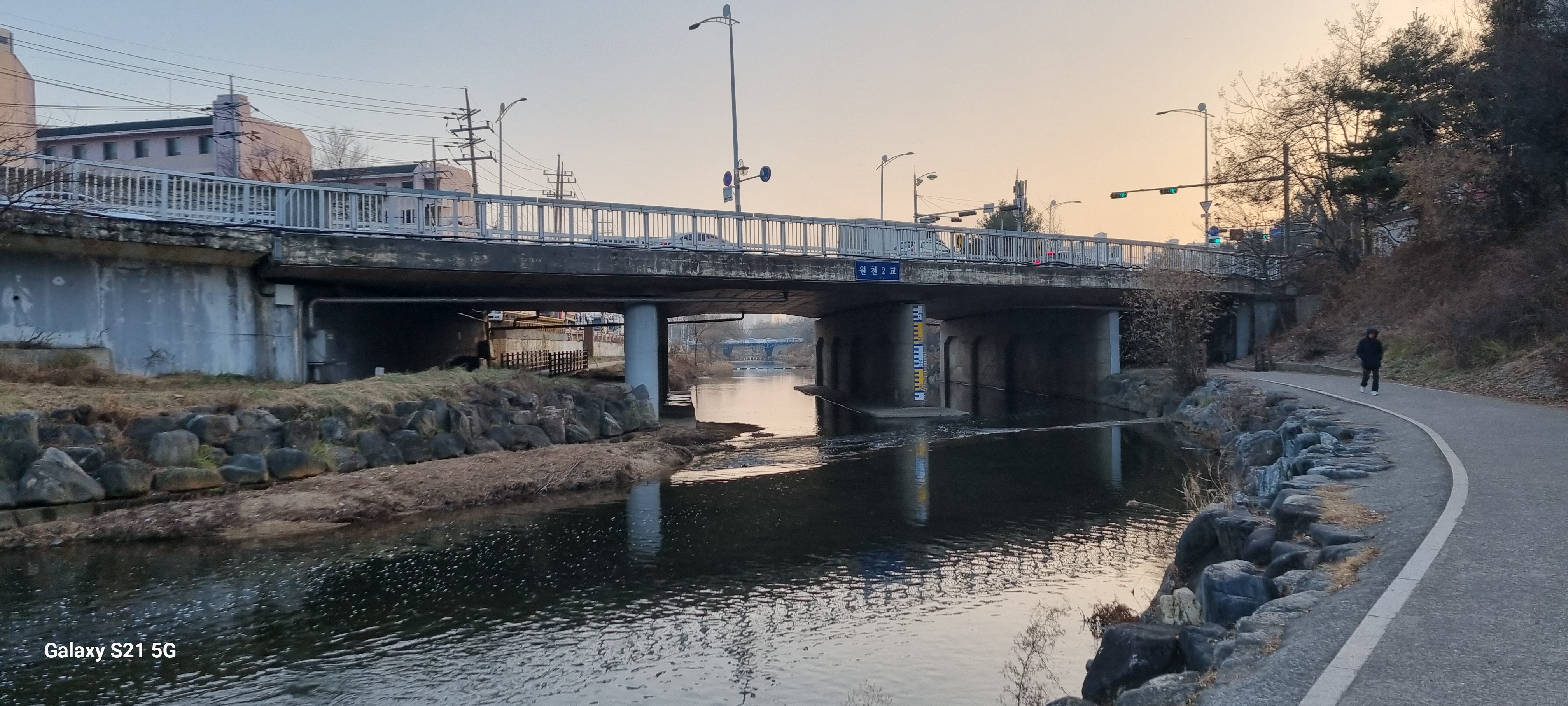 16시44분 여천/원천리천 합류점을 지났습니다. 원천호수 제방 아래로 내려가 중량교를 밑으로 지나 원천호수의 여천이 신대저수지의 원천리천으로 흘러드는 합류점에 다다랐습니다. 여기서부터 매탄권선역까지는 원천리천을 따라 걸었습니다. 원천교를 지나 건넌 다리는 먼내보도교로, 이 다리의 이름 ‘먼내’는 원천(遠川)의 우리 말인 ‘먼내’에서 따온 것입니다. 산드레미교와 원천1교를 거쳐 원천2교를 지나자 징검다리 아래 설치된 돌계단이 보였습니다. 이 돌계단을 따라 흘러 내려가는 원천리천의 물소리가 정감있게 들렸습니다.