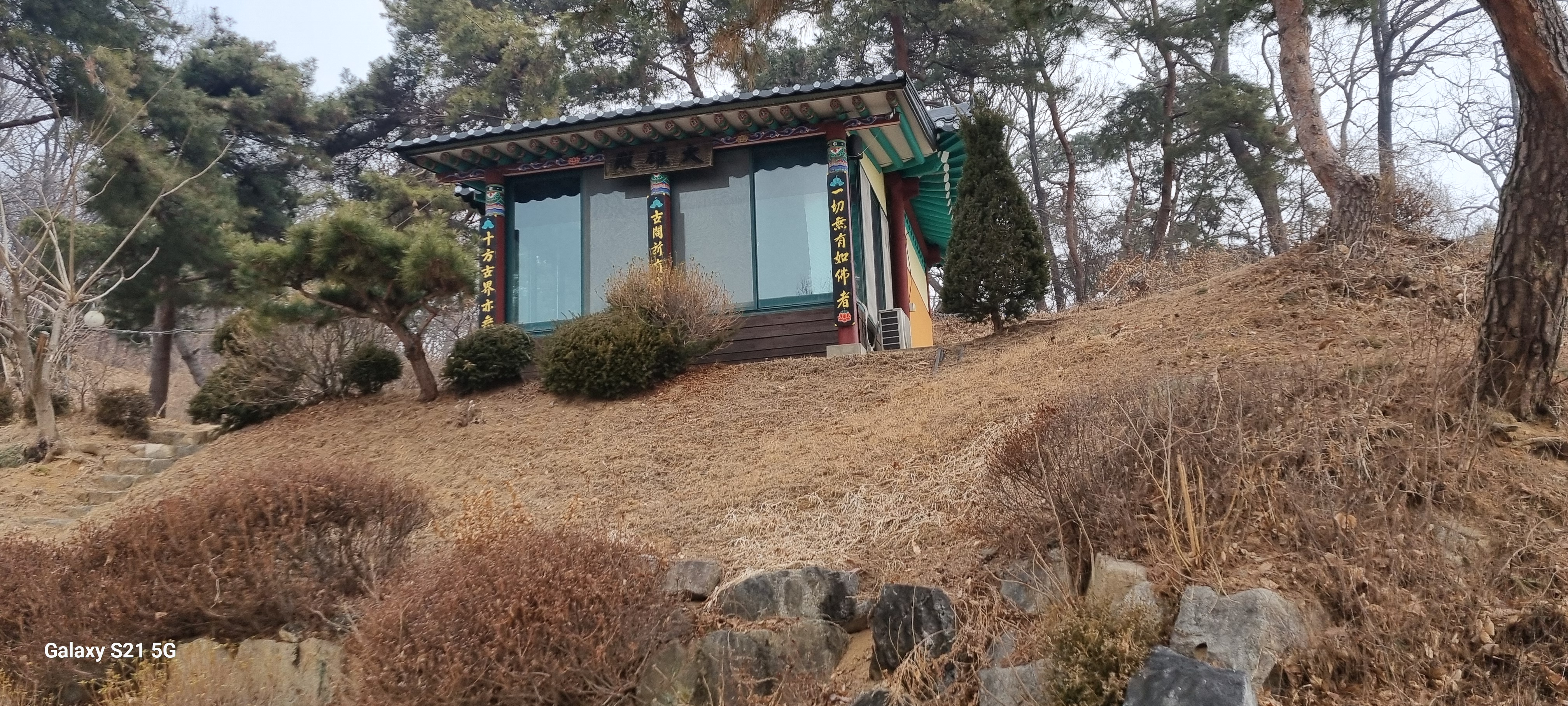 12시5분 장명교를 건넜습니다. 다리 건너 사거리에서 계장천 좌안길을 따라 걷다가 한강 좌안의 제방길로 다시 들어섰습니다. 한나절 내내 구름이 잔뜩 끼어 햇빛을 보지 못한채 강물만 보자 저도 모르게 우울한 느낌이 들었습니다, 강 건너 길쭉한 고구마 모양의 당낭리섬과 북쪽 끝의 이포교가 한눈에 잡혔습니다. 제방길이 끝나는 곳에서 계단길을 올라 강애산에 자리한 삼신당을 탐방했습니다.