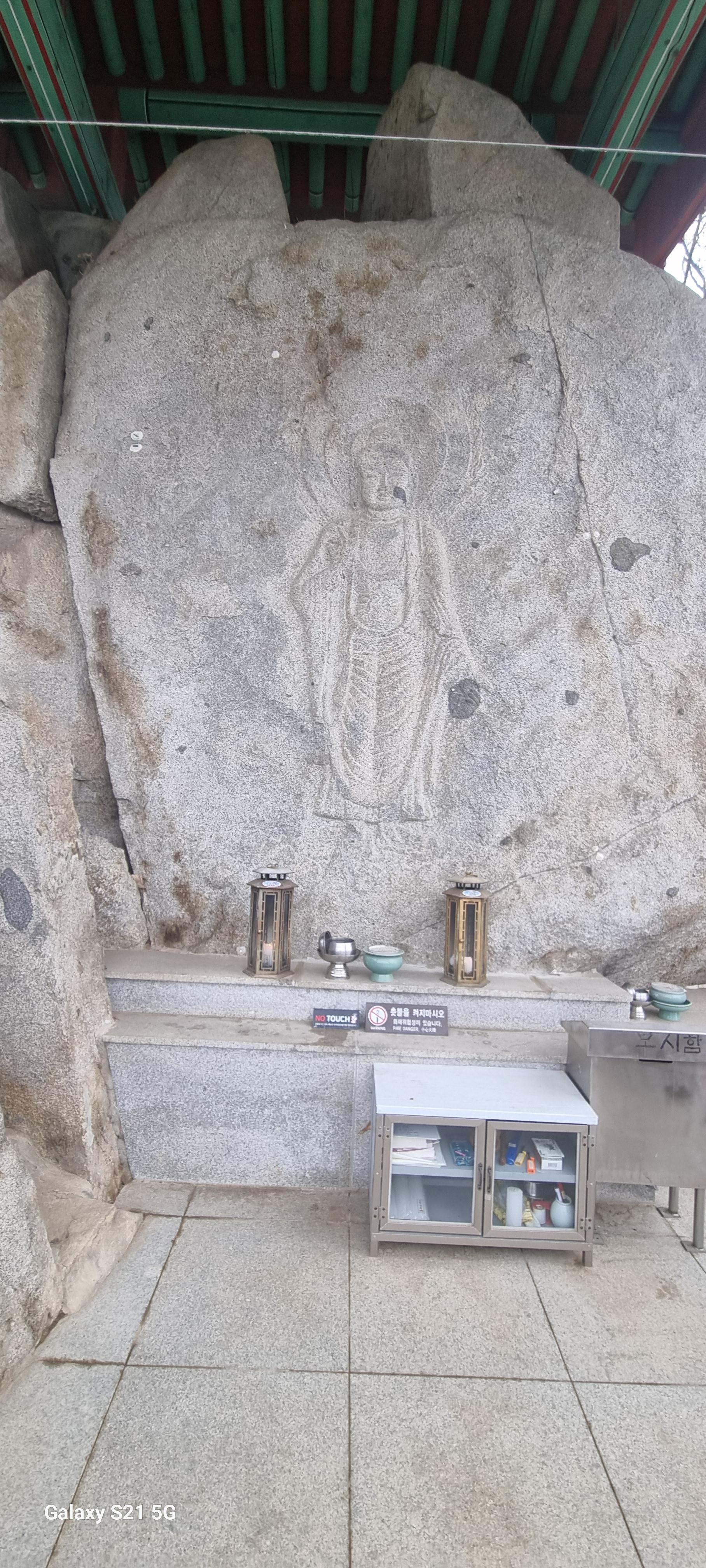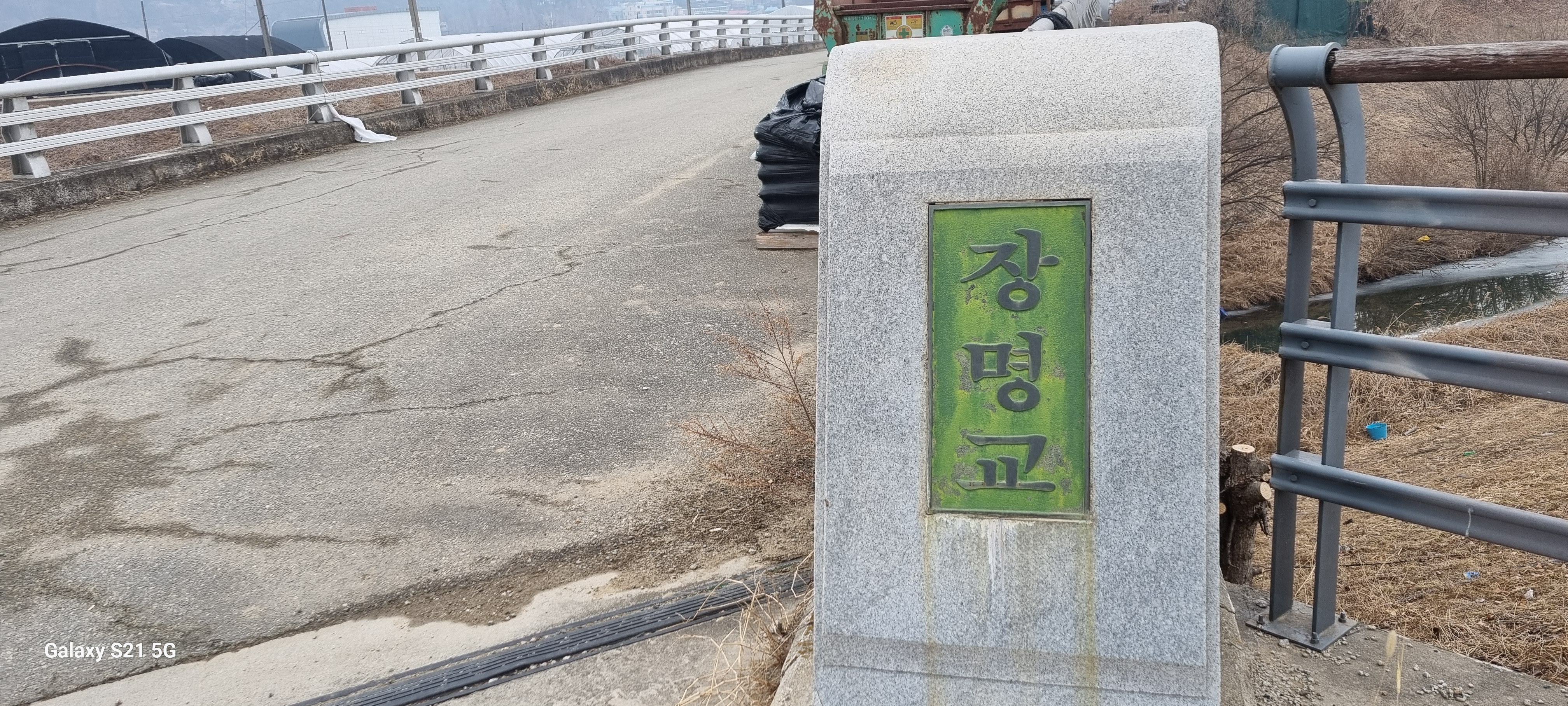 10시27분 상백교를 건넜습니다. 감동골부처울습지를 지나 복하천 위에 놓인 상백교를 건너 복대사거리에 다다랐습니다. 이 사거리에서 오른쪽으로 꺾어 복하천 좌안 길을 따라 걸으며 복하천에서 유영하는 수많은 철새들을 보았습니다. 입춘이 지난 지 며칠 되었는데 길가의 가로수 벚나무는 여전히 겨울에 머물러 우중충해 보였습니다. 계산1리정류장에서 오른쪽 동네 길로 들어서 강변에 자리한 계산리마애여래입상을 찾아갔습니다.