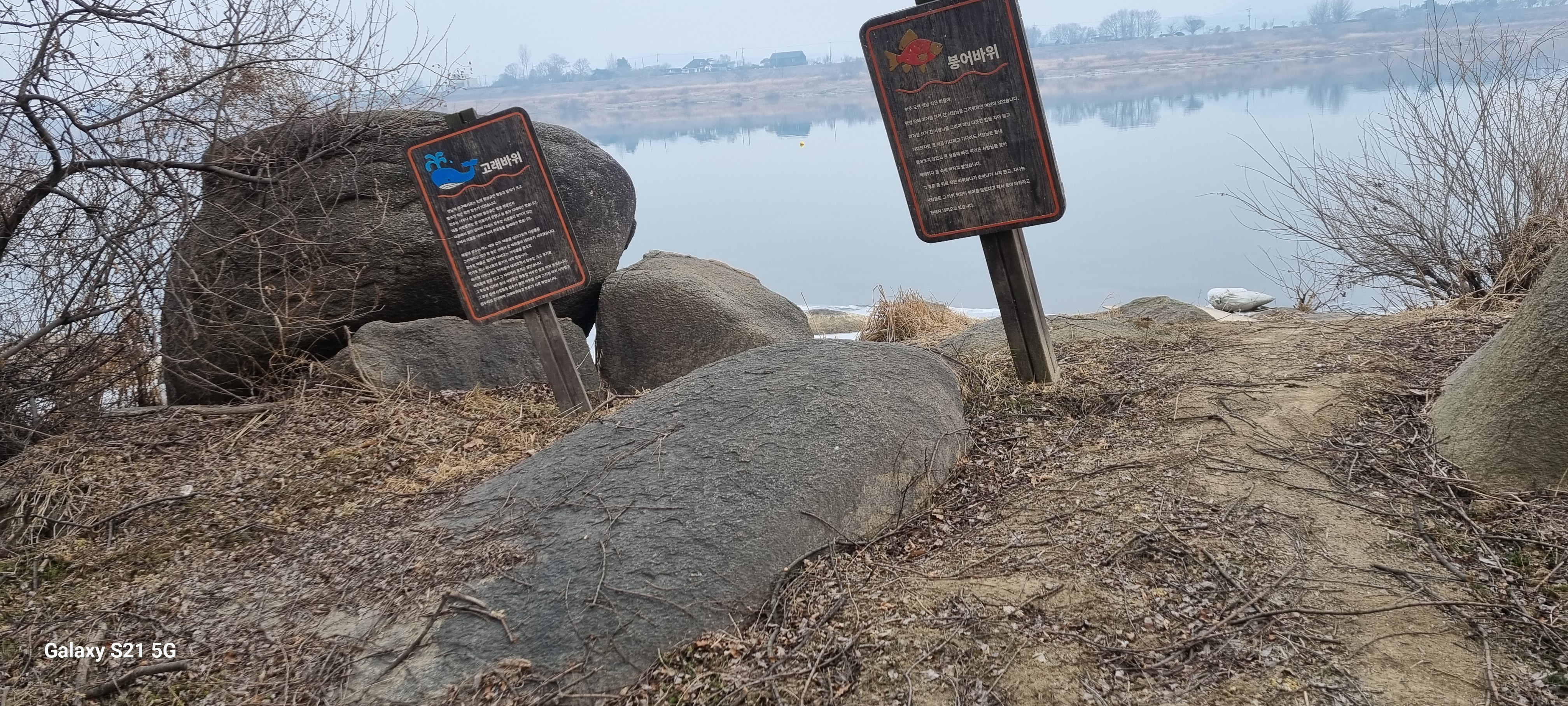 찬우물나루터를 출발해 한강 좌안의 버드나무 숲길을 지나 칼바위, 고래바위, 붕어바위가 모여 있는 이야기바위에 다다랐습니다. 산적과 싸우다 죽은 작은 백정의 칼이 바위가 되었다는 칼바위, 험상궂고 거구여서 동네사람들과 떨어져 살아야 했던 한 장수가 산 위에서 굴러떨어지는 바위가 동네를 덮치는 것을 막다가 바위에 묻혀 죽은 일이 발생했는데, 그 후 동네 사람들이 이 바위를 장수처럼 크다하여 불렀다는 고래바위, 과거시험을 보러 한양에 간 낭군을 기다리다 낭군을 찾아 한양으로 떠난 부인이 물에 빠져 죽은 후 그 자리에서 물 위로 솟아난 바위를 일러 칭했다는 붕어바위들은 그리 크지 않아 전설의 무게를 감당하기가 힘들었을 것 같습니다.