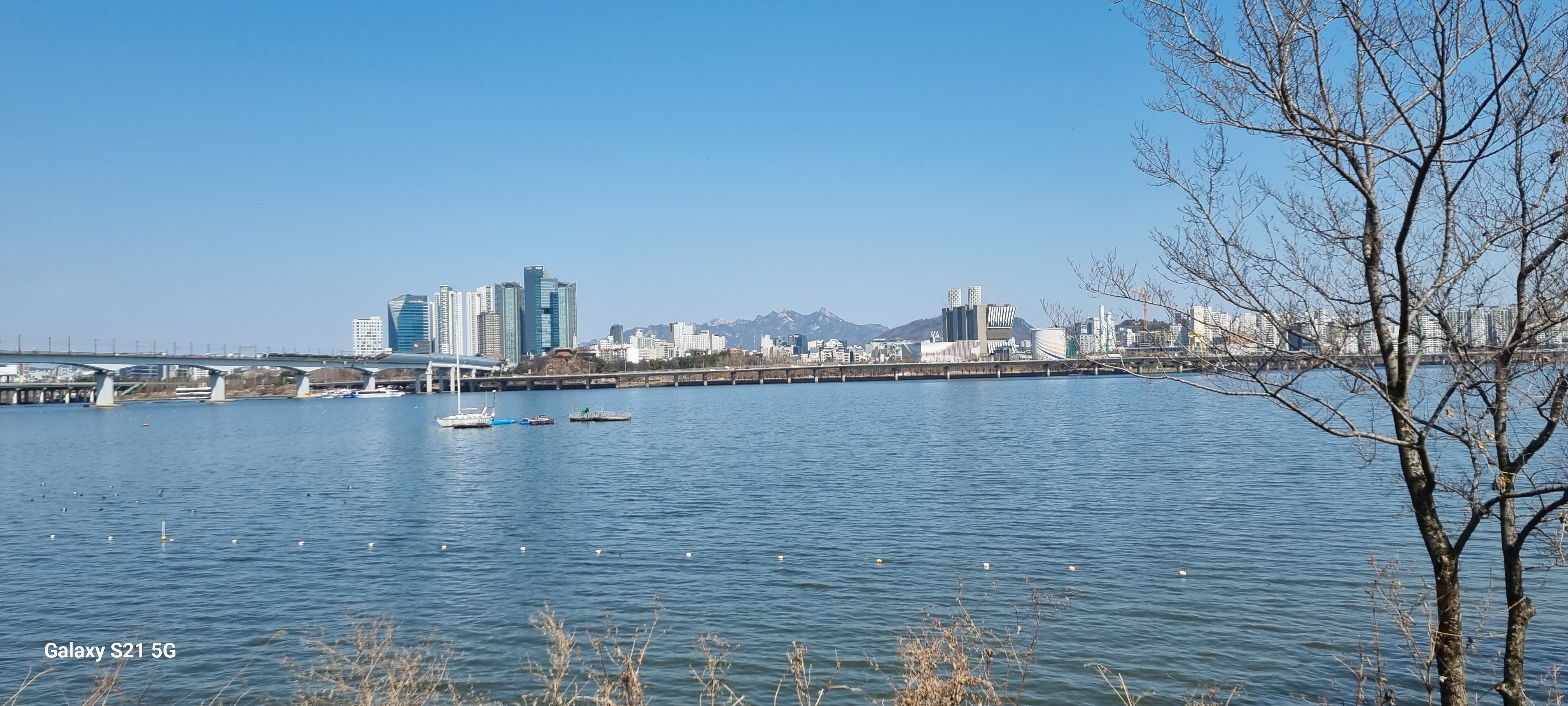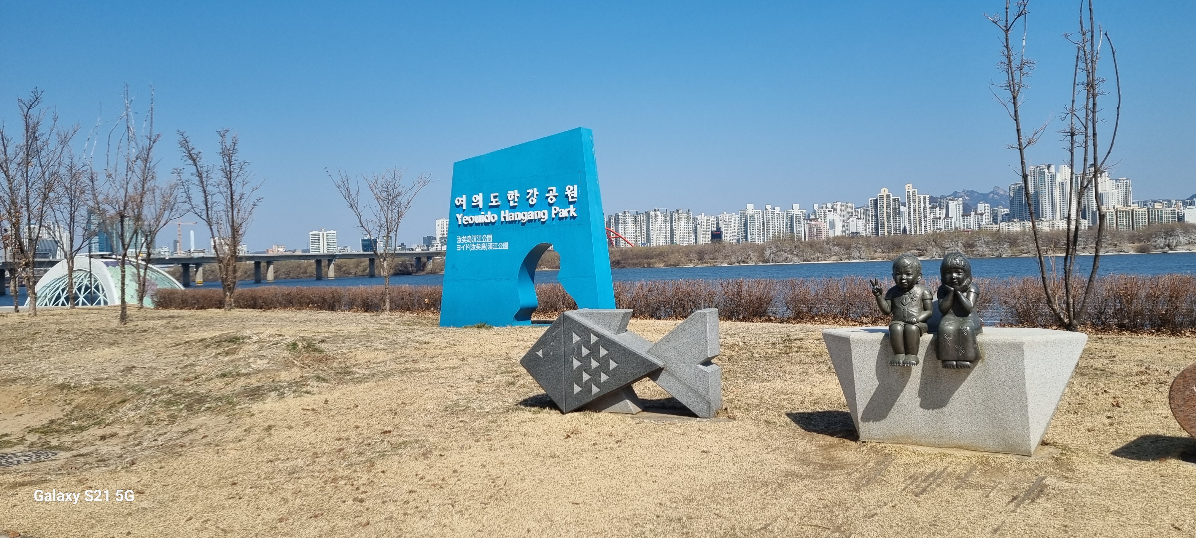 여의도한강공원의 귀여운 두 어린이 조각상을 사진 찍고서 이번 탐방의 끝점인 방화대교로 향했습니다. 마포대교 아래를 출발해 서강대교를 지나자 국회의사당의 돔 지붕이 보였습니다. 여의도순환구조대 건물과 해양경찰 건물을 차례로 지나 버드나무 가지들이 연두색을 띠어 봄기운이 감도는 강변 길을 따라 걸었습니다. 강 건너 북쪽 멀리 북한산의 비봉이 보일 만큼 쾌청해 강북의 수변 풍경을 조망하기에 좋았습니다. 바다의 만(bay)처럼 움푹 파진 곳에 정박해 있는 요트들을 보노라니 한강은 윈드서핑뿐만 아니라 요트의 요람처가 될 수 있겠다는 생각이 들었습니다. 국회의사당의 바로 뒤를 지나 한강하구 전방36Km 지점에 이르자 당산철교가 바로 앞에 보였습니다.