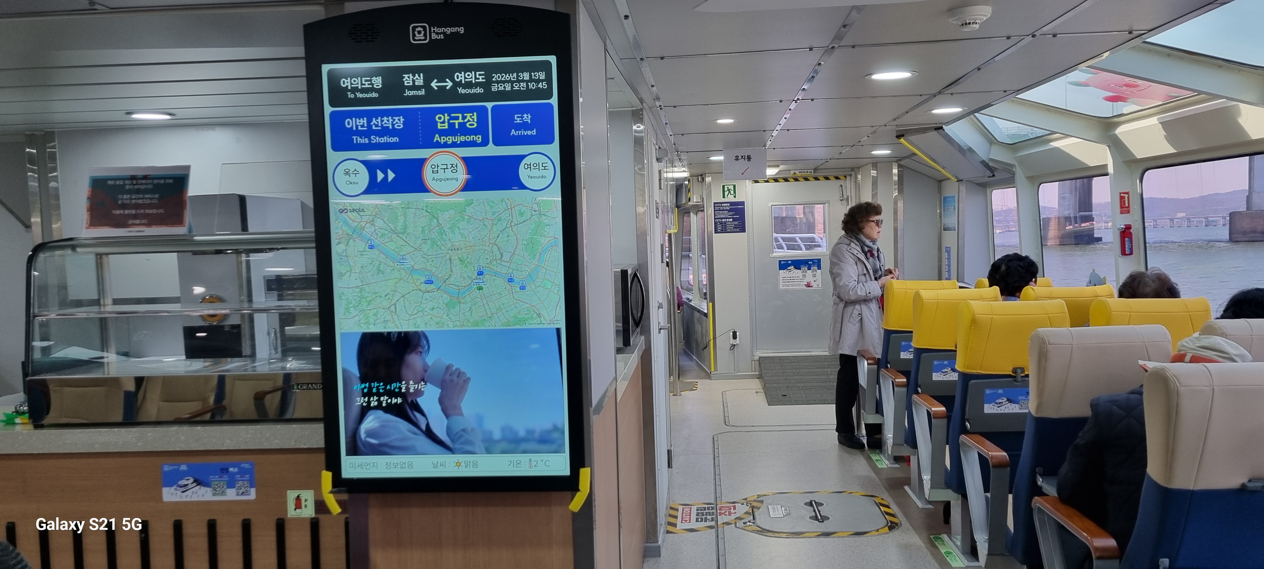 선착장 안으로 들어가 한강버스를 기다리는 동안 조금 어지러웠던 것은 선착장 건물이 강물위에 떠 있어 그랬던 것 같습니다. 10분가량 기다려 10시41분에 옥수선착장을 출발하는 여의도행 한강버스에 승선했습니다. 승선정원이 199명인 제법 큰 한강버스가 압구정역선착장을 들러 여의도선착장에 다다르는데 40분 정도 걸렸습니다.