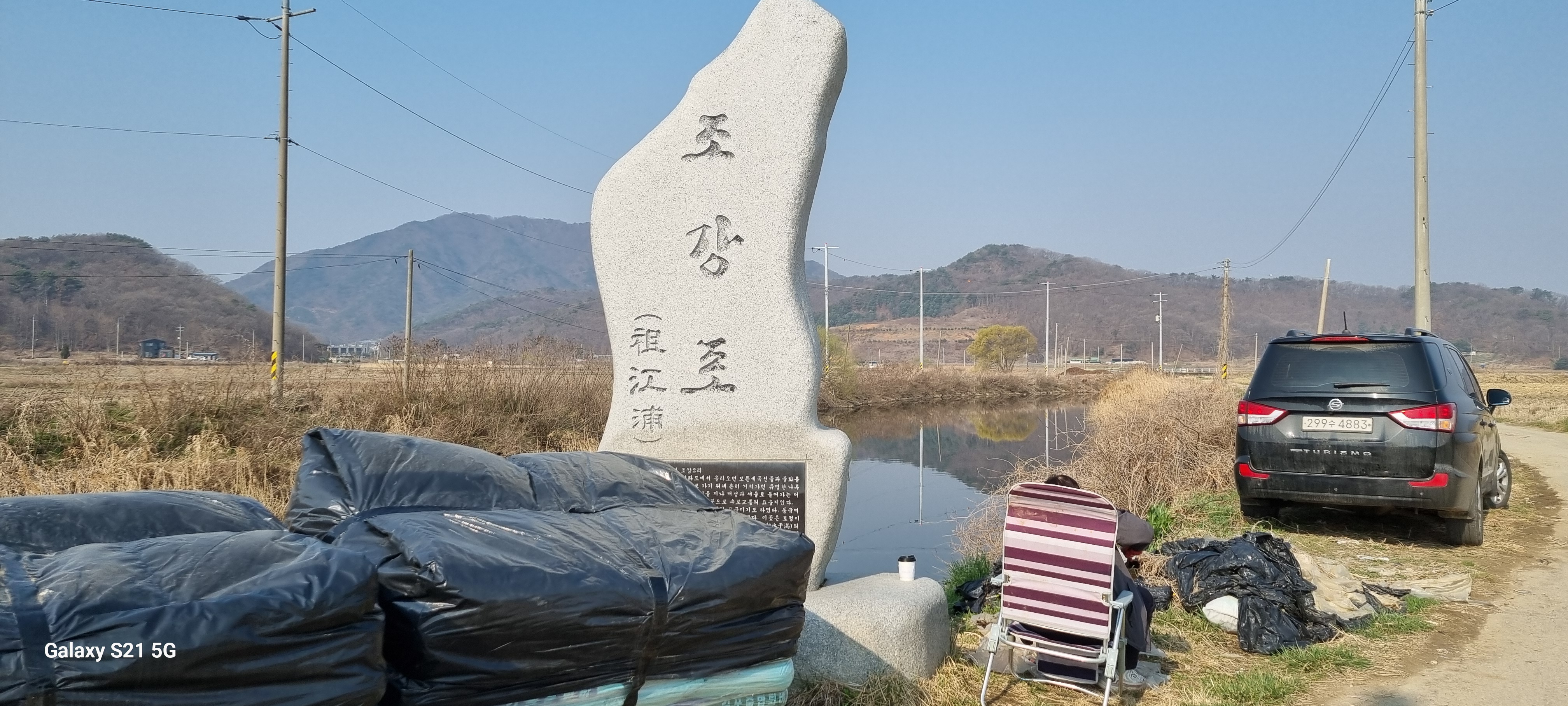 작은 마을을 벗어나 표지비가 서 있는 조강포(祖江浦)에 다다른 시각은 9시24분입니다. 조강으로 흘러드는 개화천 우안에 세워진 ‘조강포’ 표지비는 2019년 평화누리길을 걸을 때 한 번 본 적이 있어 반가웠습니다. 표지비의 비문에 따르면 조강포는 “고려 조선시대에 올라오던 모든 세곡선들과 물화를 실은 배들이 개성과 한양으로 가기 위해 흔히 거쳐 가던 유명한 나루터”였습니다.