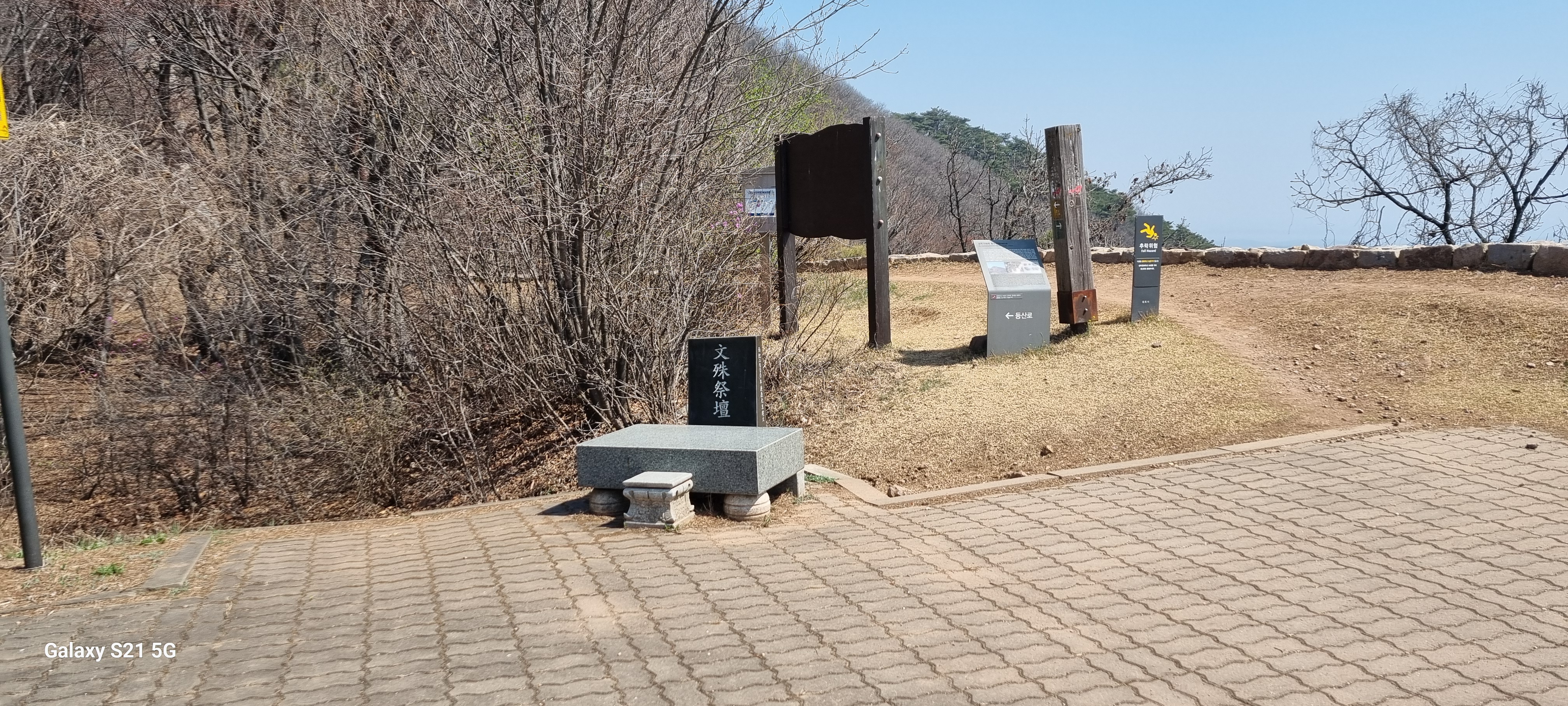 10시58분 가건물(?) 옆에 난 나무계단 길로 들어서 문수산 등산을 시작했습니다. 이내 올라선 평탄한 곳에 벤치가 놓여 있어 가져간 샌드위치를 꺼내 점심을 들었습니다. 잠시 쉬는 동안 스마트폰의 앱을 켜 이곳의 고도가 해발103m 임을 확인했습니다. 이 앱은 고도뿐만 아니라 현주소 및 위도와 경도를 알려주어 산 속에서 길을 잃어 구조를 요청할 때 매우 유용할 것 같습니다.